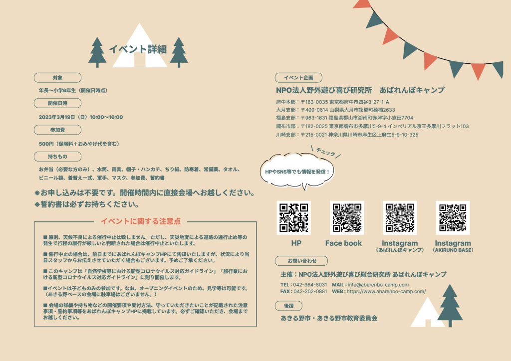 イベント掲載ページ:デイキャンプ IN THE AKIRUNO BASE