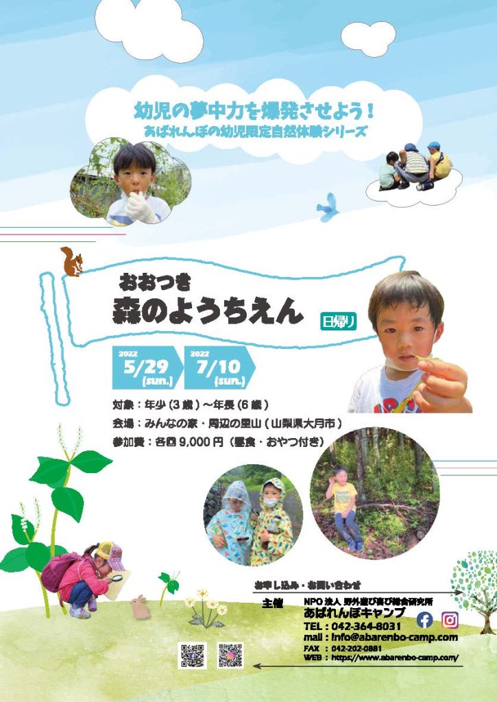 幼児限定日帰りキャンプ「おおつき森のようちえん」。親元を初めて離れるお子様にオススメのプログラム!「お泊まりに行かせるのはまだ不安…」という親御さん、まずは日帰りキャンプから始めてみませんか?