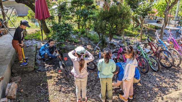 チャレンジ1クールメンバーはお昼ご飯を食べた後、明日からのMTB遠征に向けて装備の確認やMTBのフィッティングを行いました^ ^