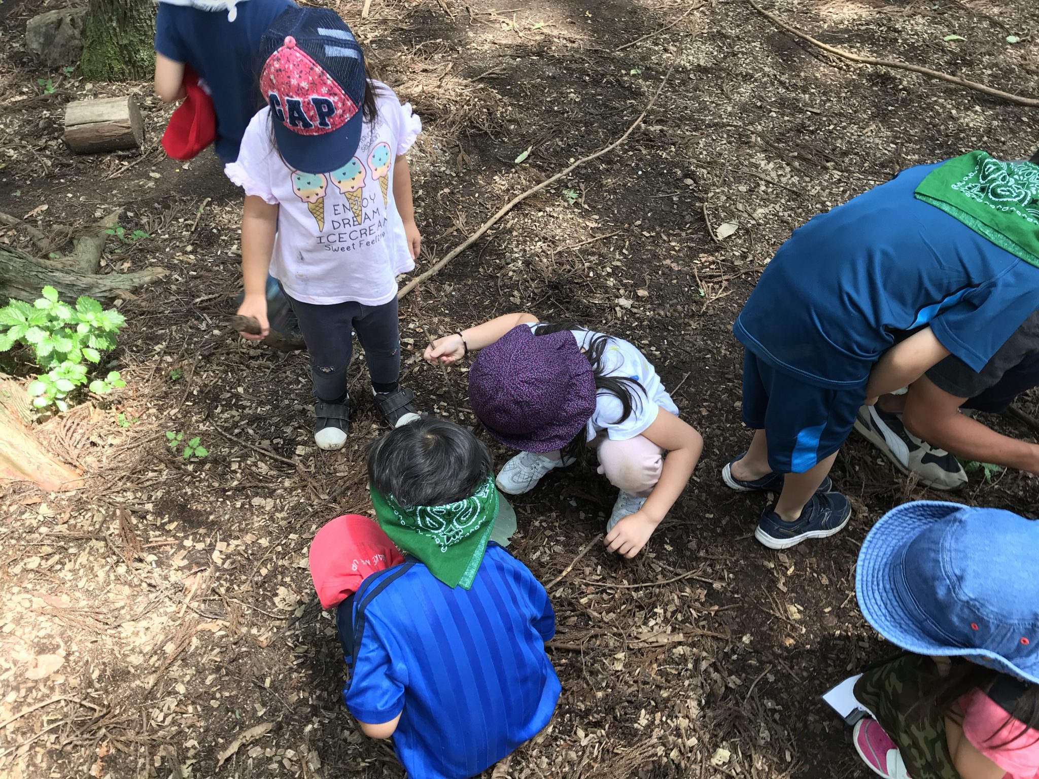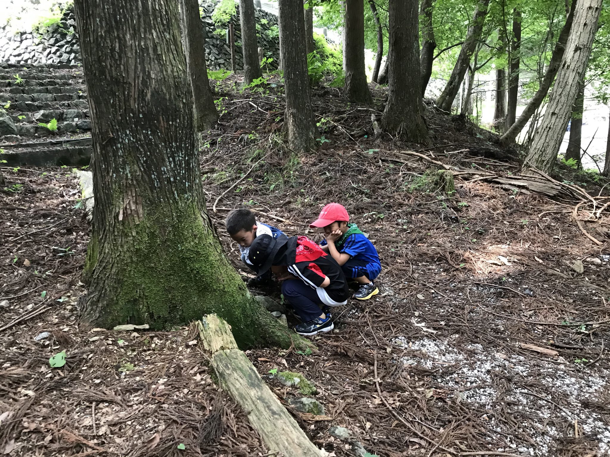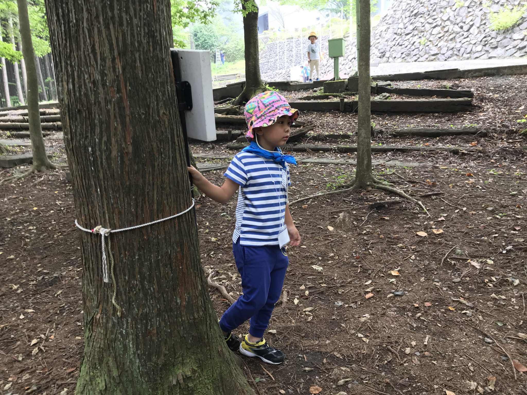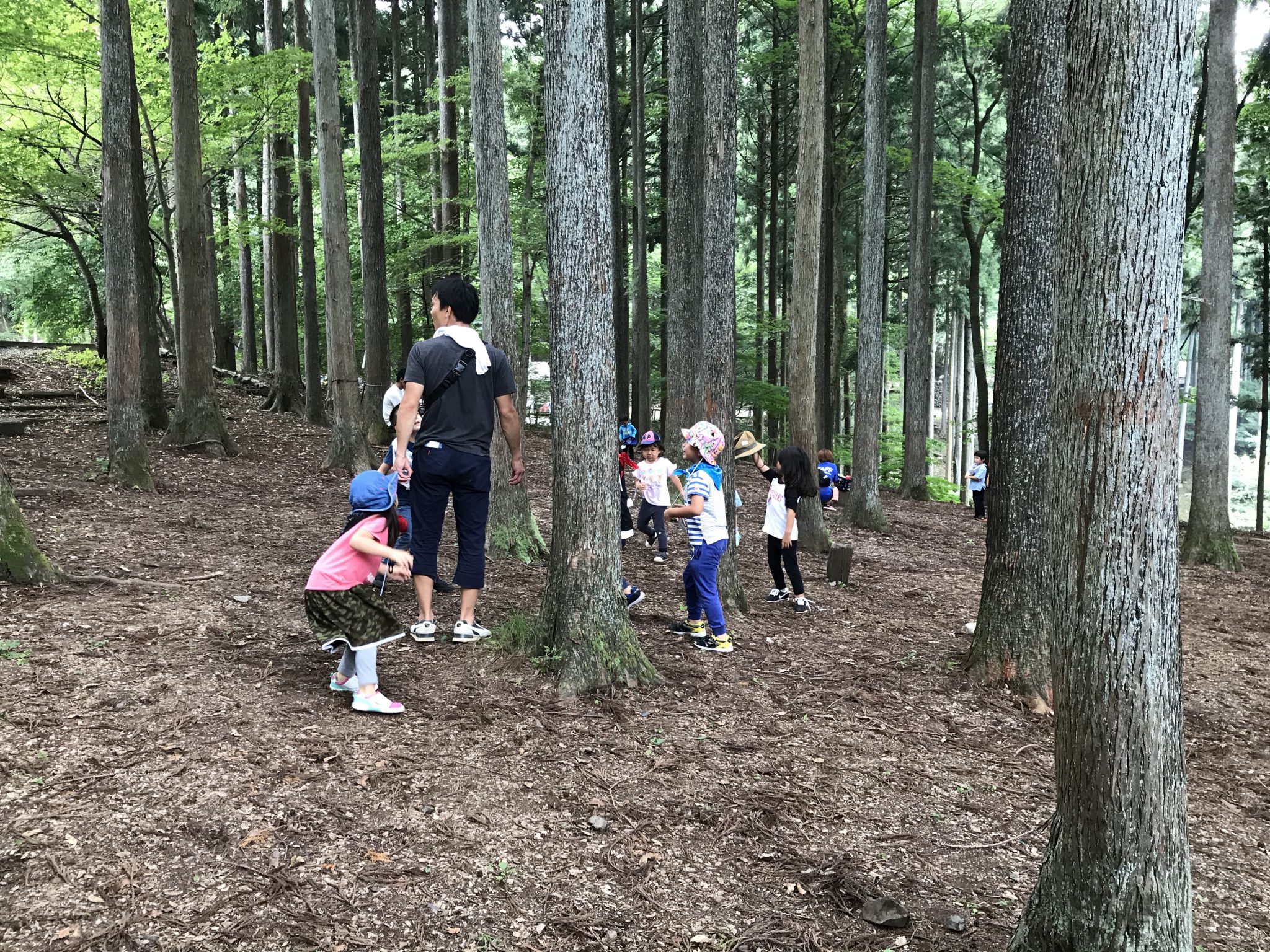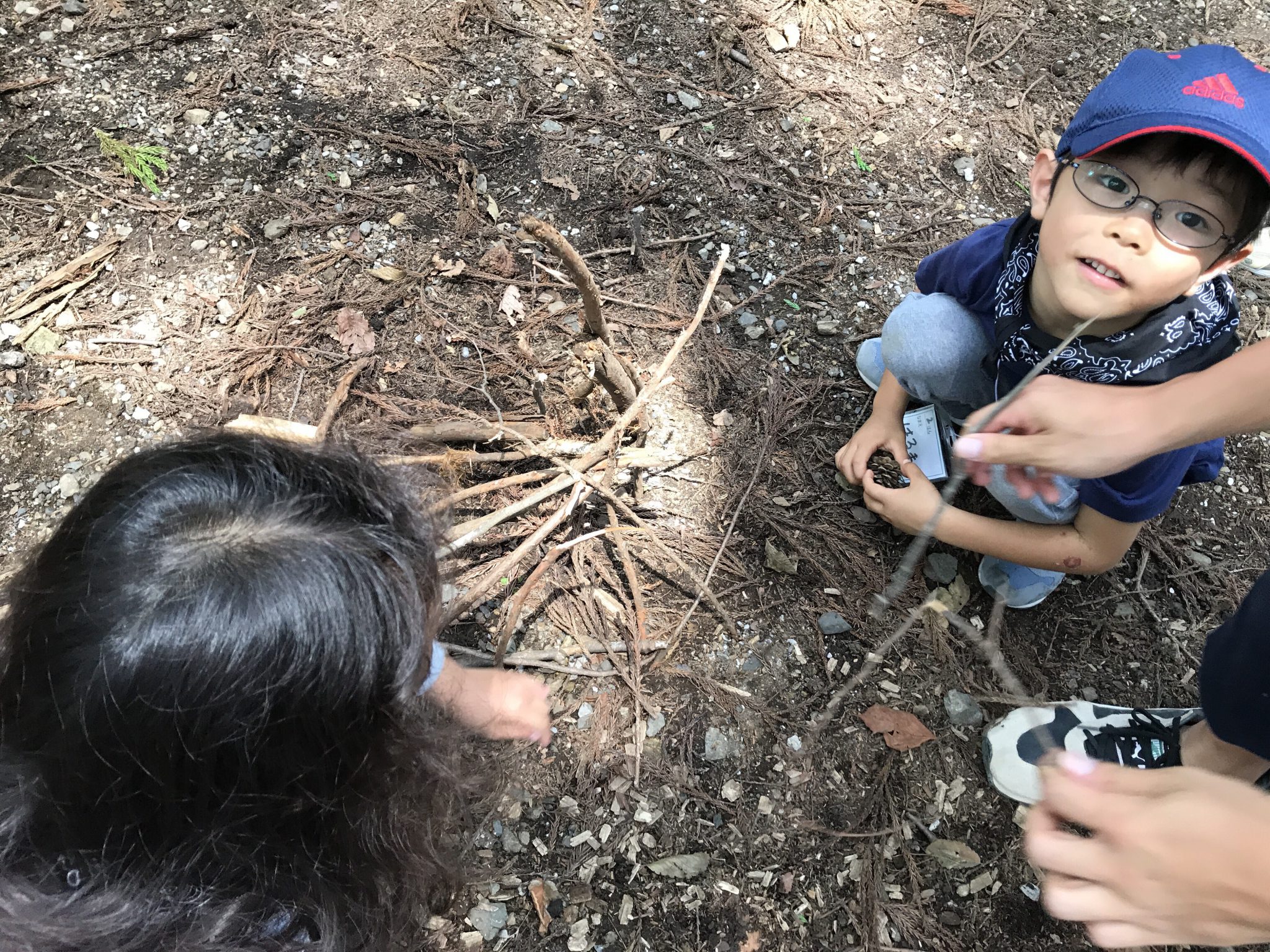 夏ちびメンバーはクラフトを作り終わり、外に出て自由時間を過ごしています。 名栗げんきプラザの小さな森で生き物を探したり、木の後ろに隠れたり、木の枝を組んでみたり、いろんな遊びをしています!