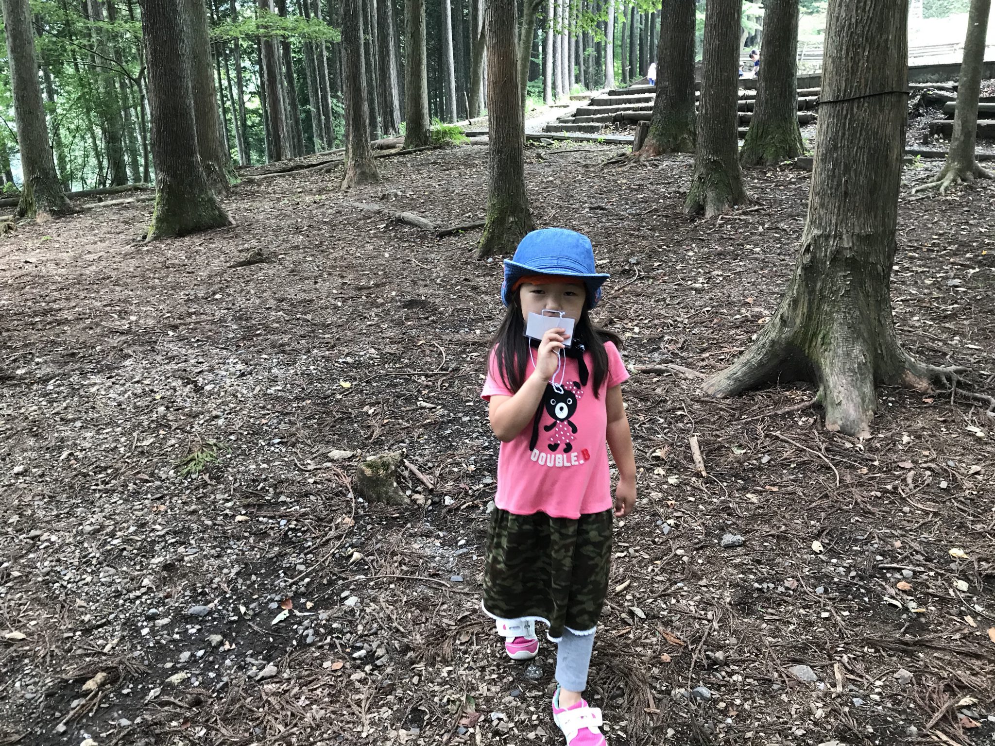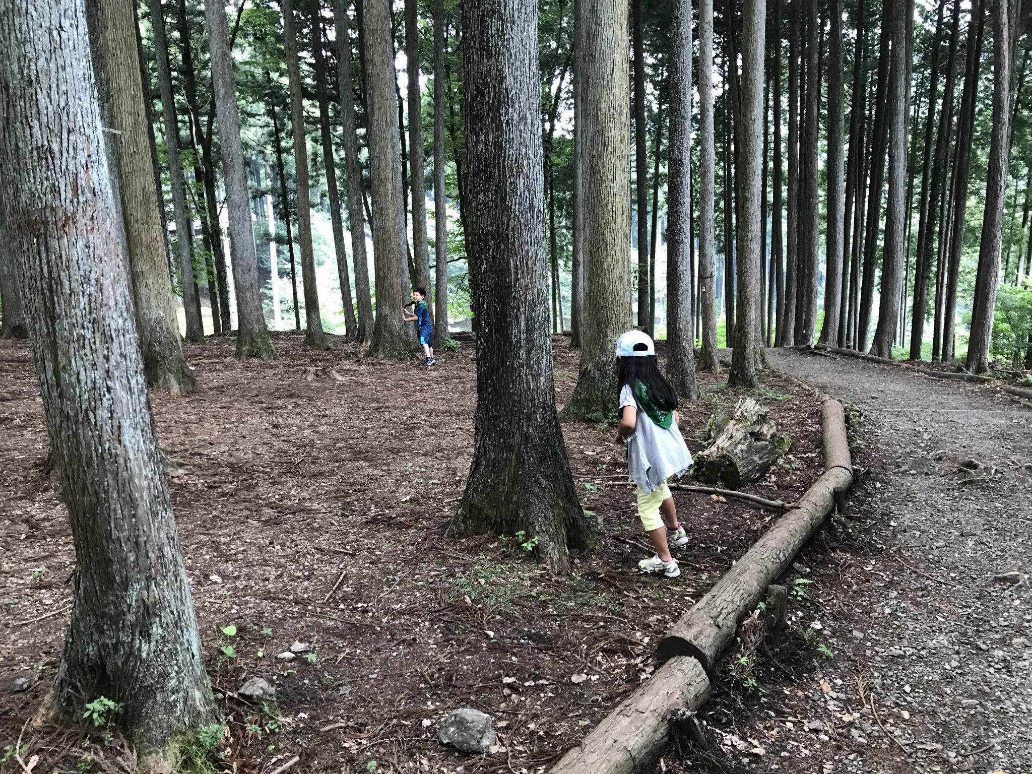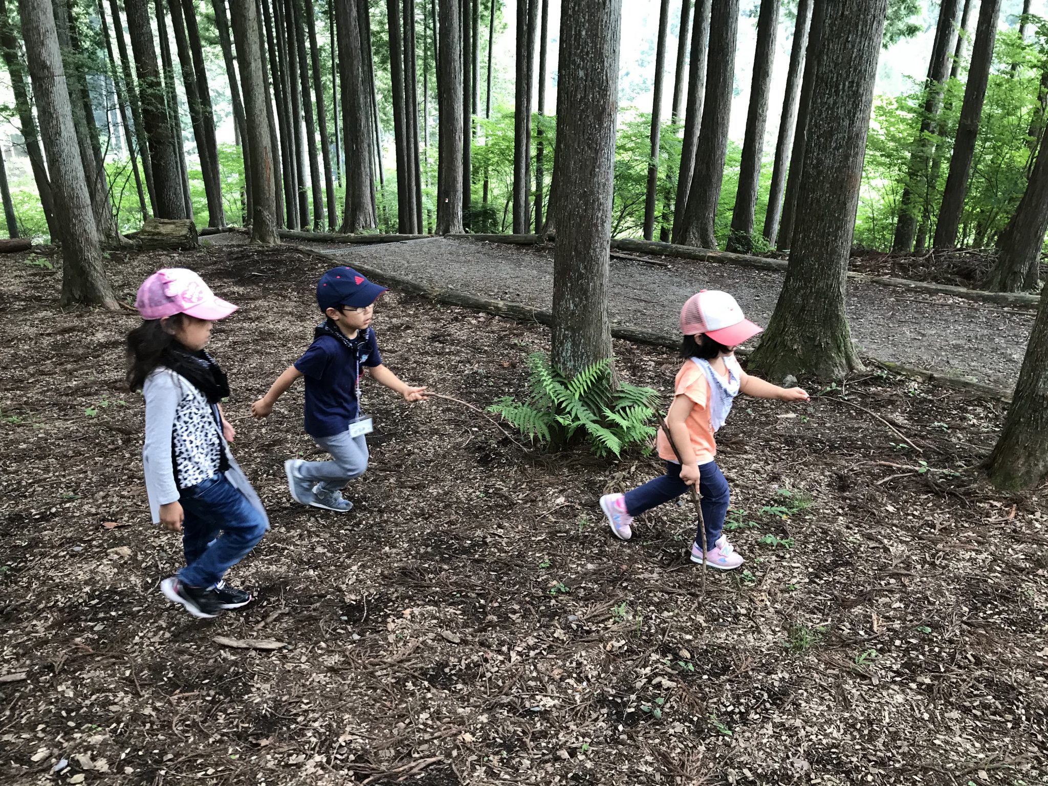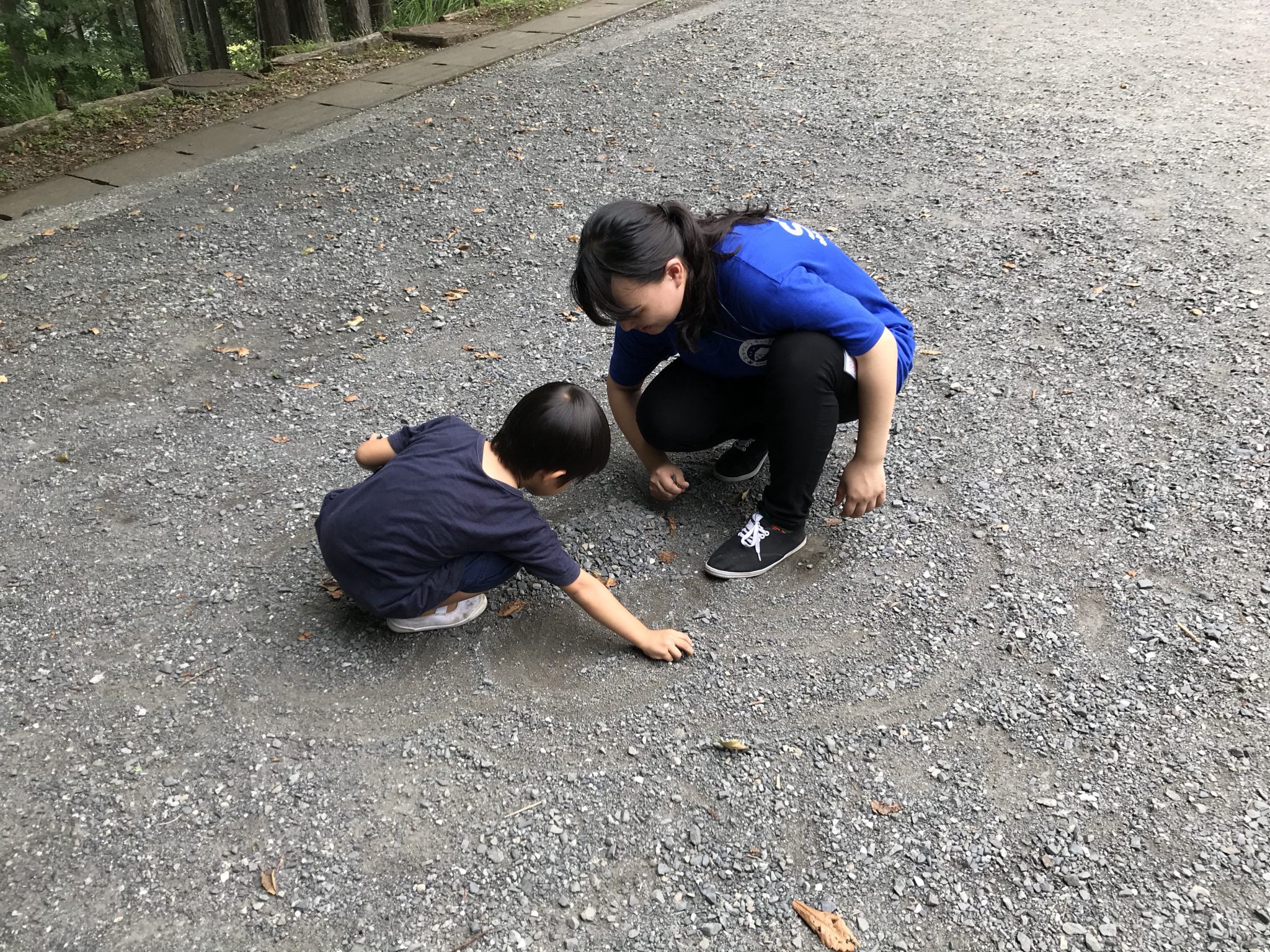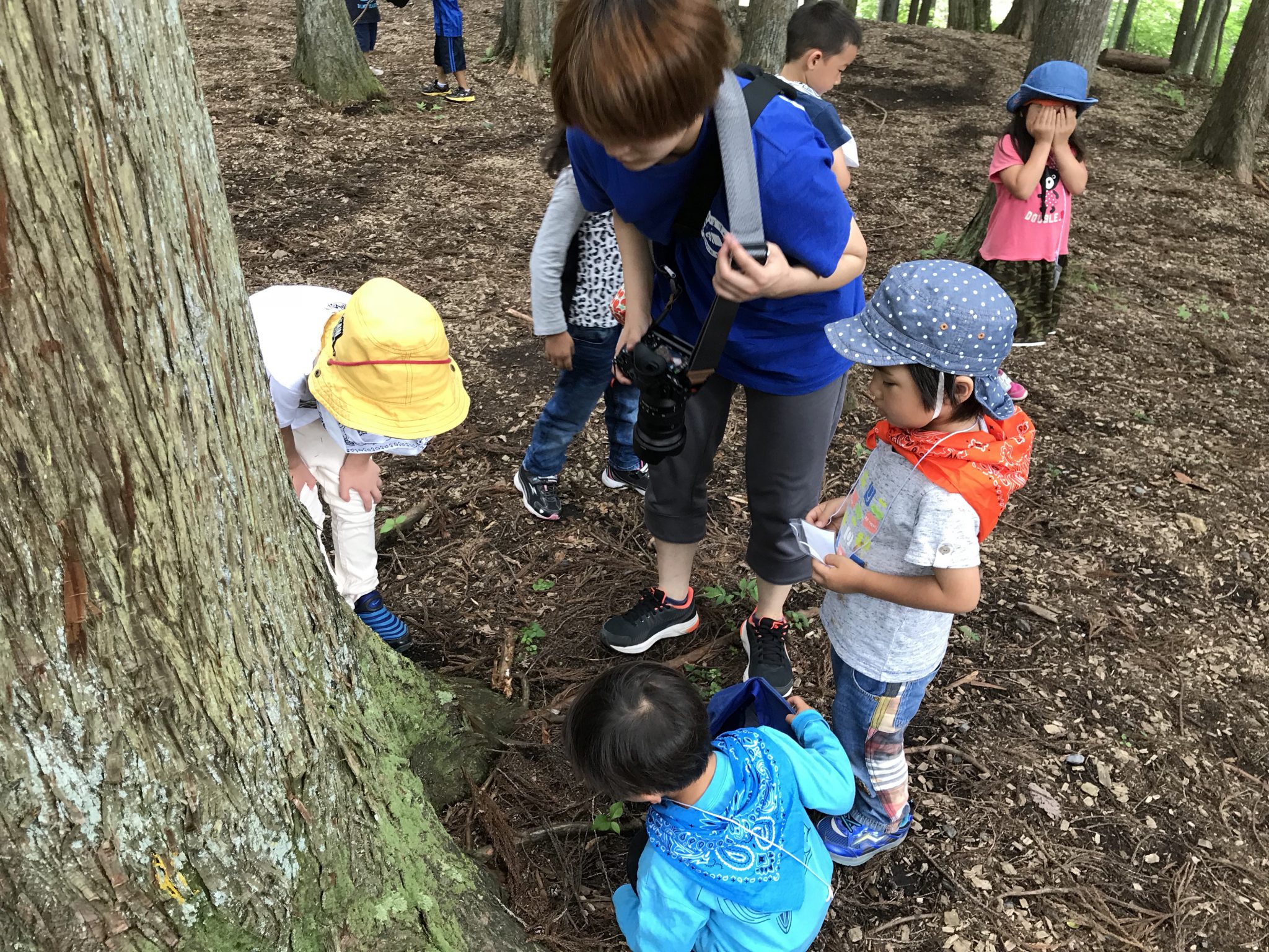夏ちびメンバーはクラフトを作り終わり、外に出て自由時間を過ごしています。 名栗げんきプラザの小さな森で生き物を探したり、木の後ろに隠れたり、木の枝を組んでみたり、いろんな遊びをしています!
