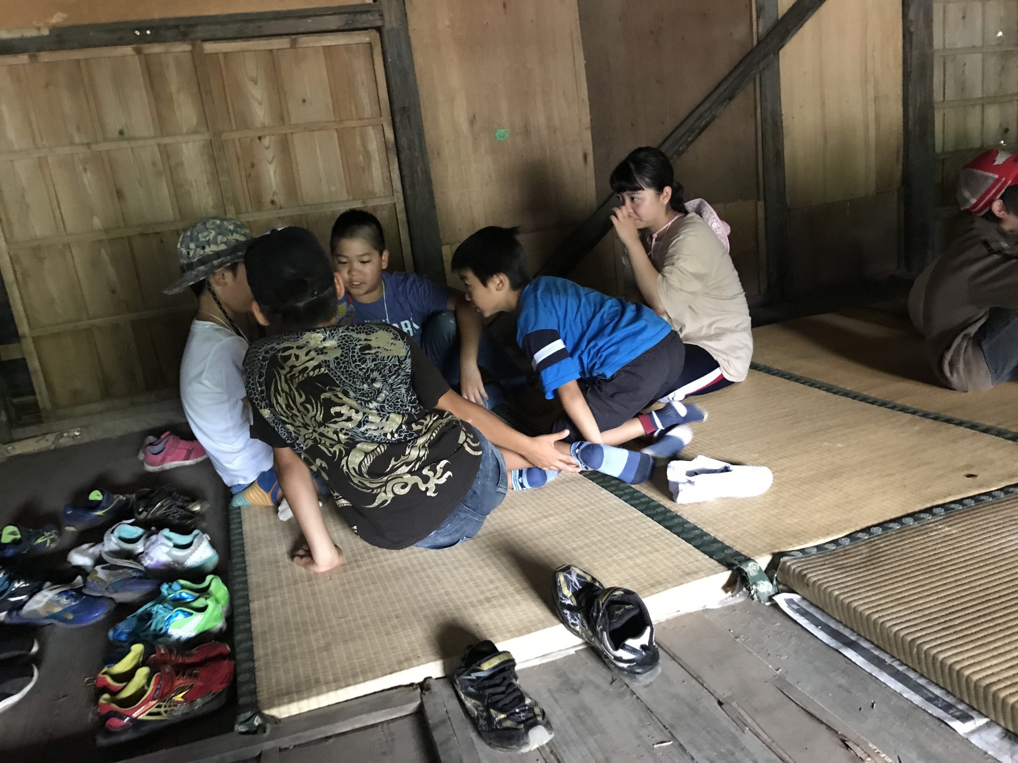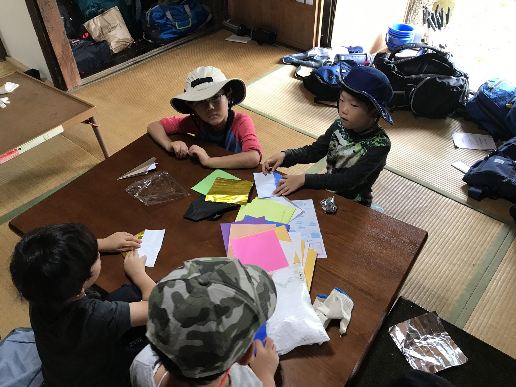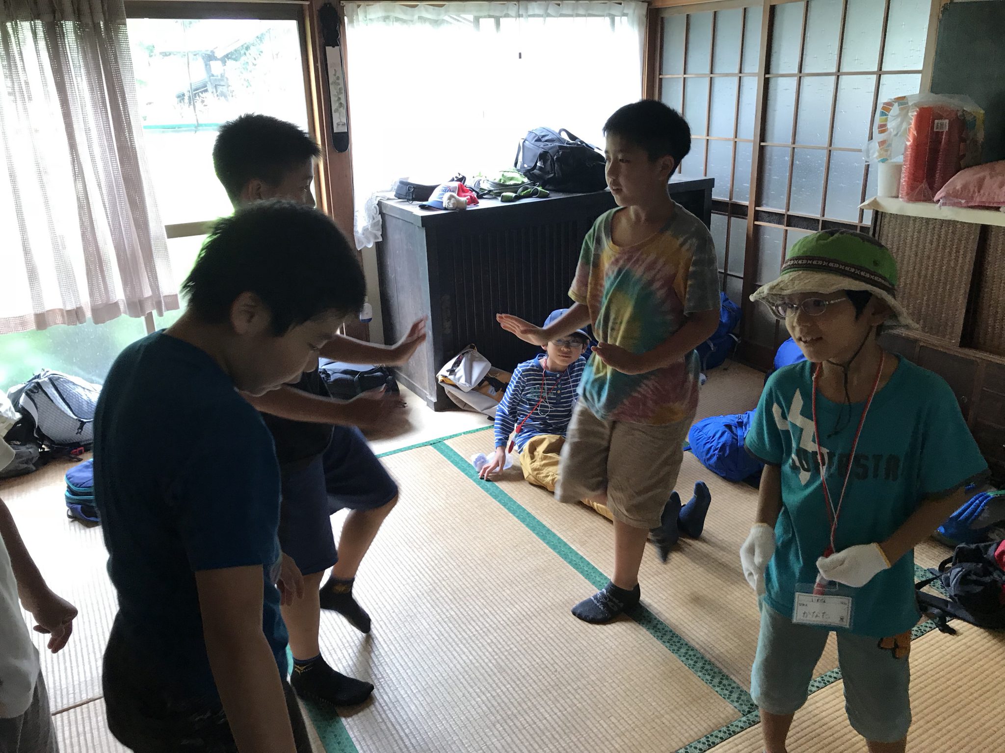里山キャンプメンバーは、朝ごはんの片付けを済ませ、水着をカバンにしまい、自由時間を過ごしています。 室内でみんなで遊んでいます。