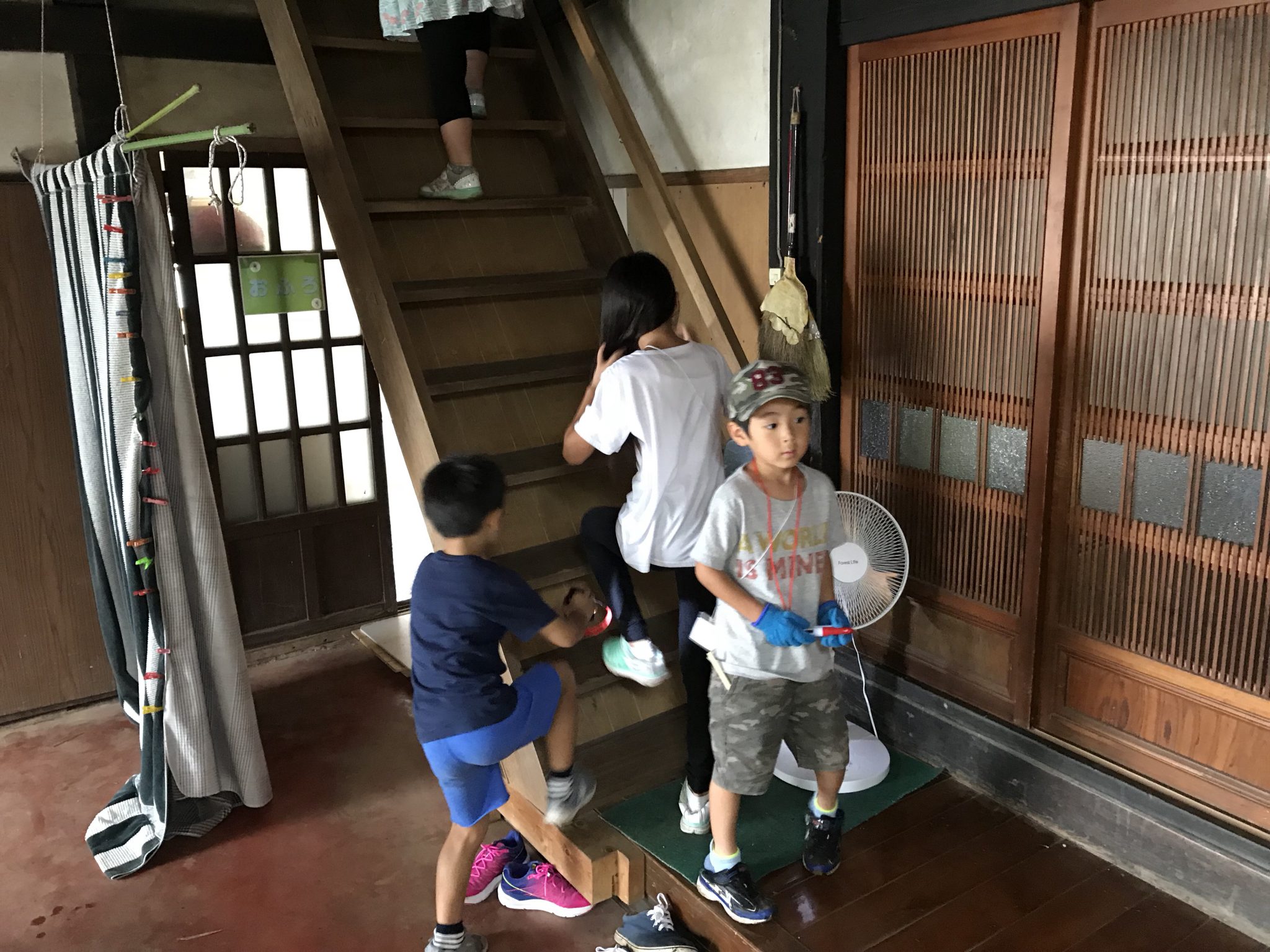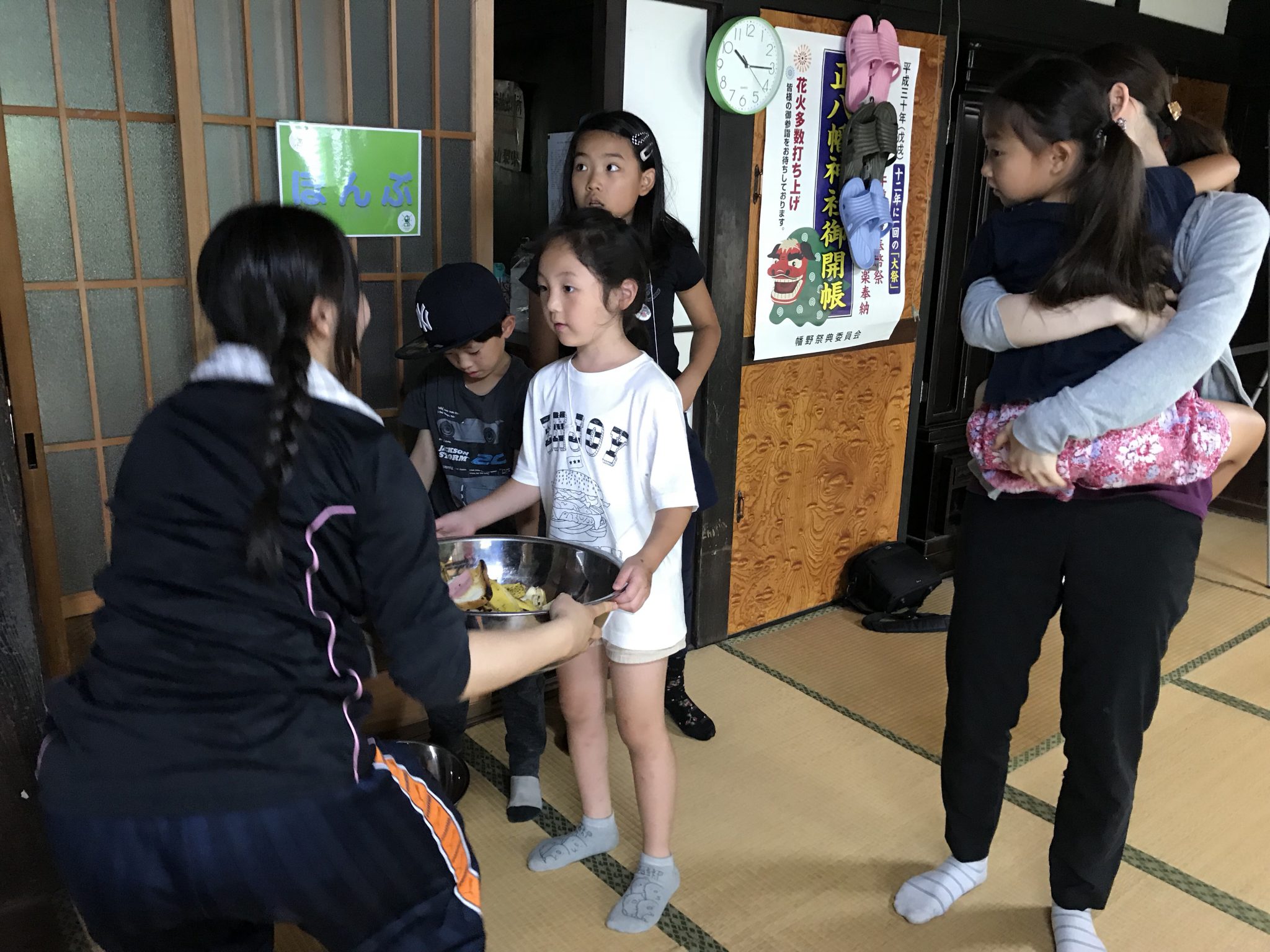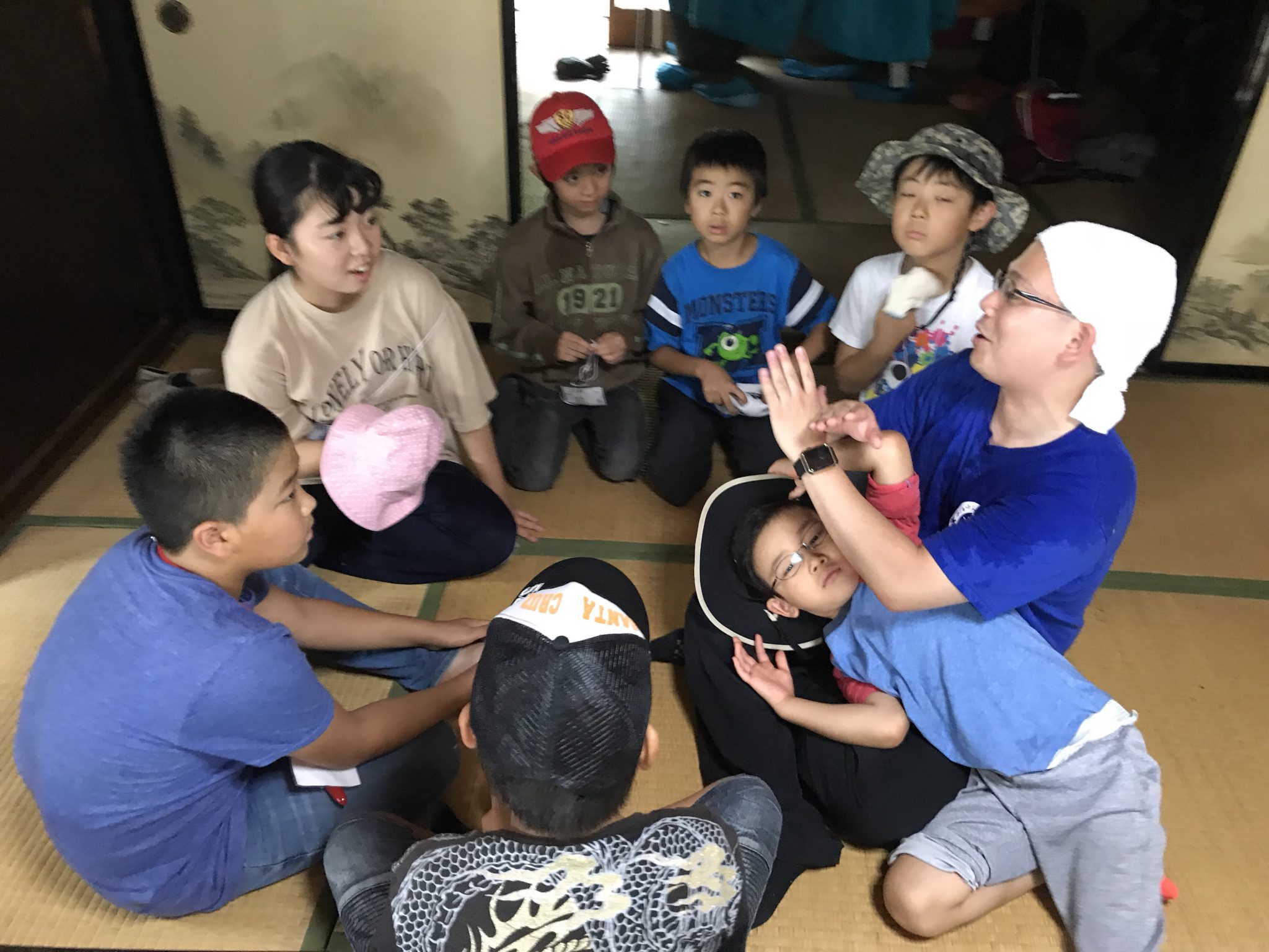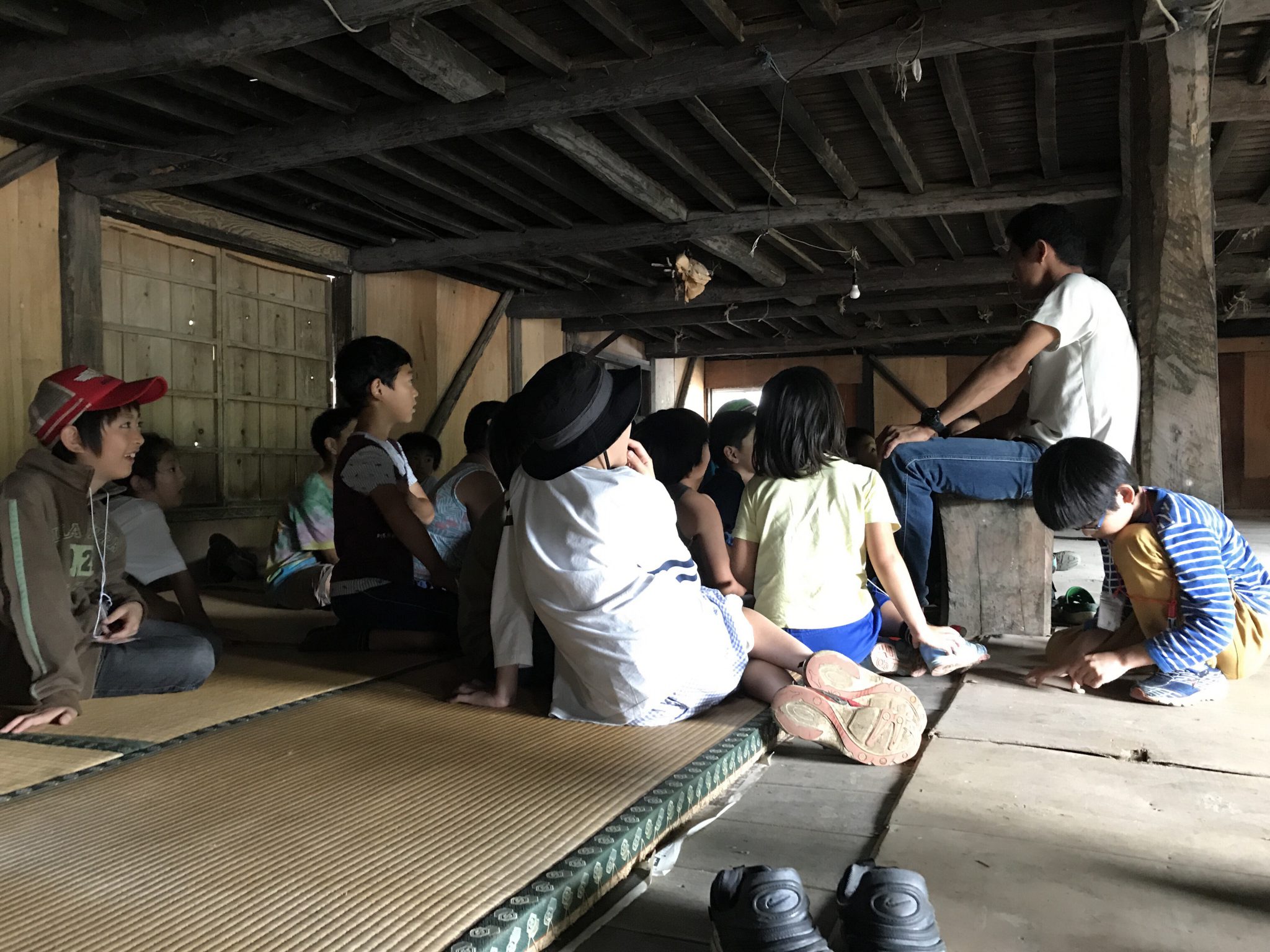 里山キャンプメンバーは、朝ごはんの片付けを済ませ、水着をカバンにしまい、自由時間を過ごしています。 室内でみんなで遊んでいます。