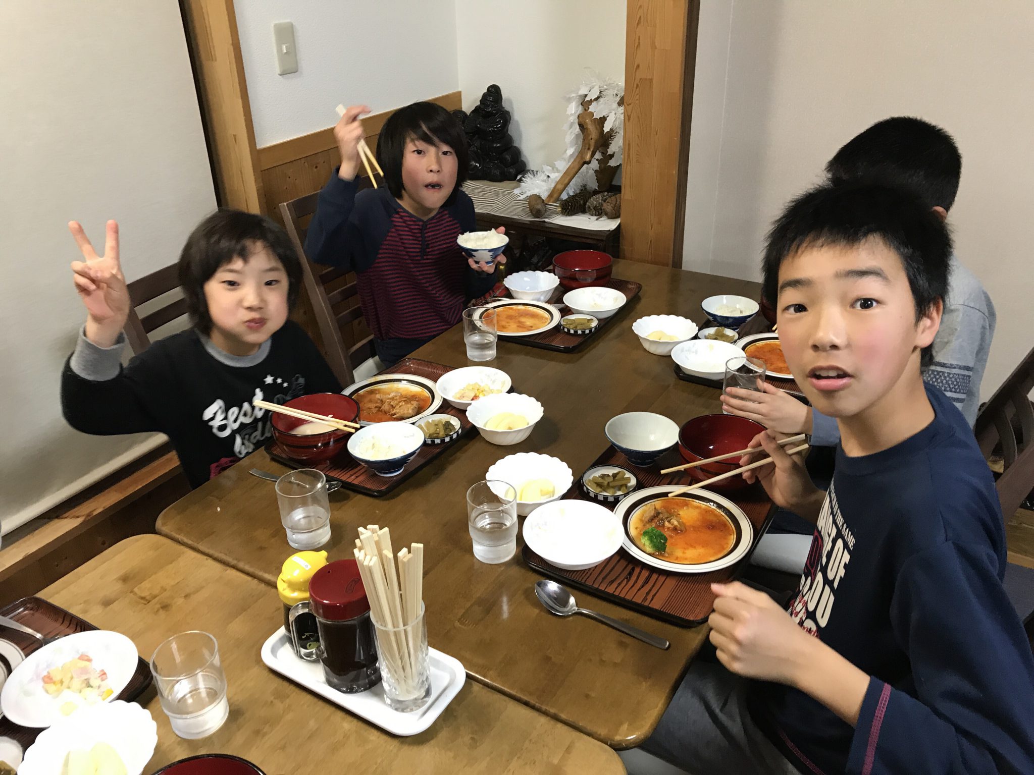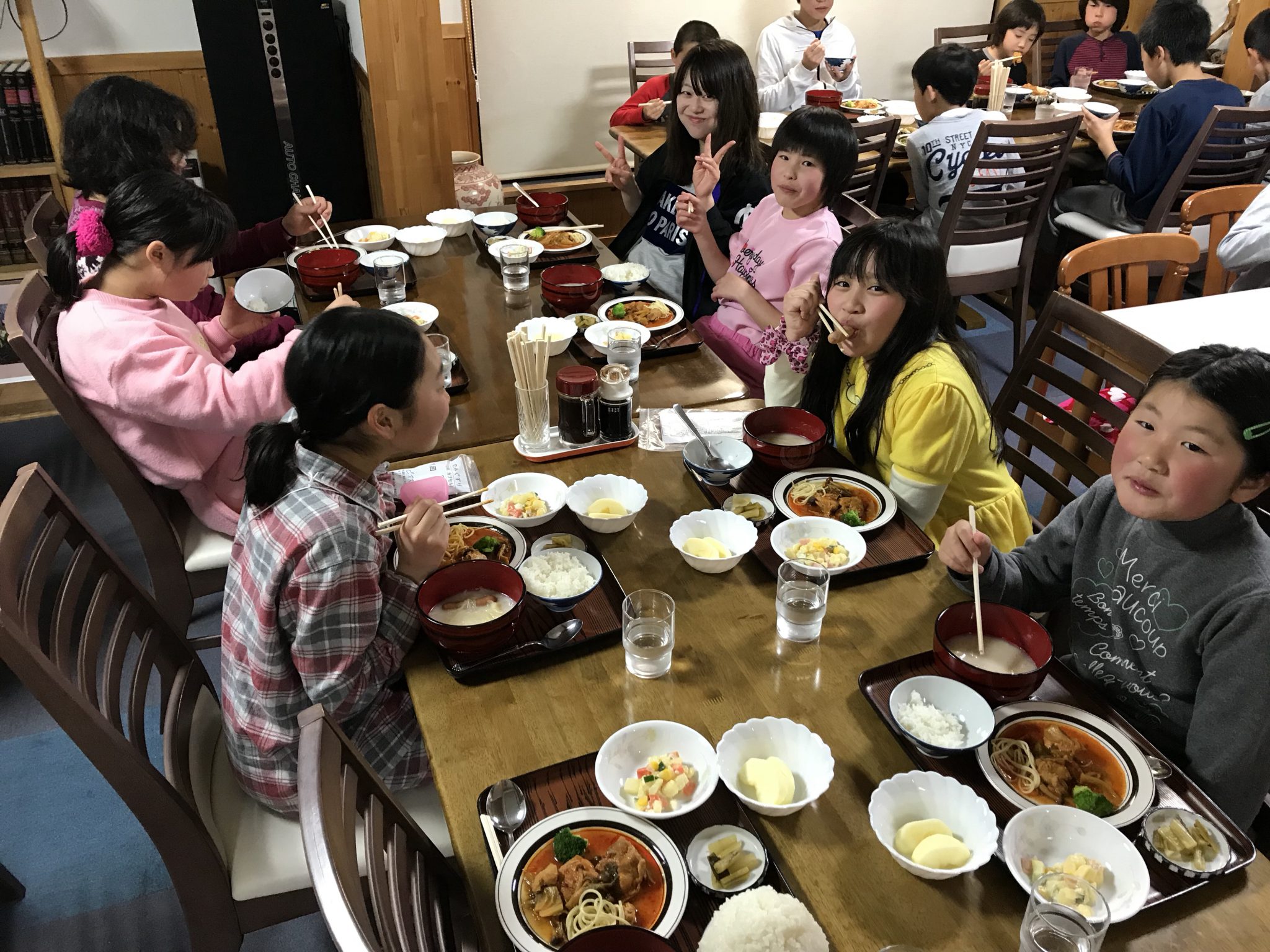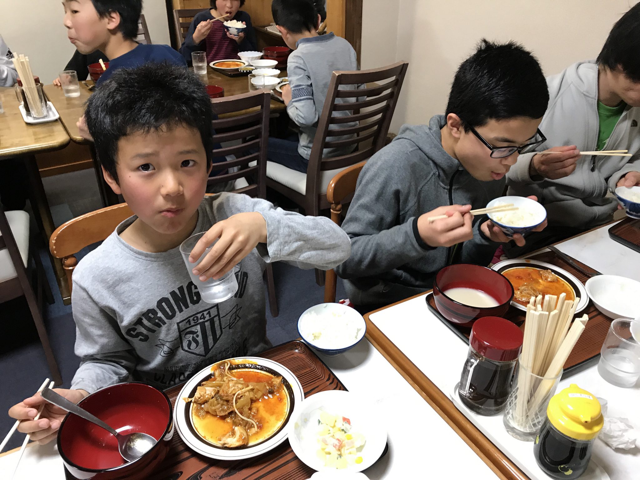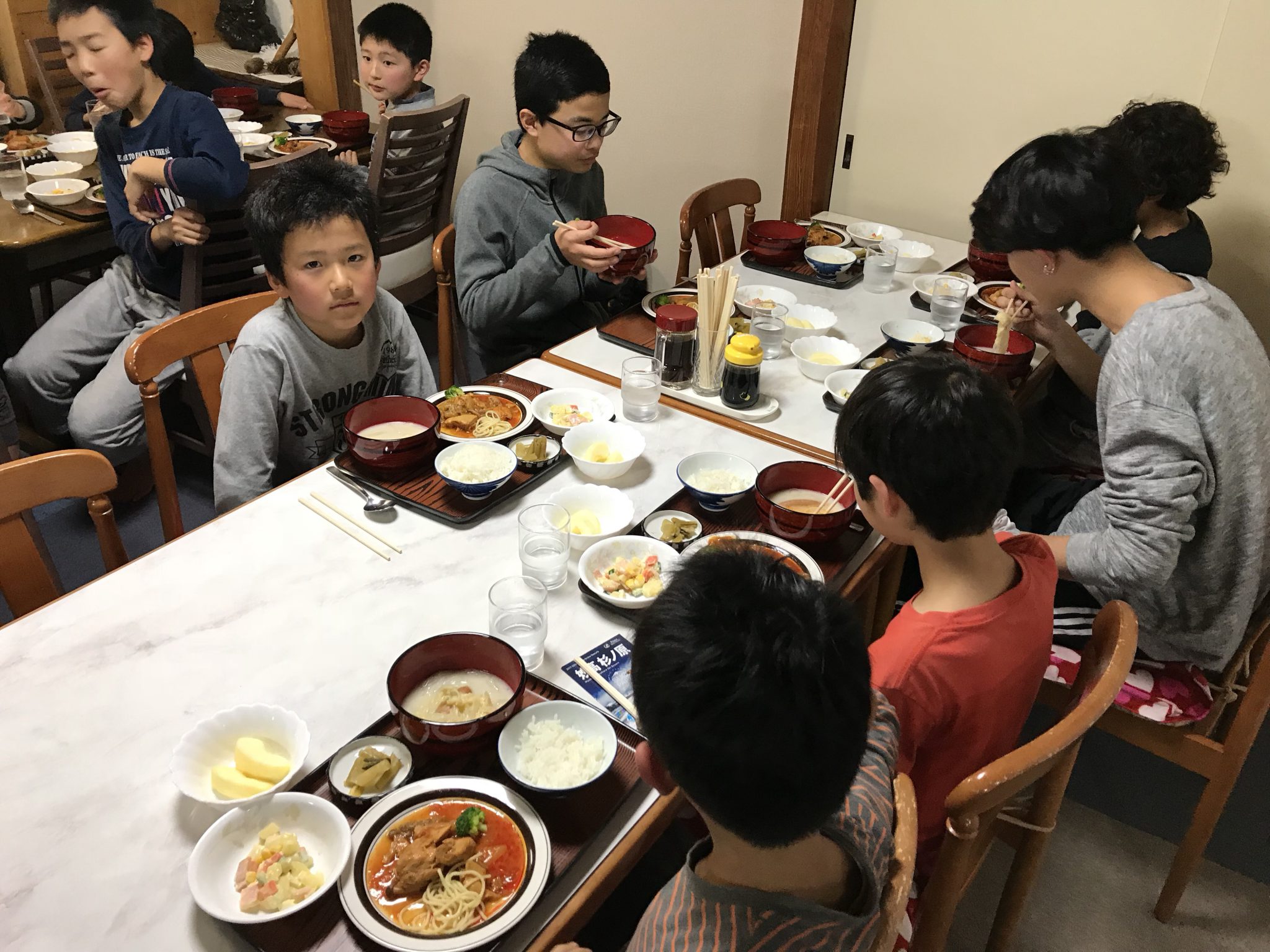 【春スキー】夕食食べています。