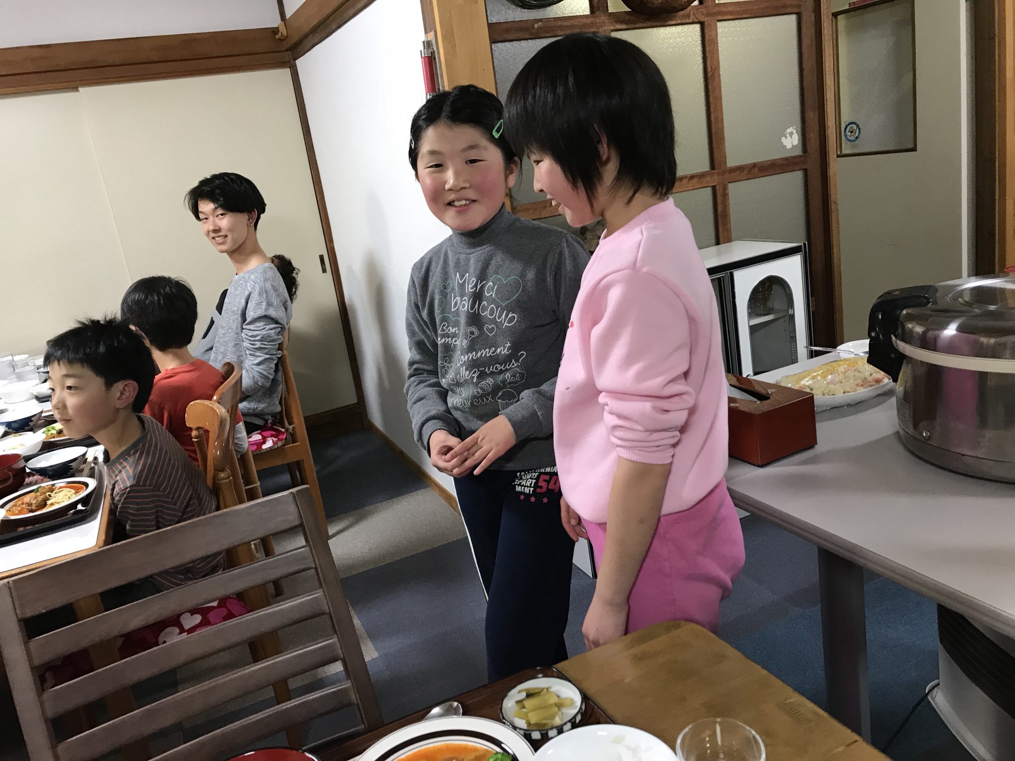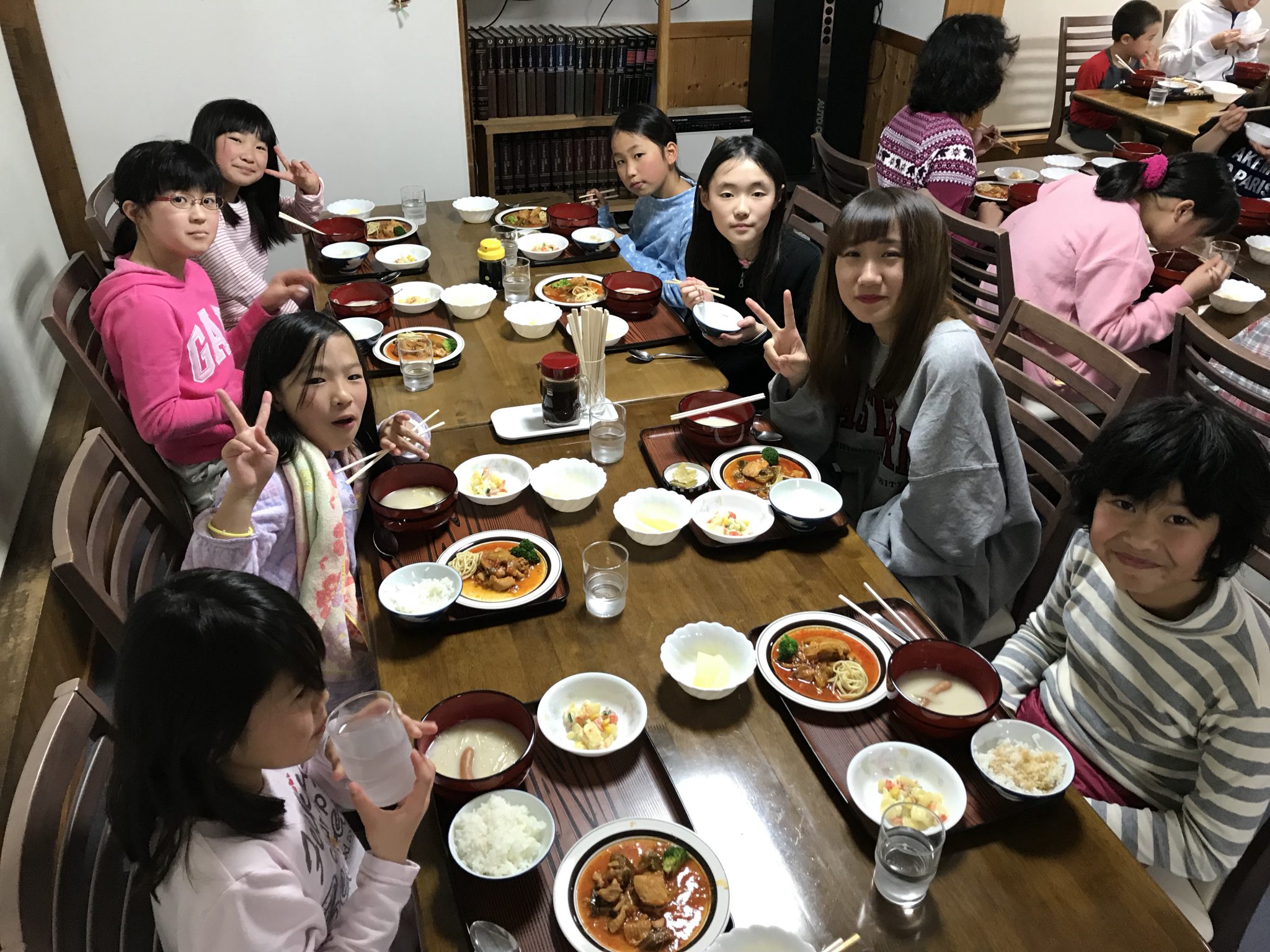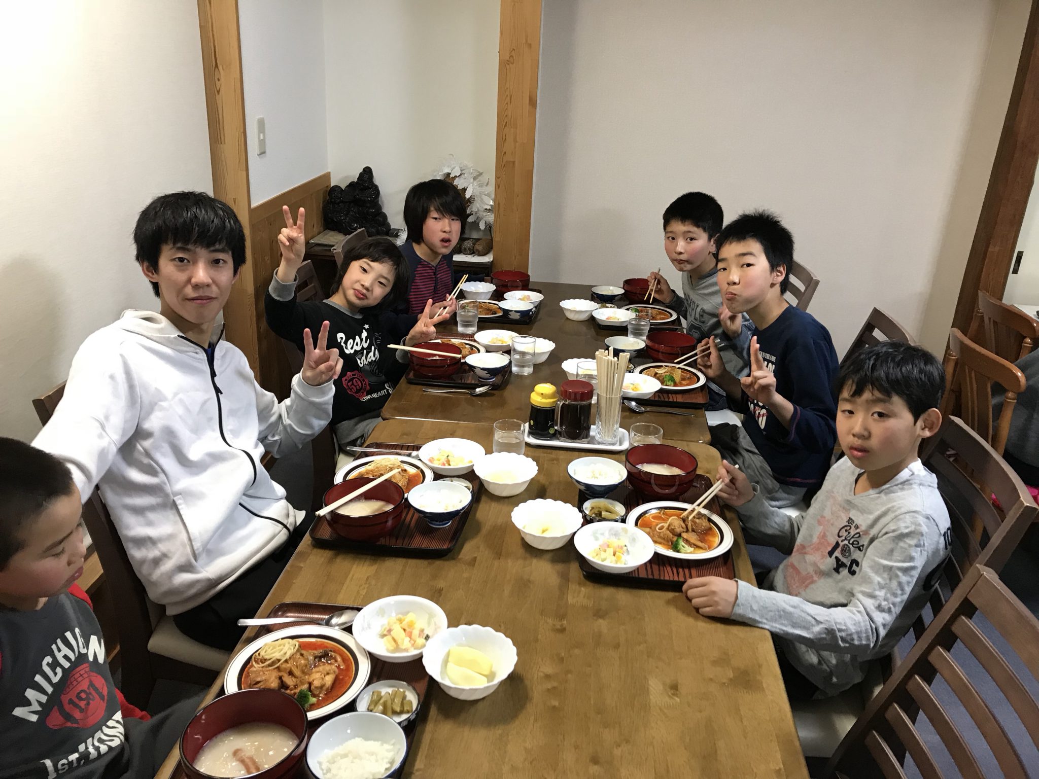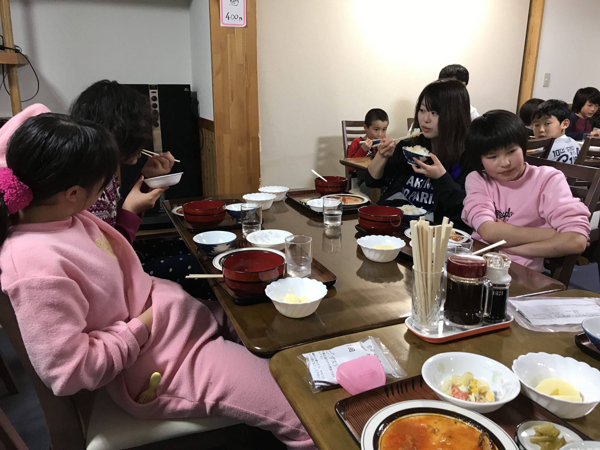 春スキーメンバーは、2時間スキーを楽しみ、お腹ぎ空いたので夜ご飯を食べてます! 会話が弾みます。