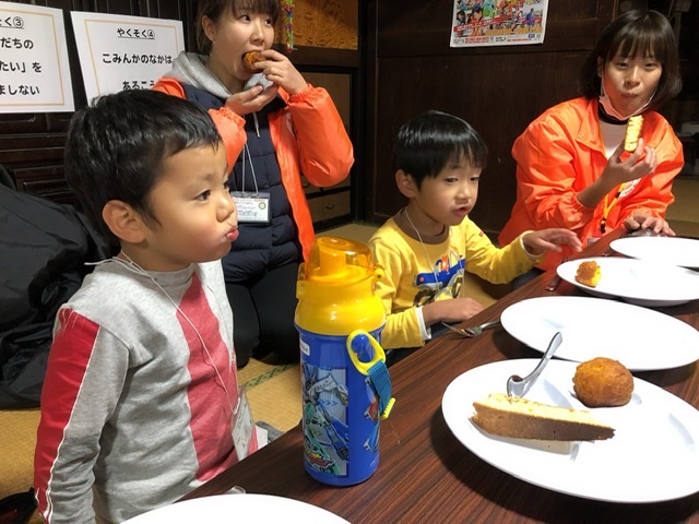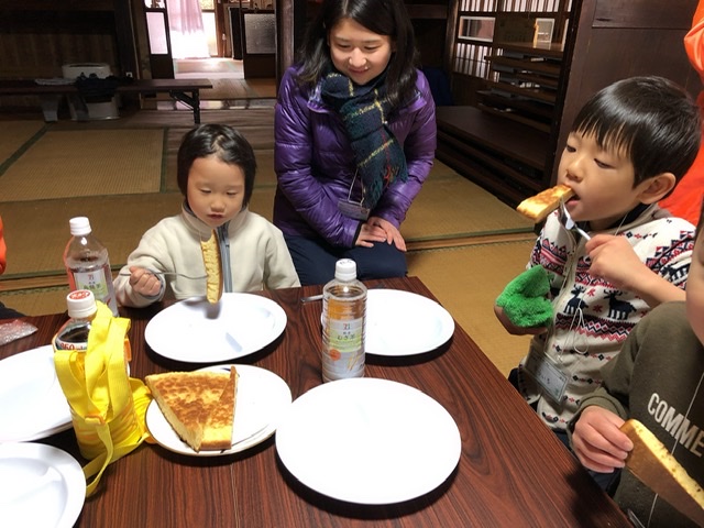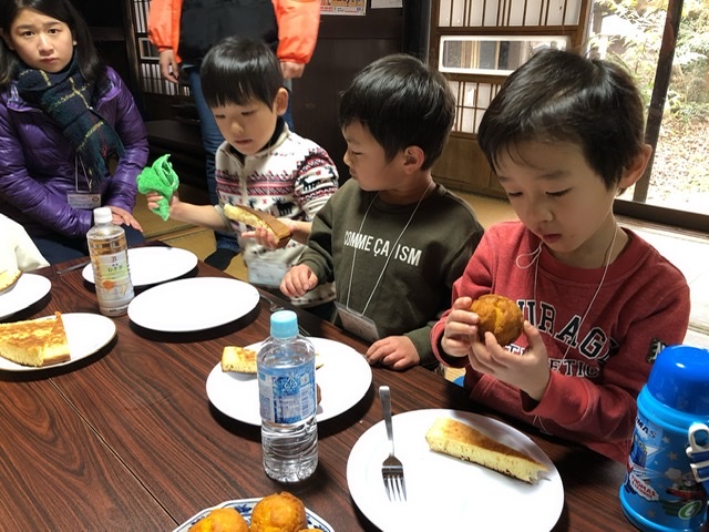 森のようちえんメンバーは近所のおばあちゃんに作っていただいたおやつを食べました。