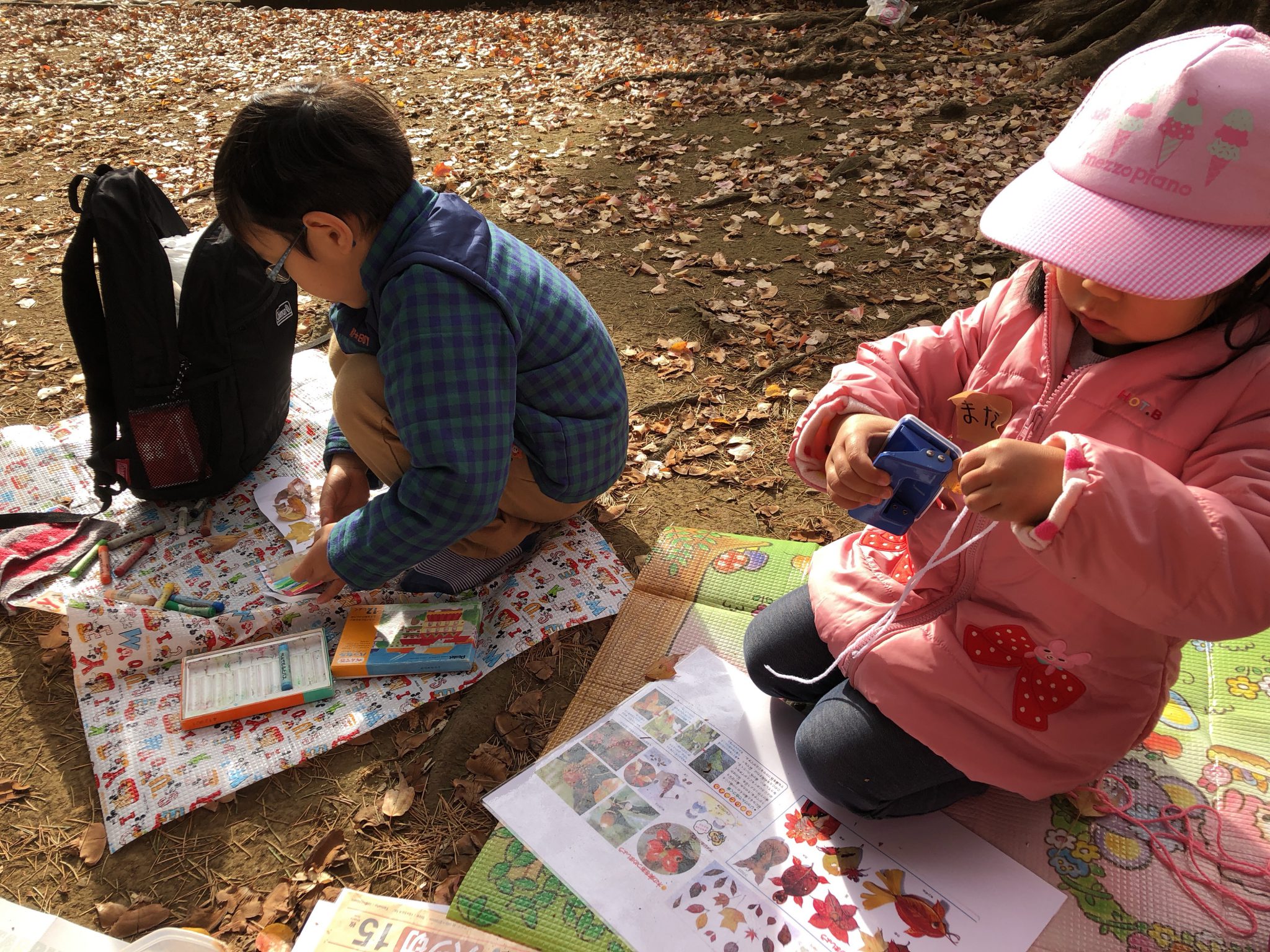 落ち葉を使った工作を始めたり、遊具で遊んだりと思い思いに過ごしています。