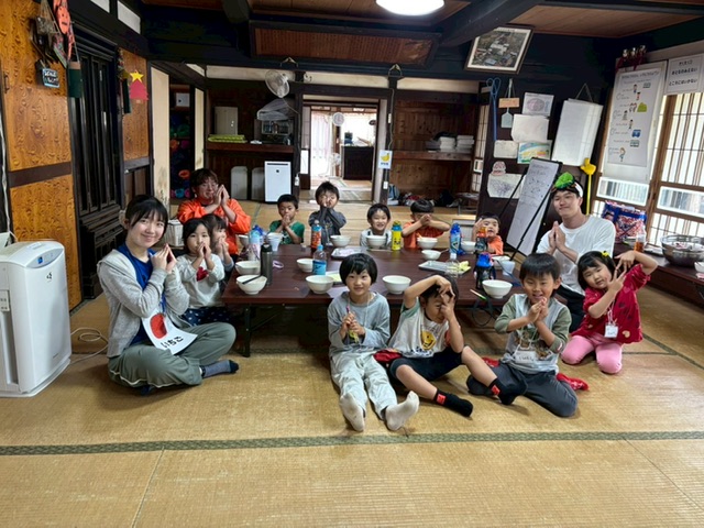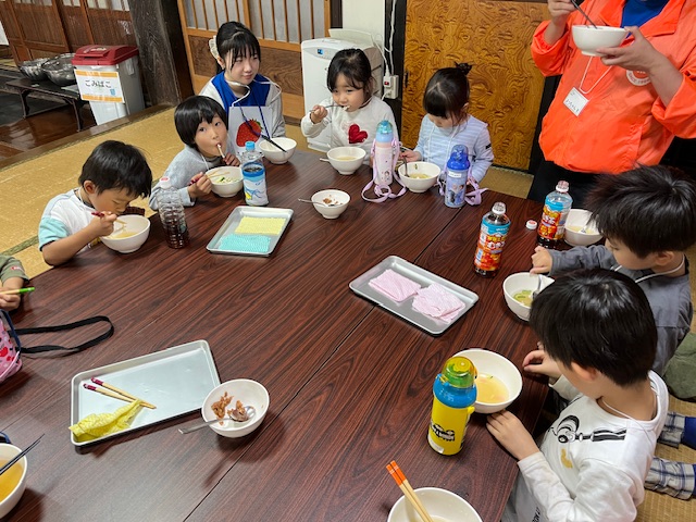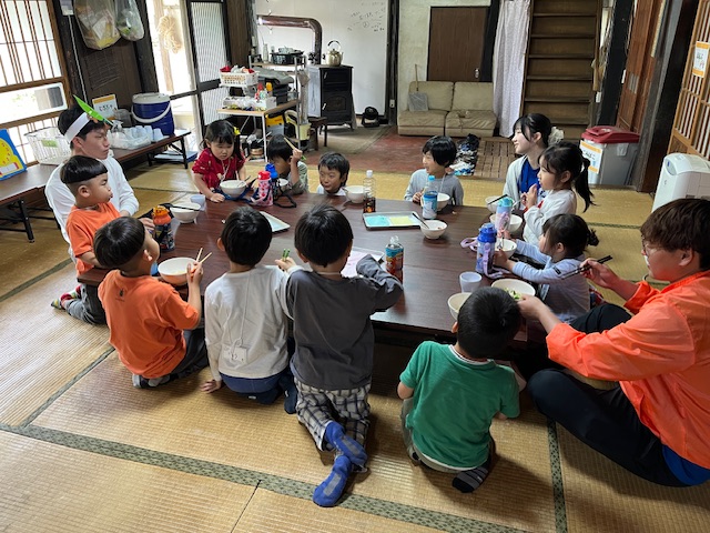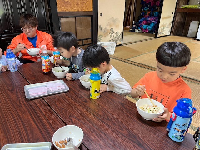 森のようちえんメンバーは、午前の活動を終えお昼ごはんに冷やしうどんを食べました。