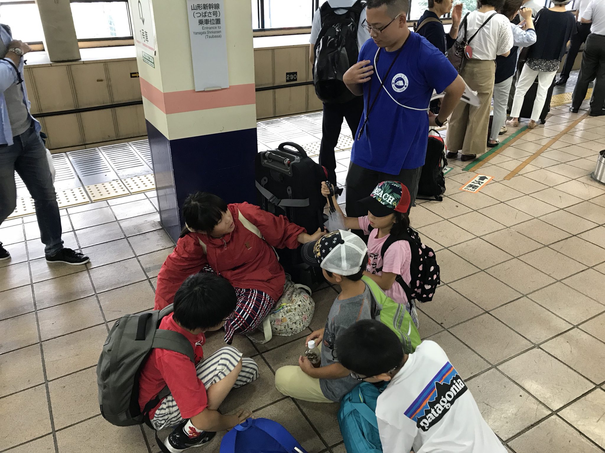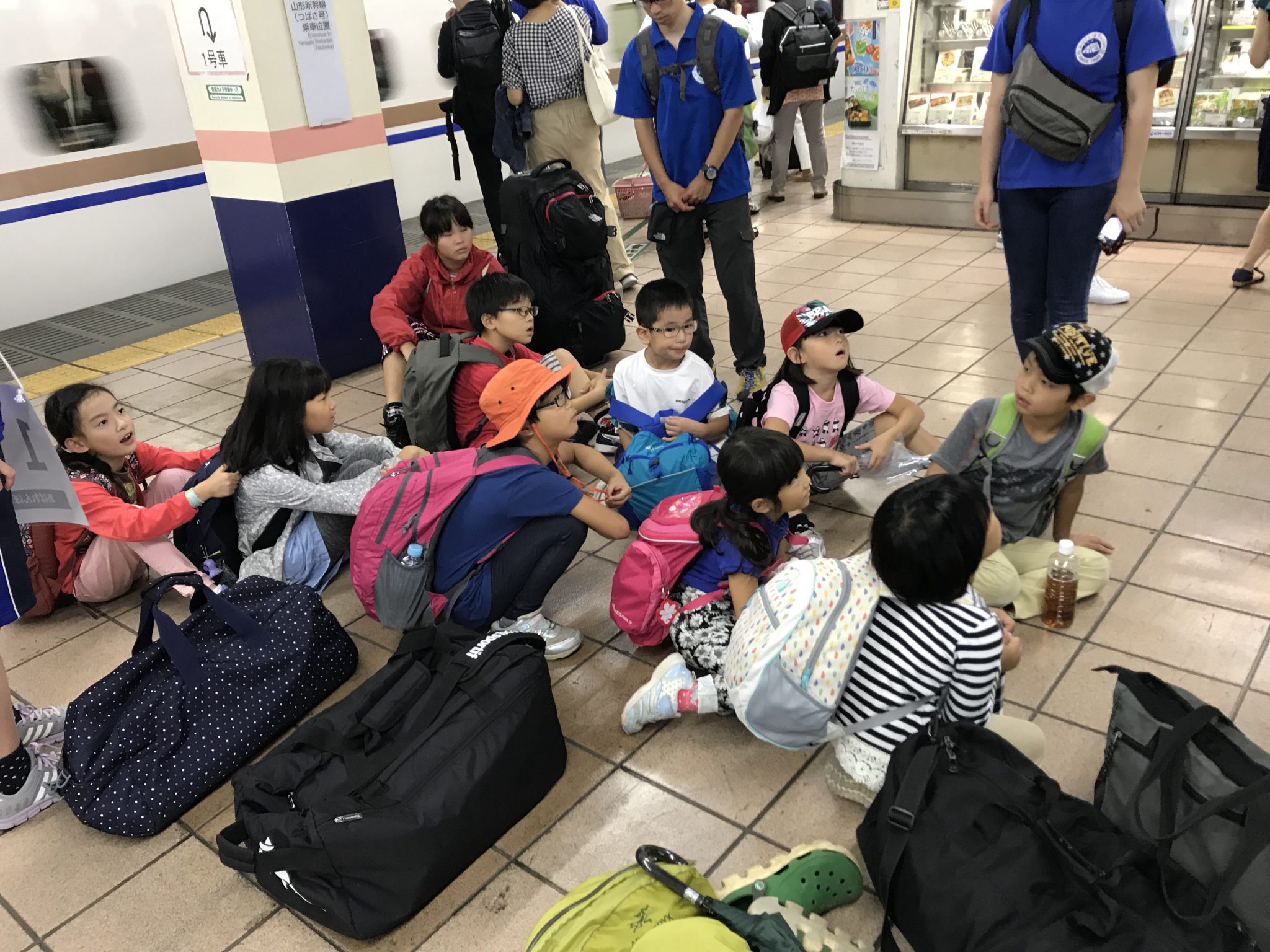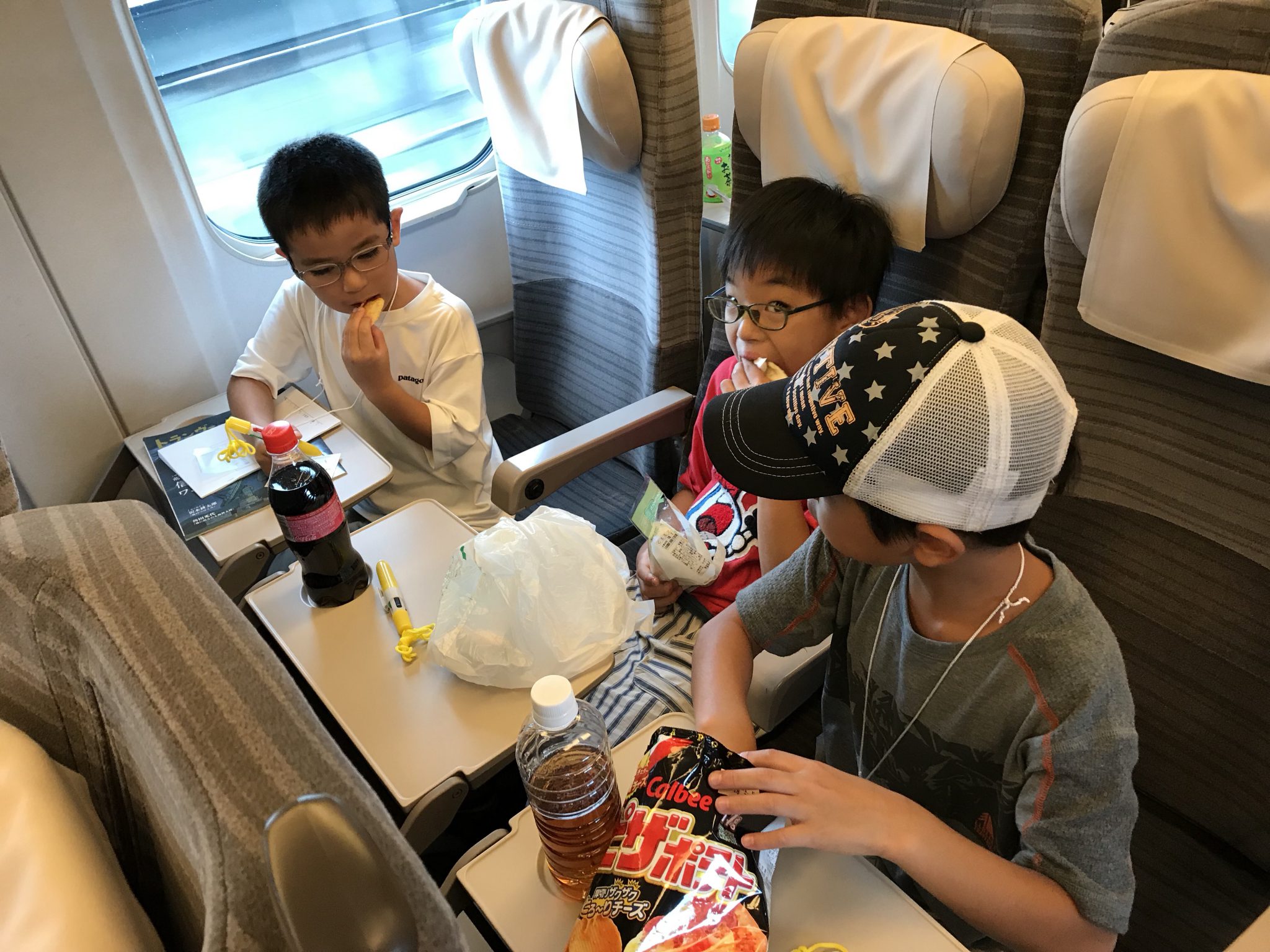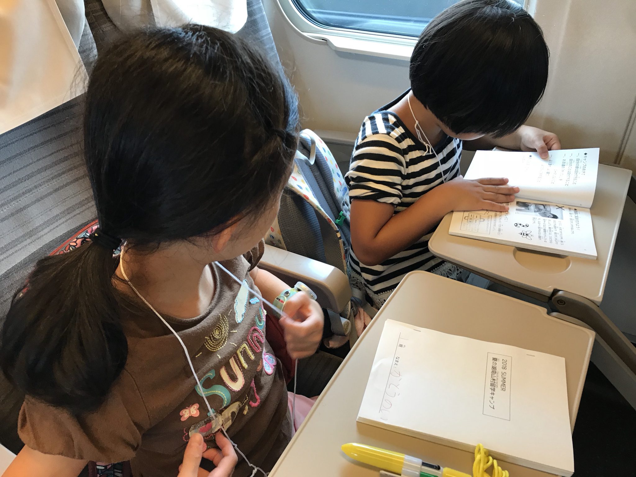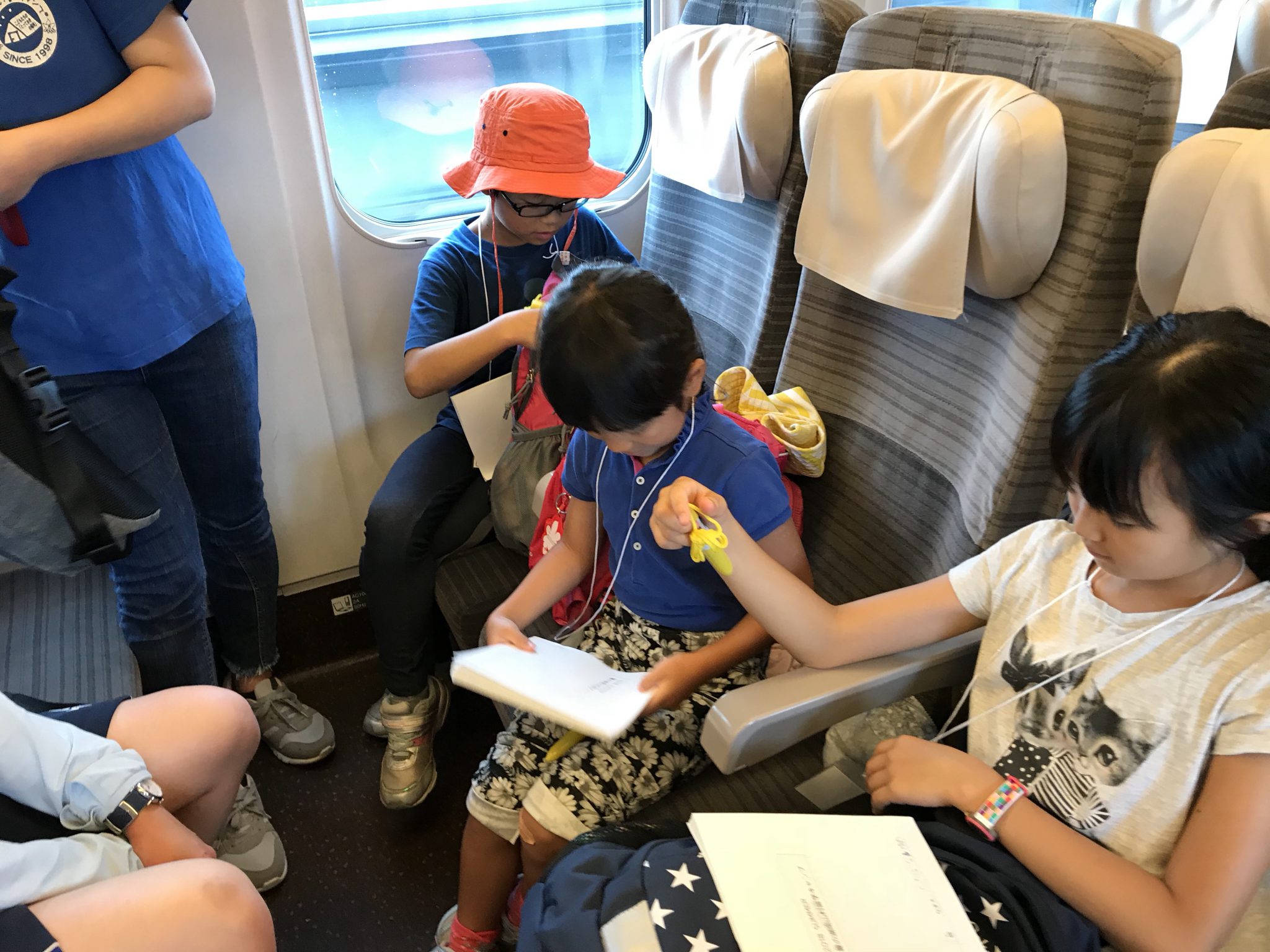 第1クールメンバーは大宮駅で新宿組、府中本町組が合流して、新幹線に乗りました。 車内では名札を作り、班ごとおやつを食べながら過ごしています。