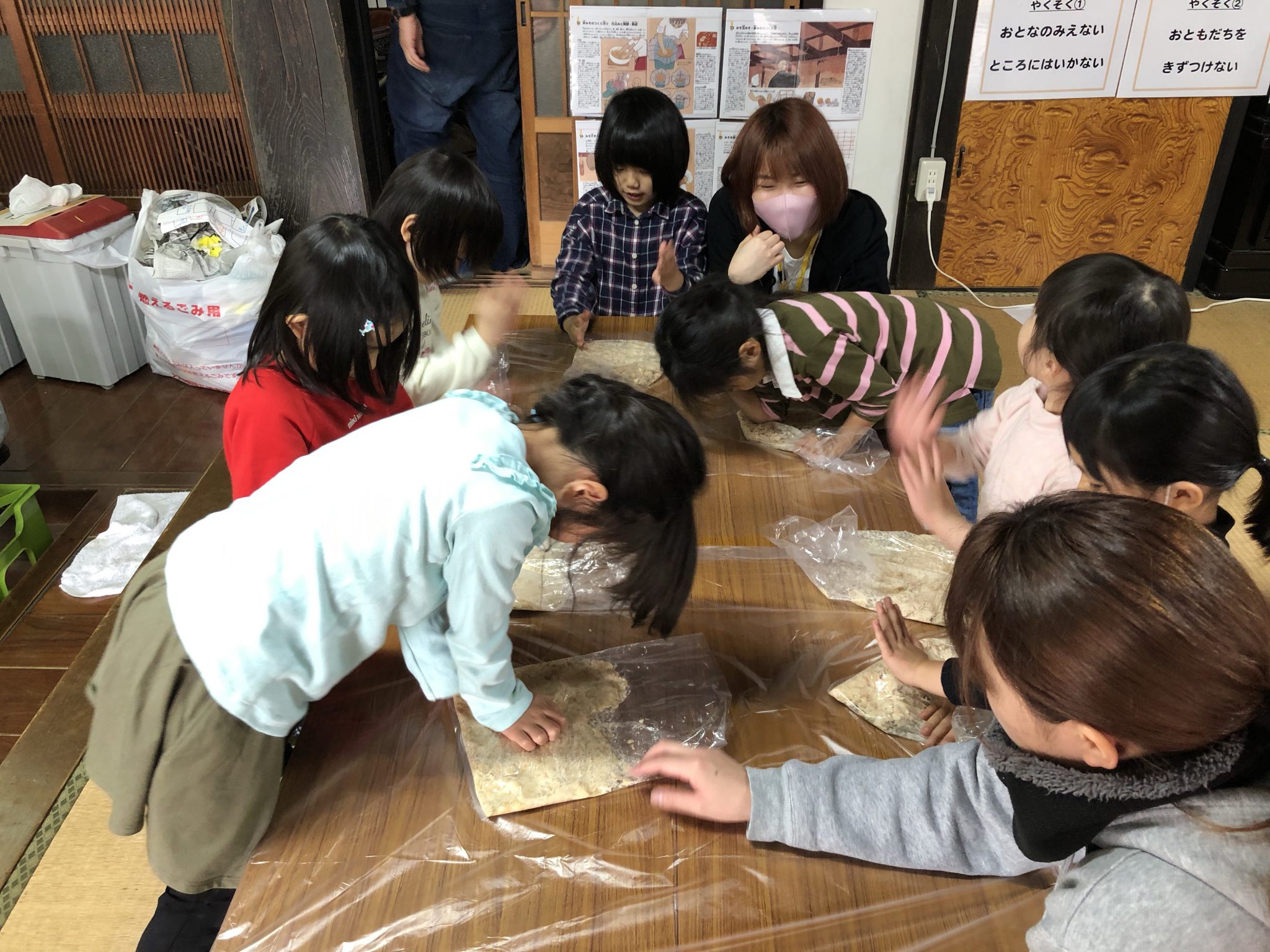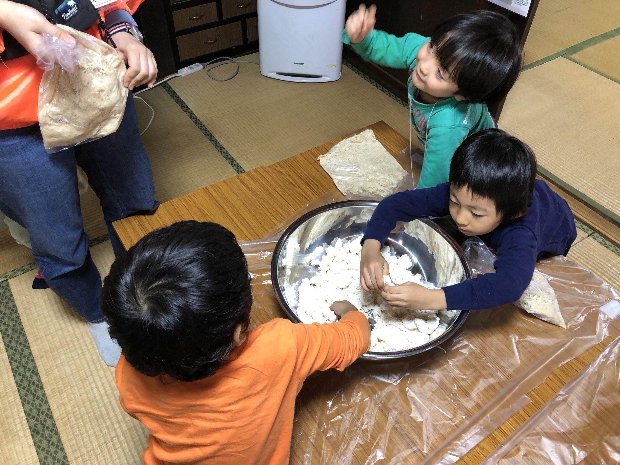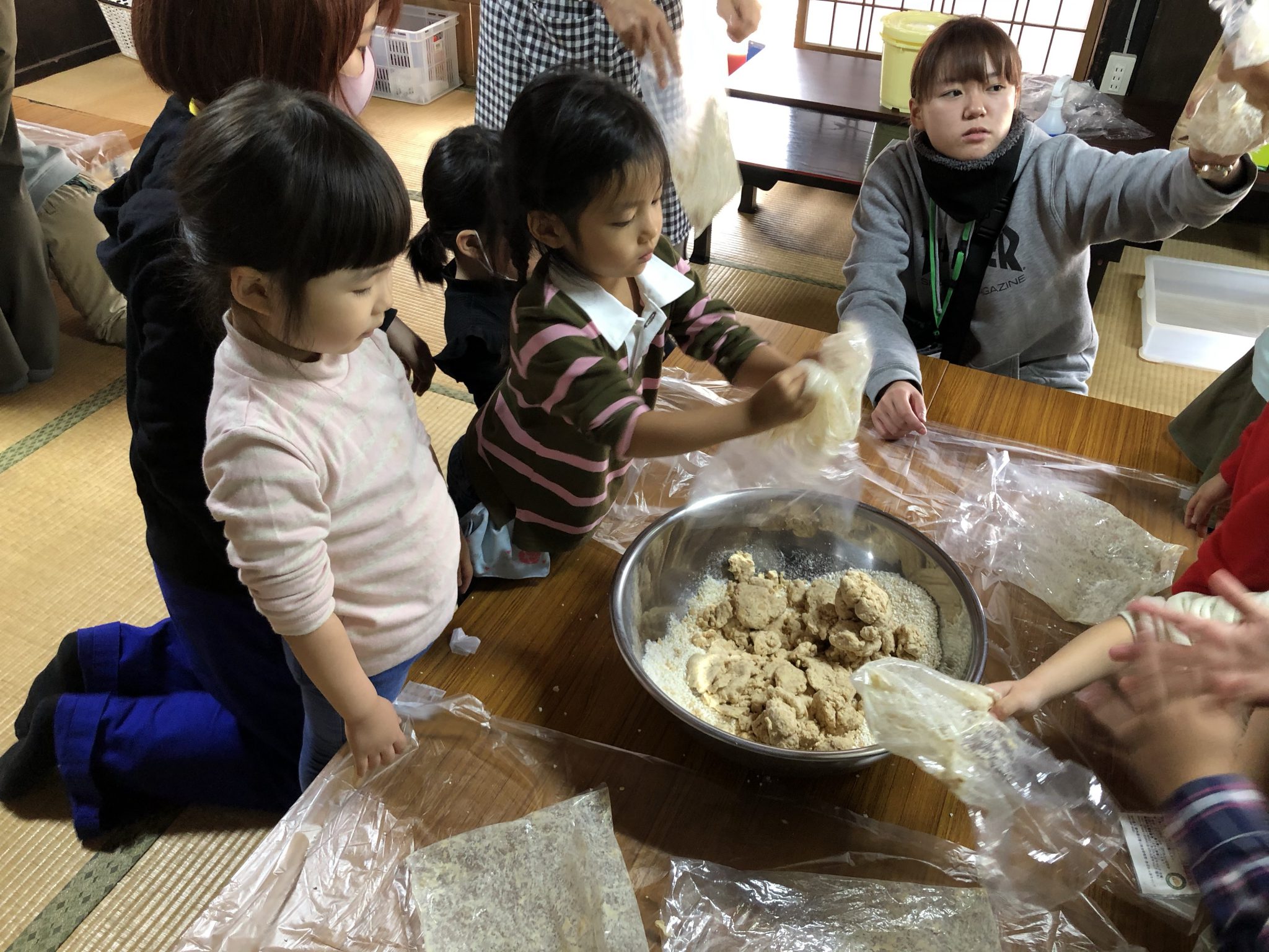 その後は地元お味噌屋さん 吉村糀店 上田様にお越しいただき、お味噌作りをしています。