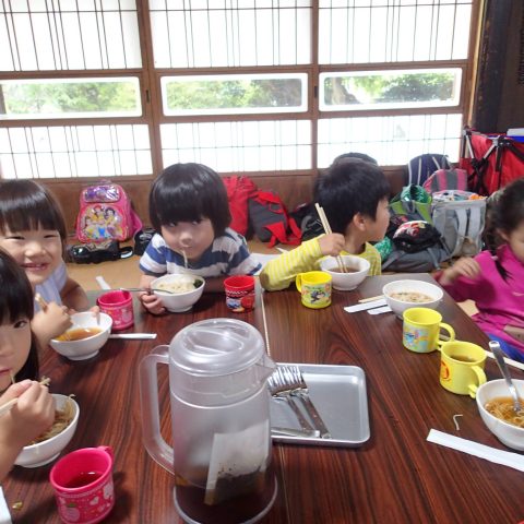 午後は雨が本降りとなったためお部屋の中で過ごす子がほとんどでしたが、蜘蛛の巣を初めて見る子がいたり、雲が低く山にかかっている景色に驚いている子がいたりと