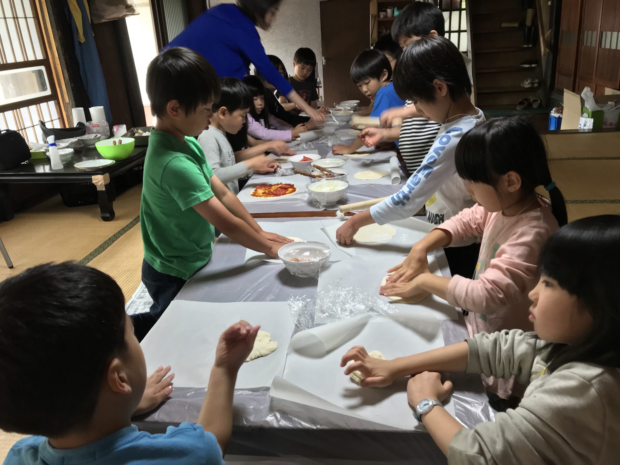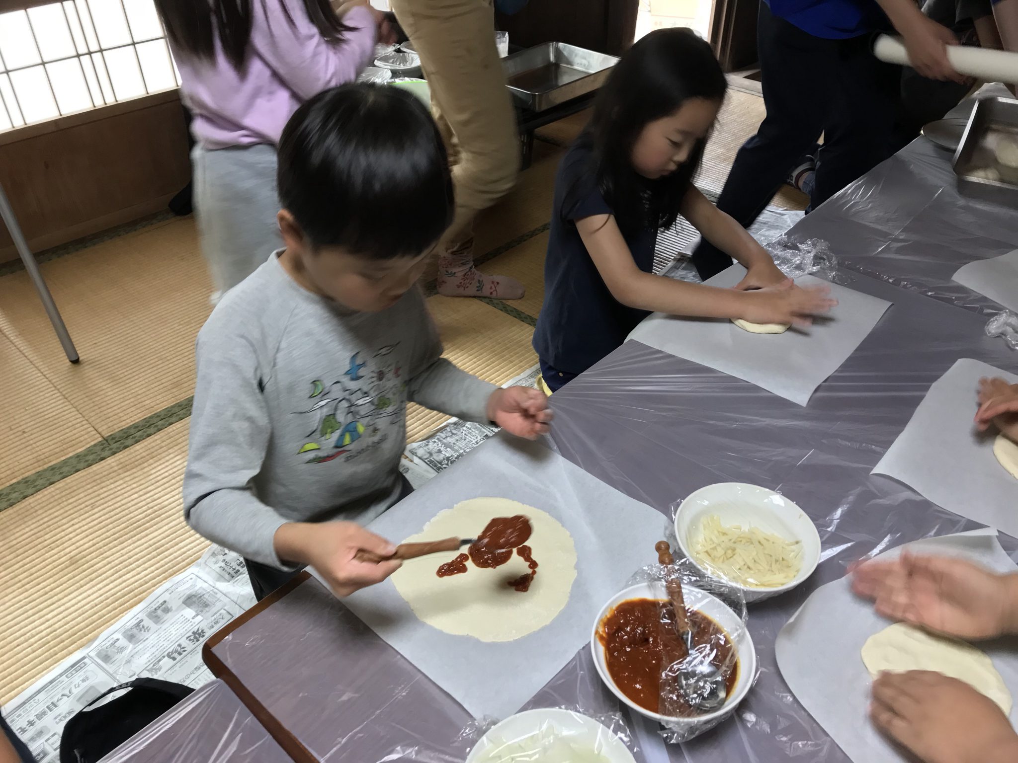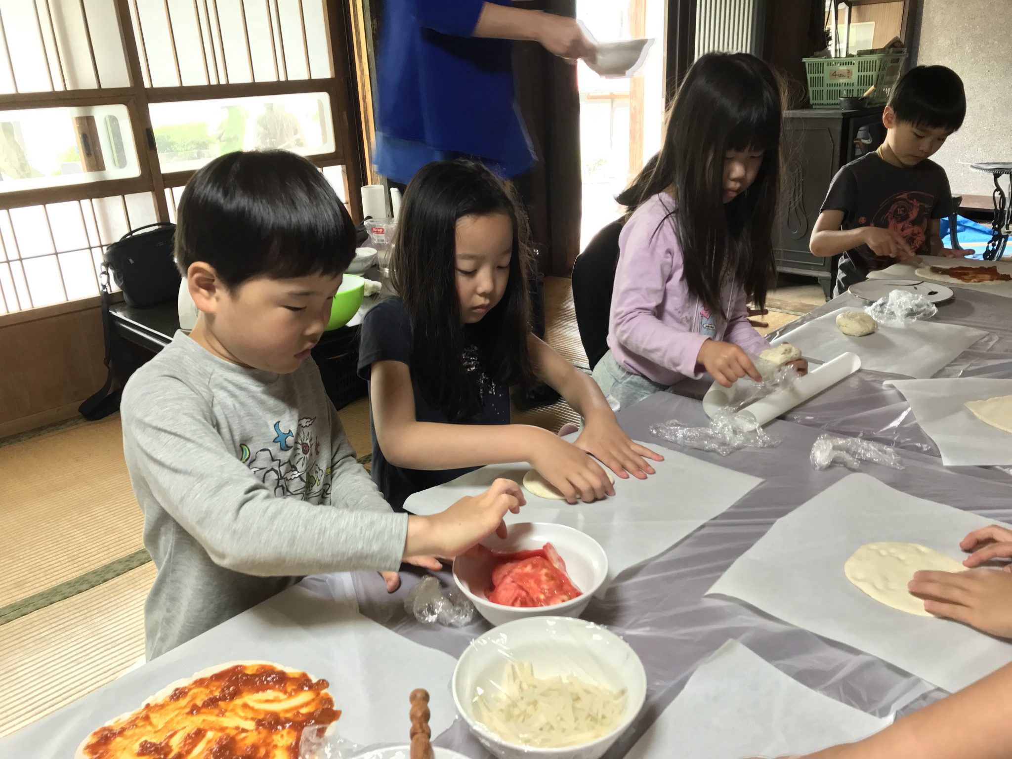 里山キャンプメンバーは、畑仕事でじゃがいもの畝の草抜き、桜の木の植樹、きゅうりのアーチ作りをしました。 夏に向けて野菜が育てます! お腹が空いたので、お昼ご飯を作りました! 本日の昼食は「ピザ」! みんなで生地を伸ばし、自分たちでトッピングをして食べます!