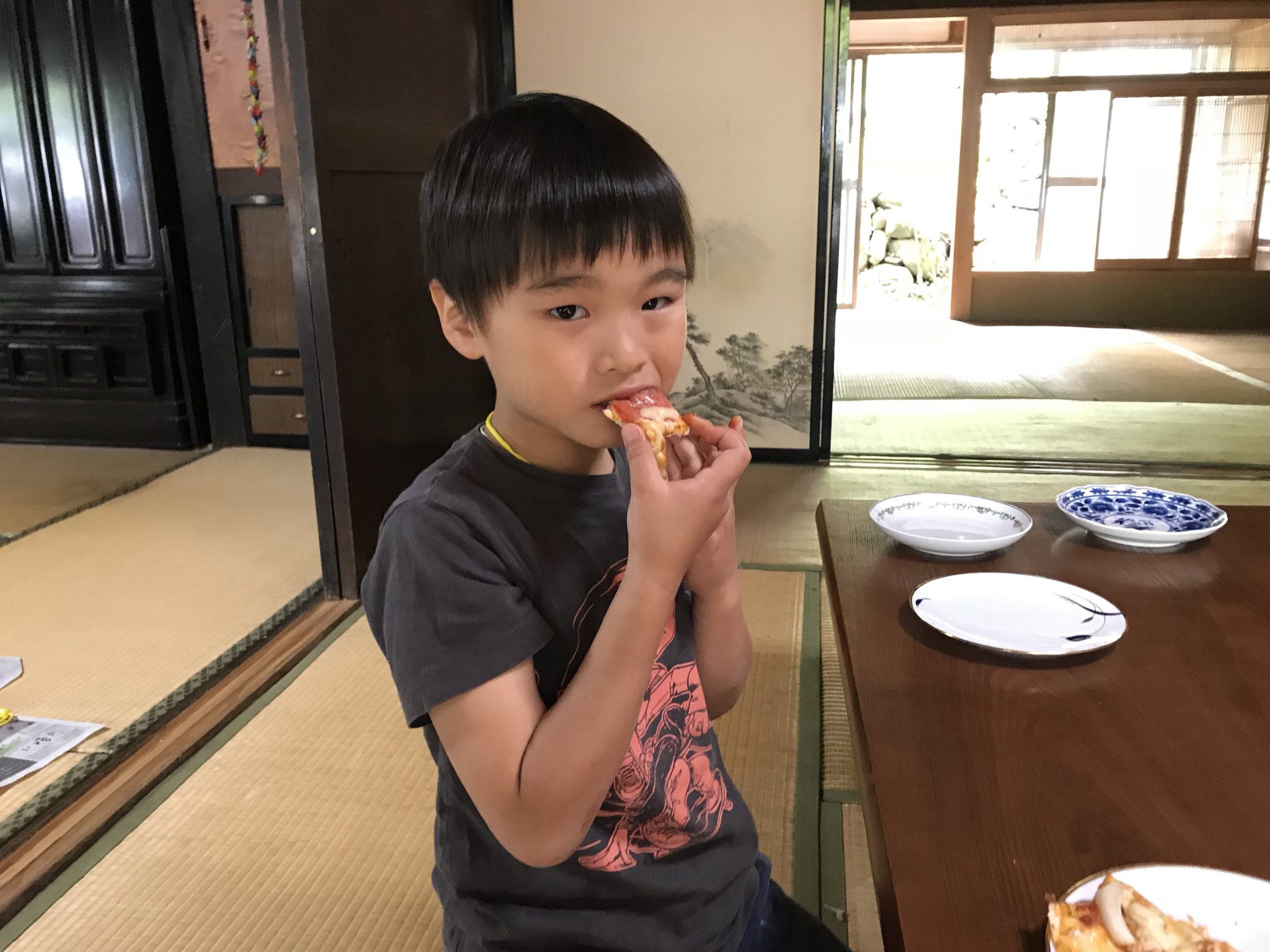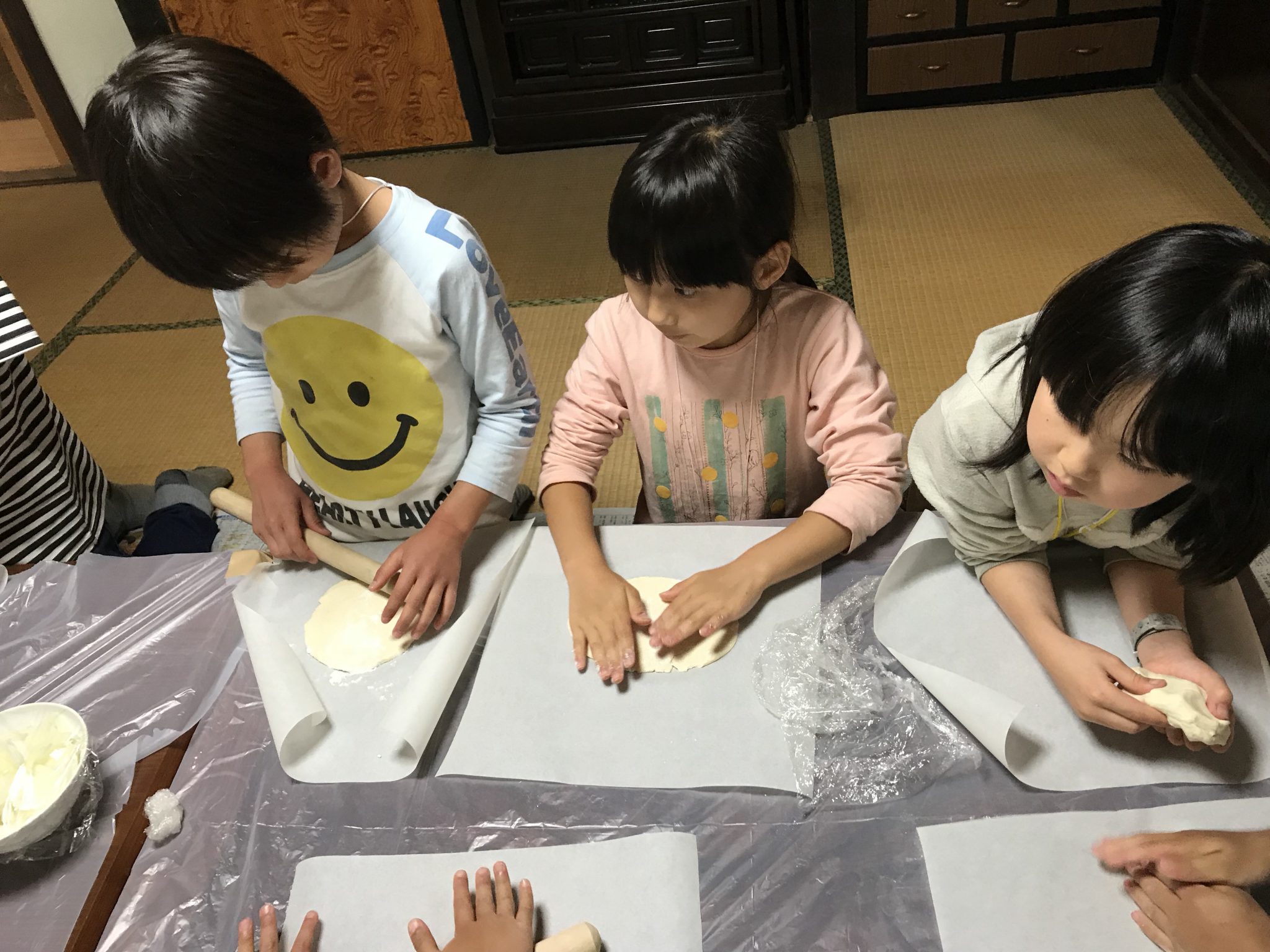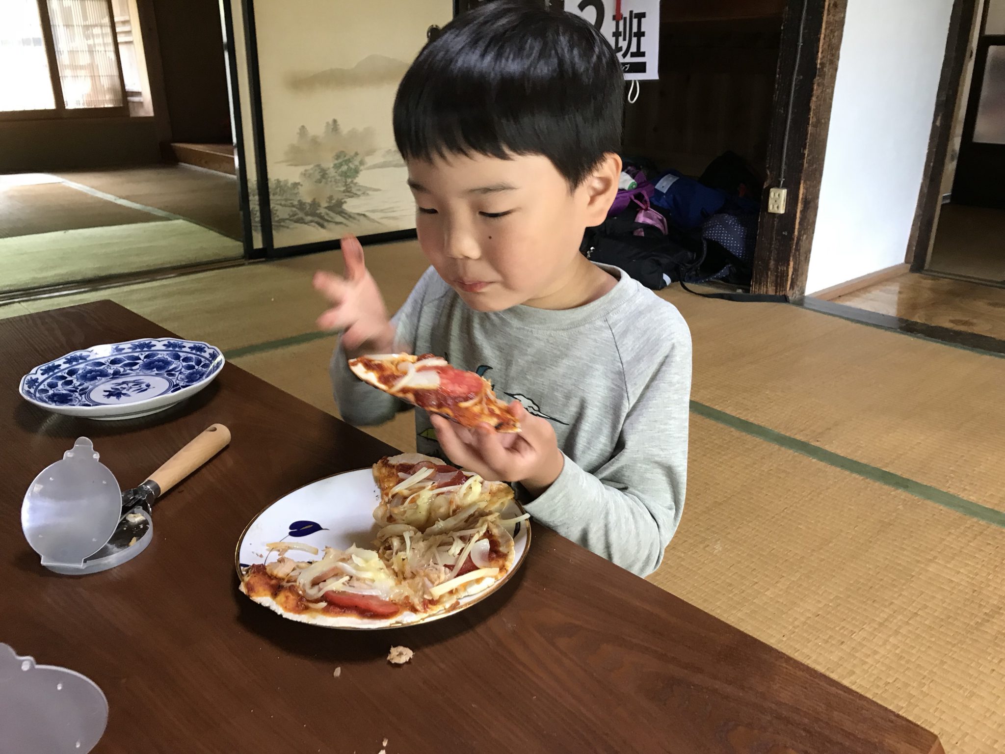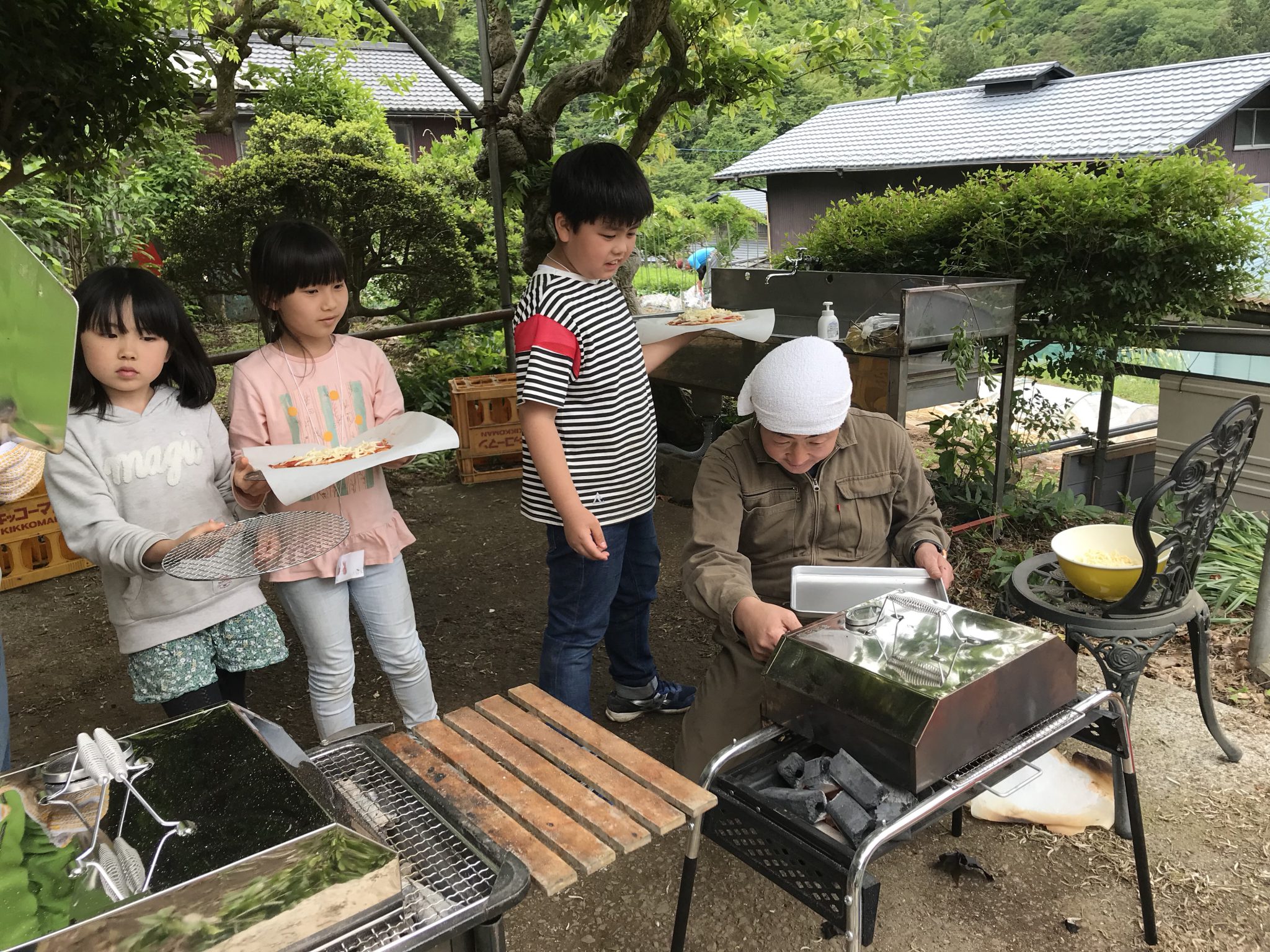 里山キャンプメンバーは、畑仕事でじゃがいもの畝の草抜き、桜の木の植樹、きゅうりのアーチ作りをしました。 夏に向けて野菜が育てます! お腹が空いたので、お昼ご飯を作りました! 本日の昼食は「ピザ」! みんなで生地を伸ばし、自分たちでトッピングをして食べます!
