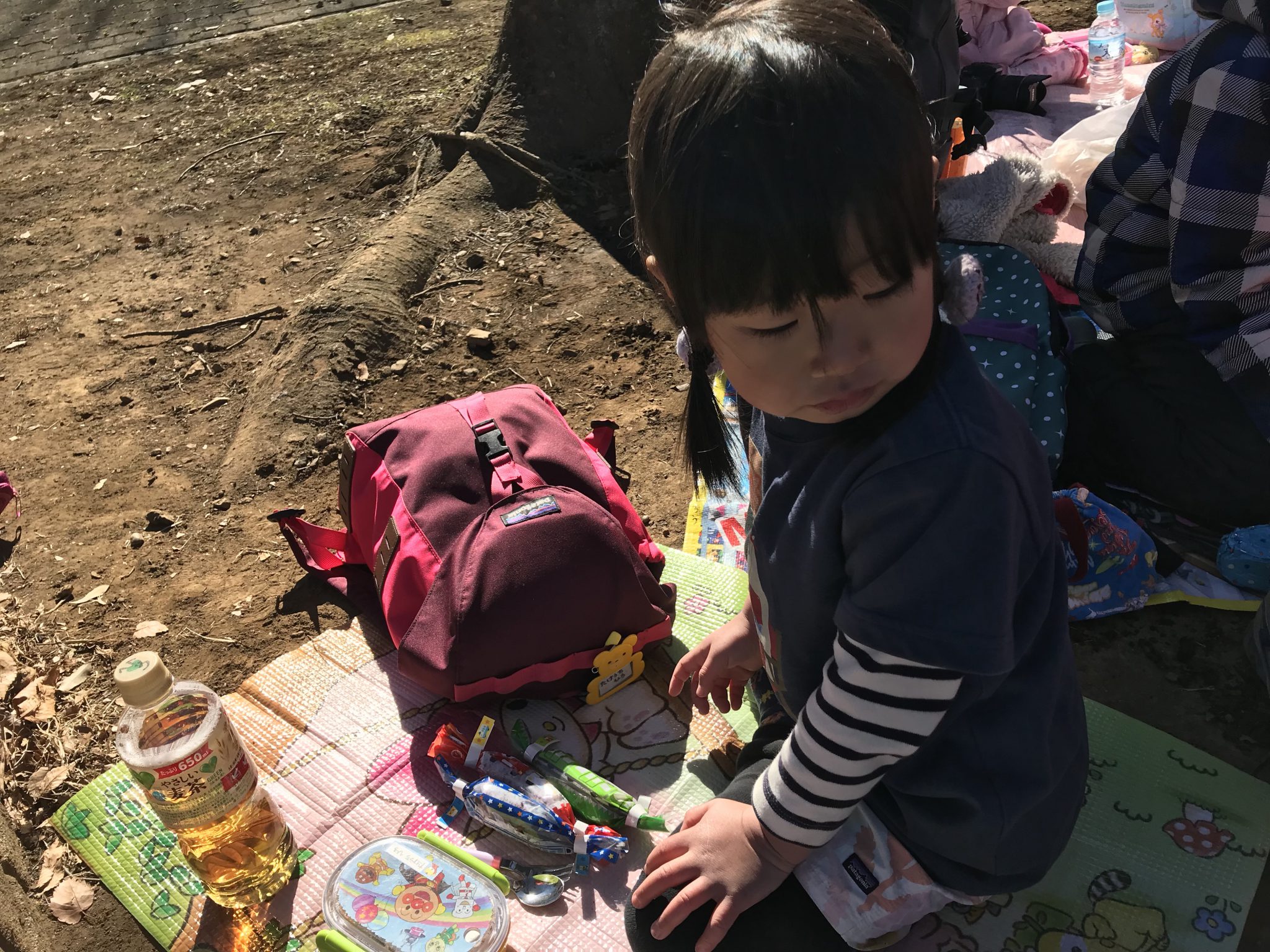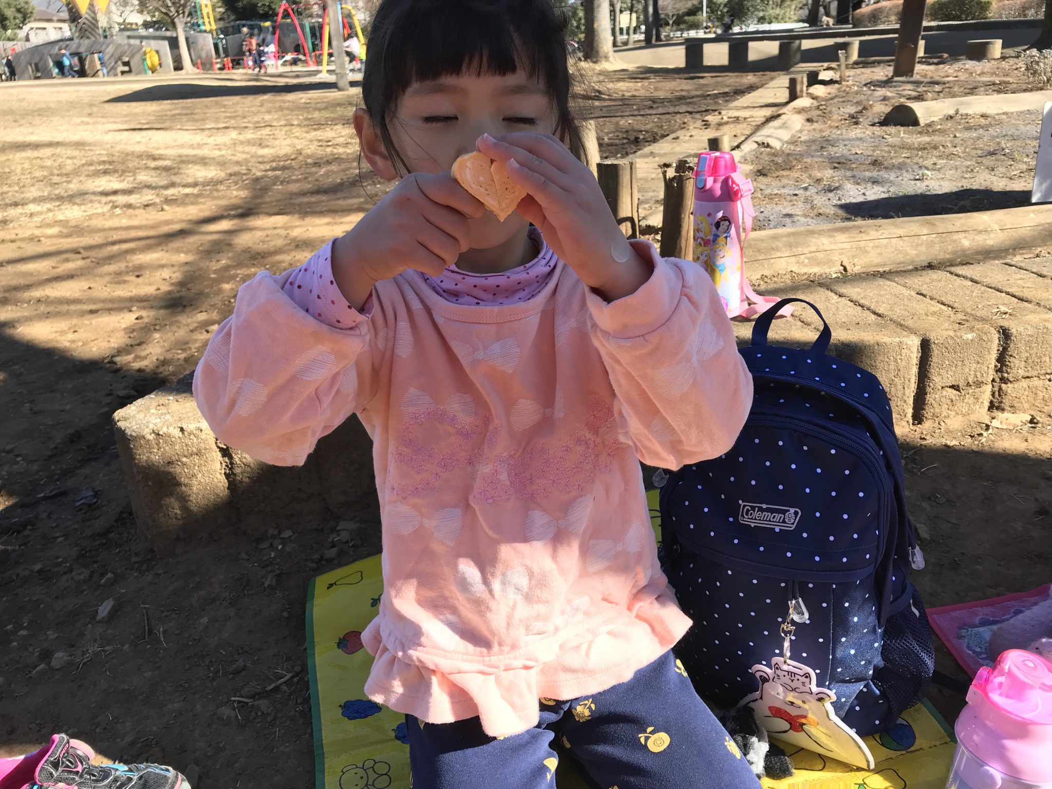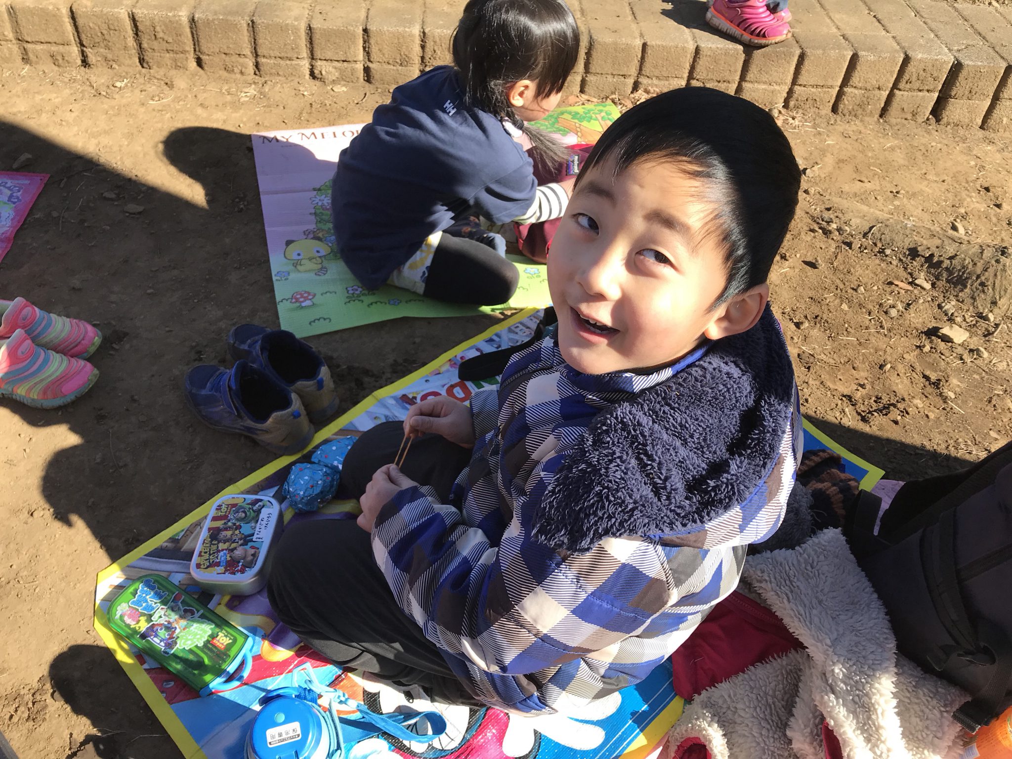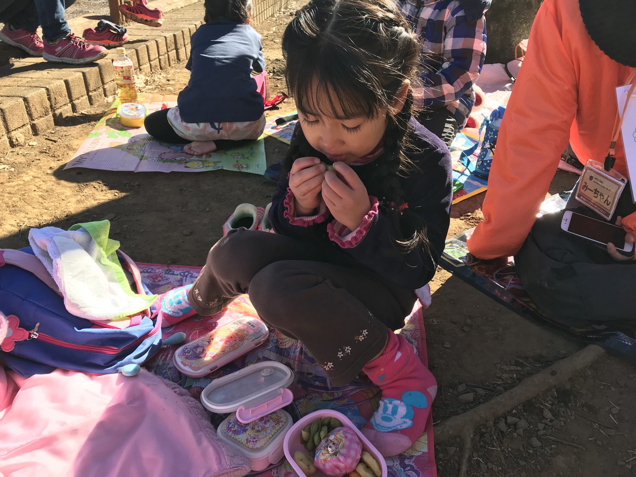 森のようちえんメンバーはたくさん遊び、お腹が空いたのでお昼ご飯を食べています。 もりもり食べてます!