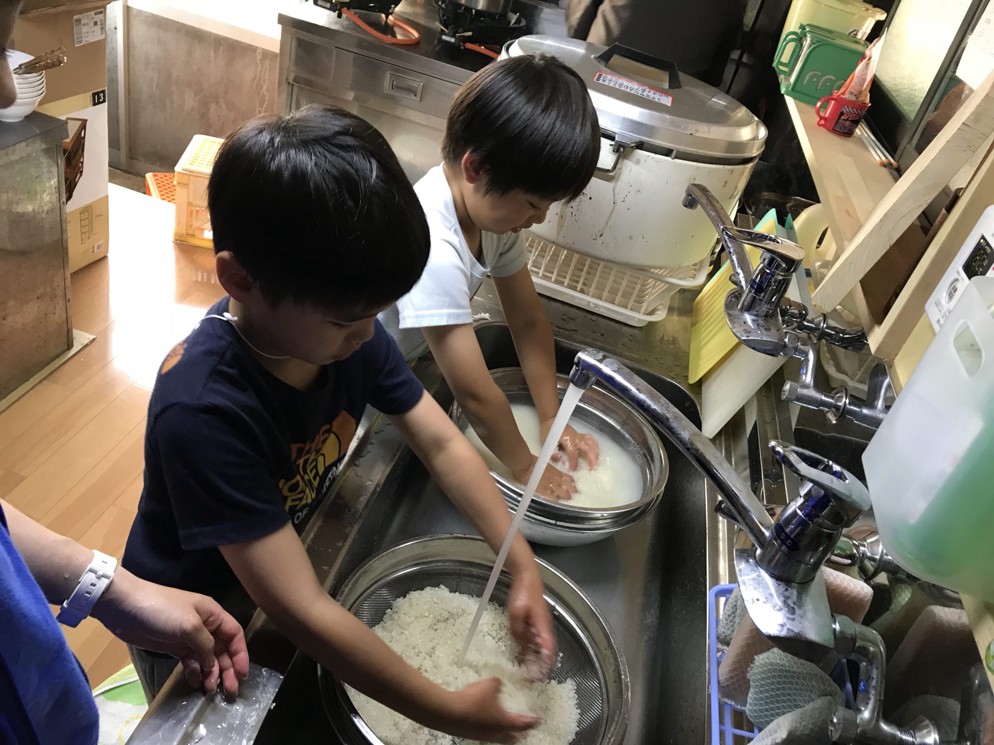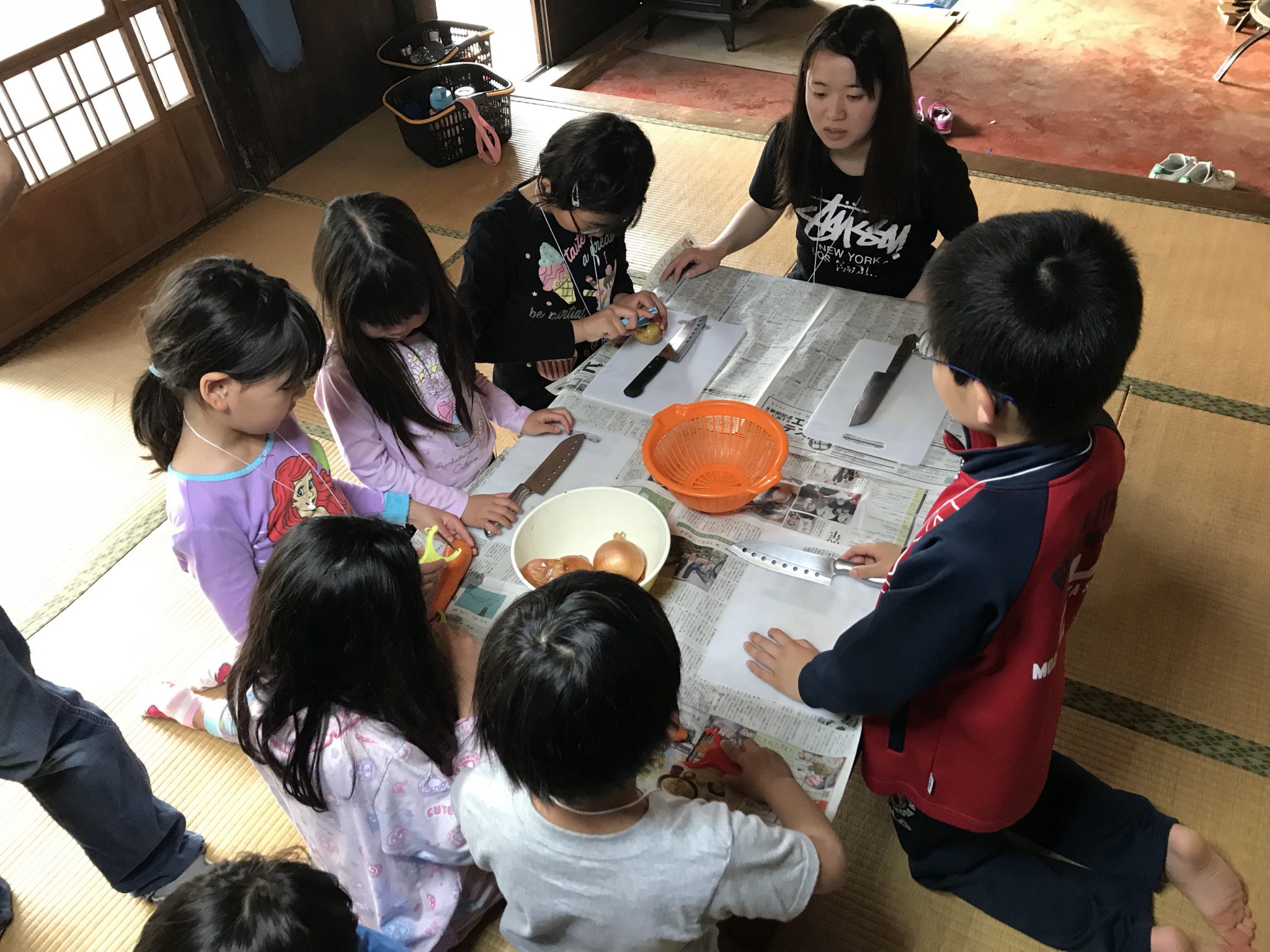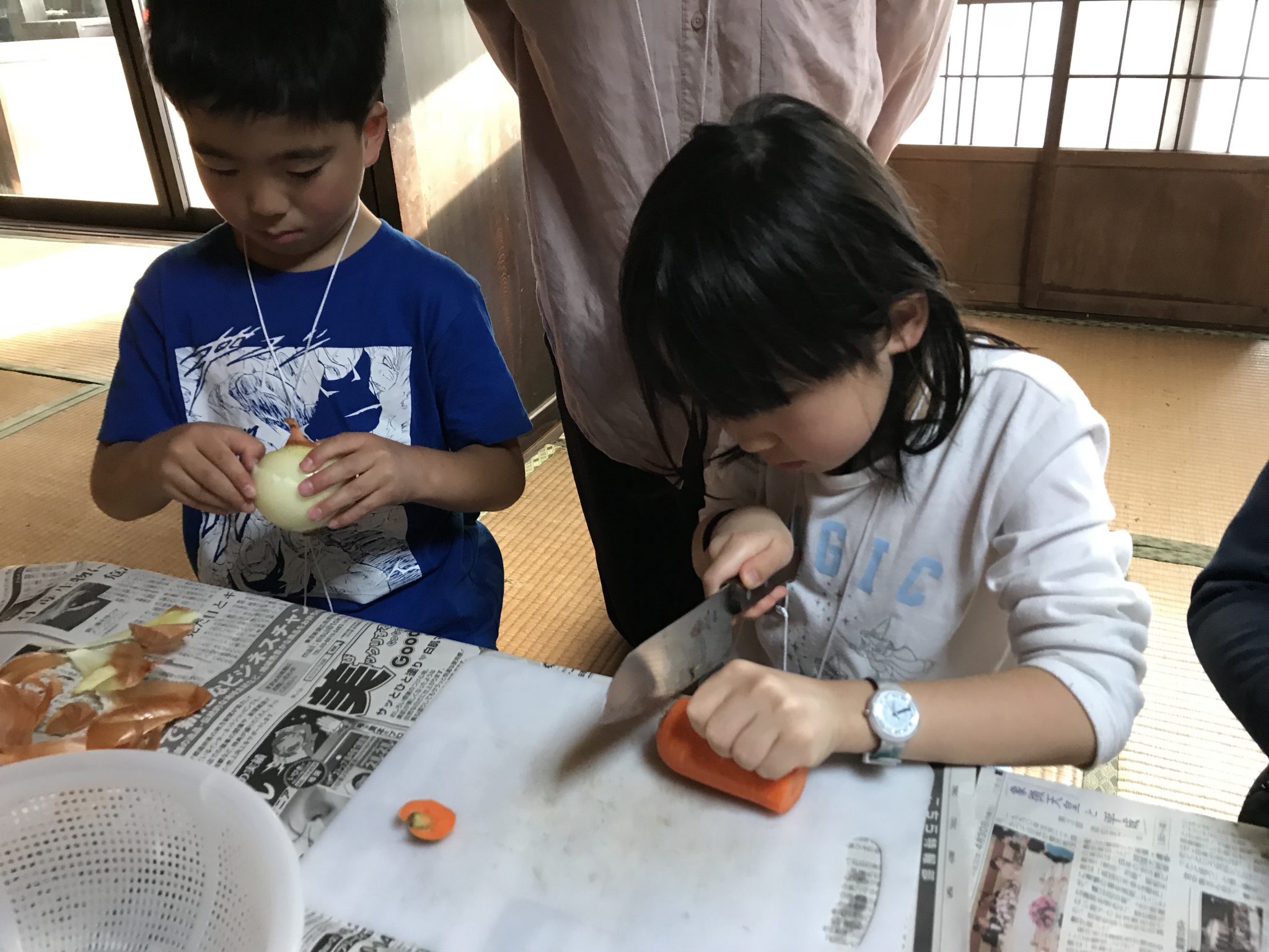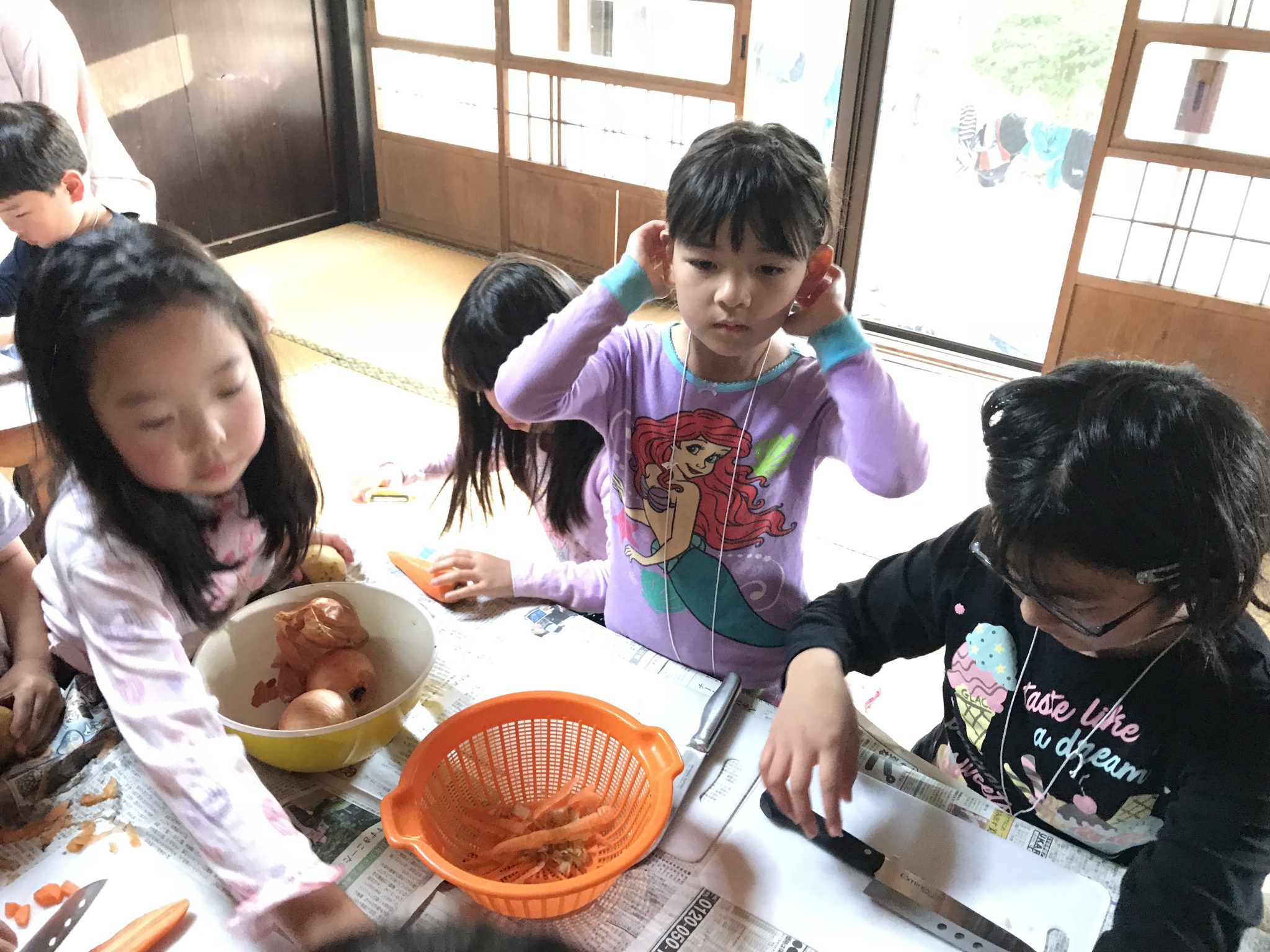 里山キャンプメンバーは、お風呂に入り、夕食作りを始めました! 今晩のメニューはカレーです。 みんなで協力して作っています。