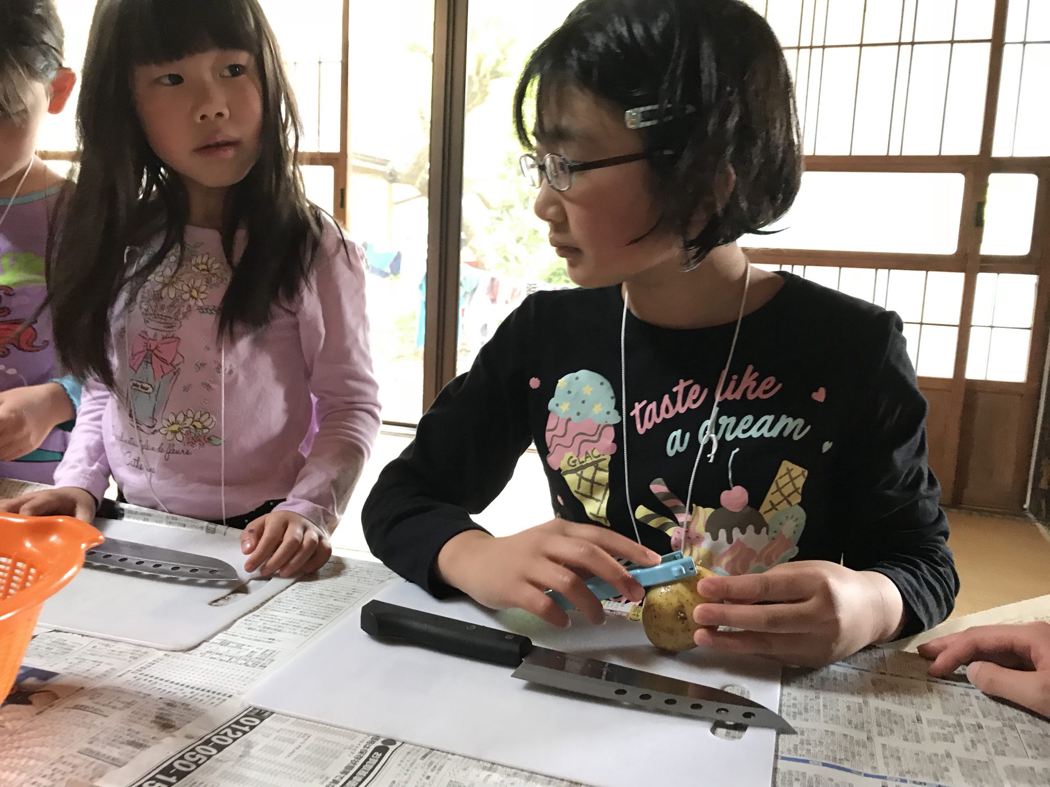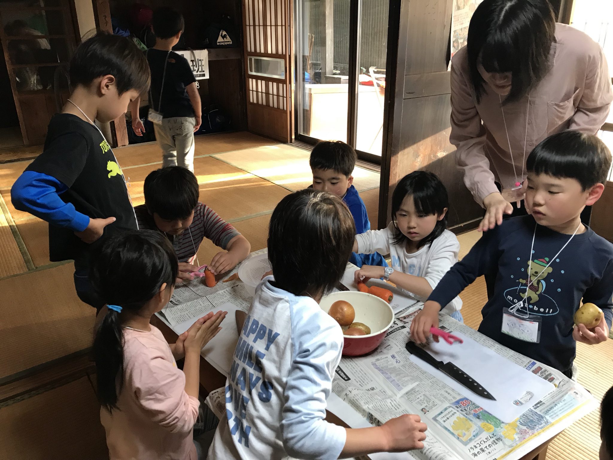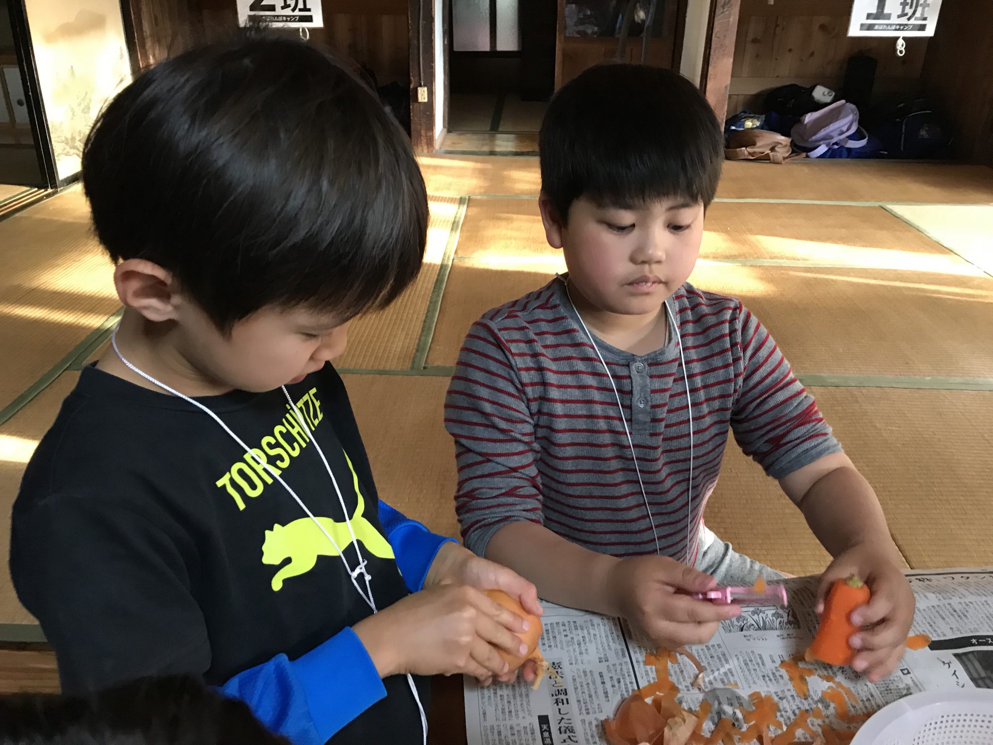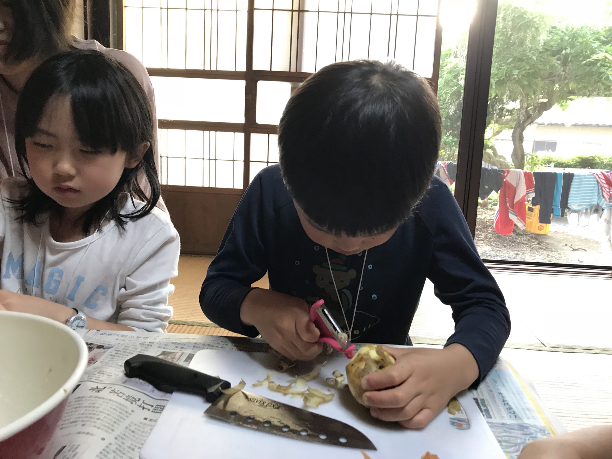 里山キャンプメンバーは、お風呂に入り、夕食作りを始めました! 今晩のメニューはカレーです。 みんなで協力して作っています。