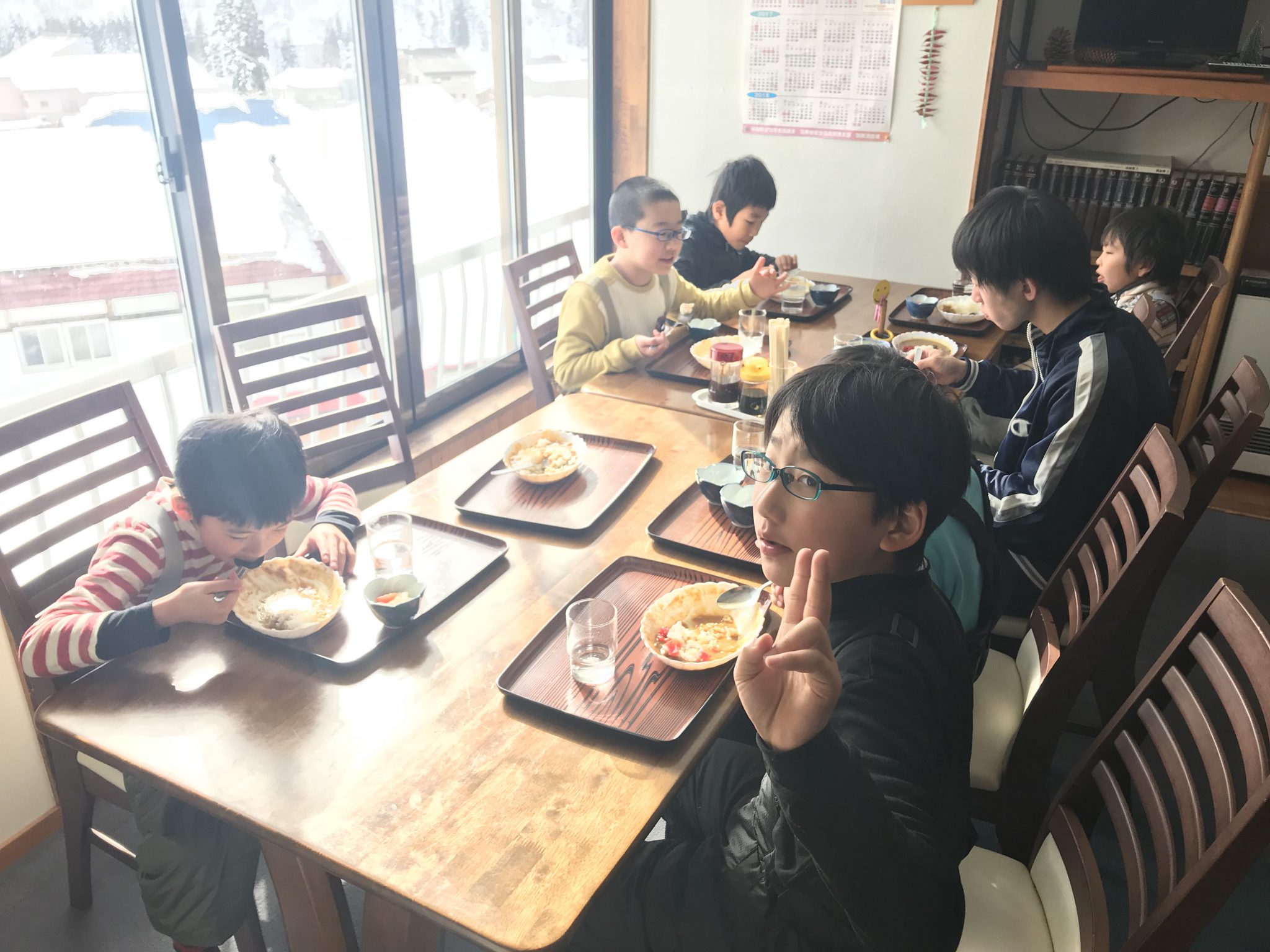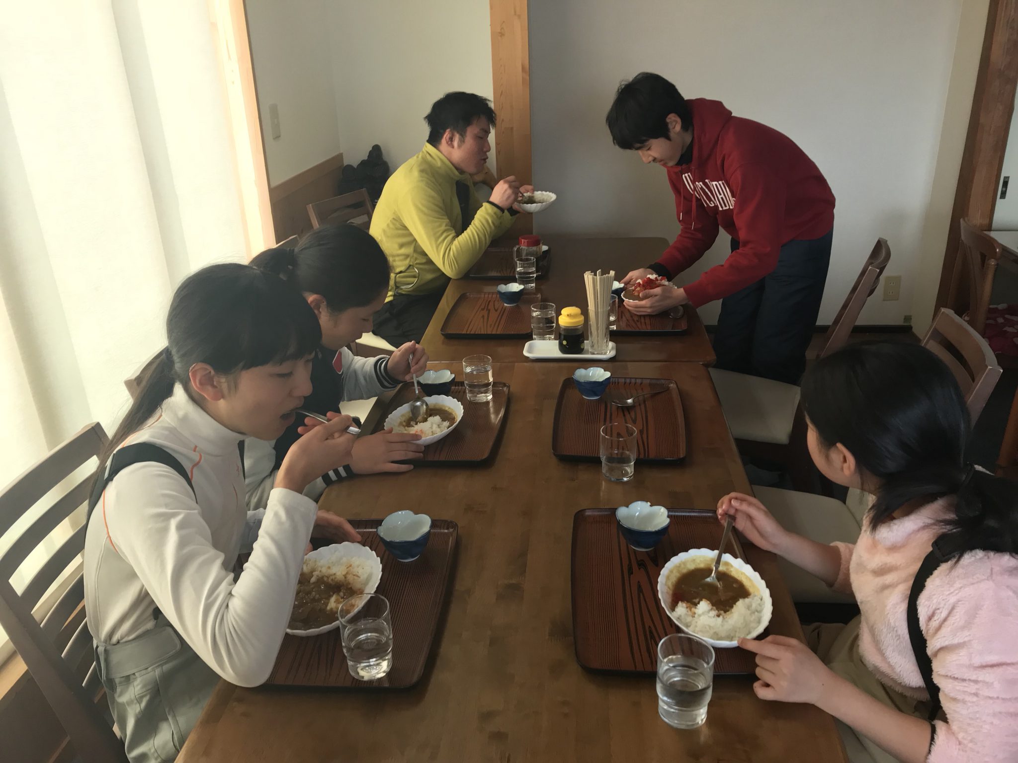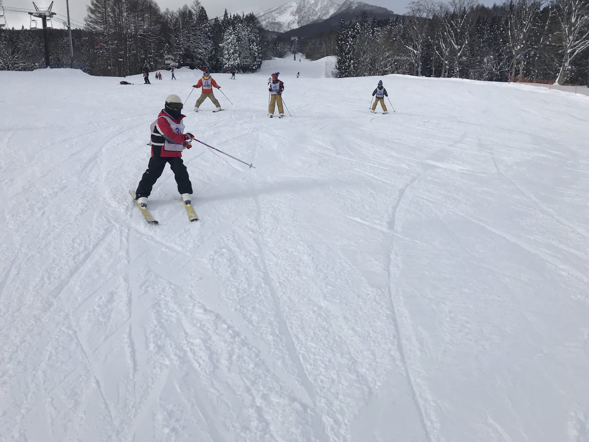 スキー教室メンバーはお昼のカレーをお腹いっぱい食べ、午後のスキーに出発しました! 集中・上達コースは検定。 体験コースは自由スキーをします。 検定組は緊張した面持ちでスキーに向かいました。