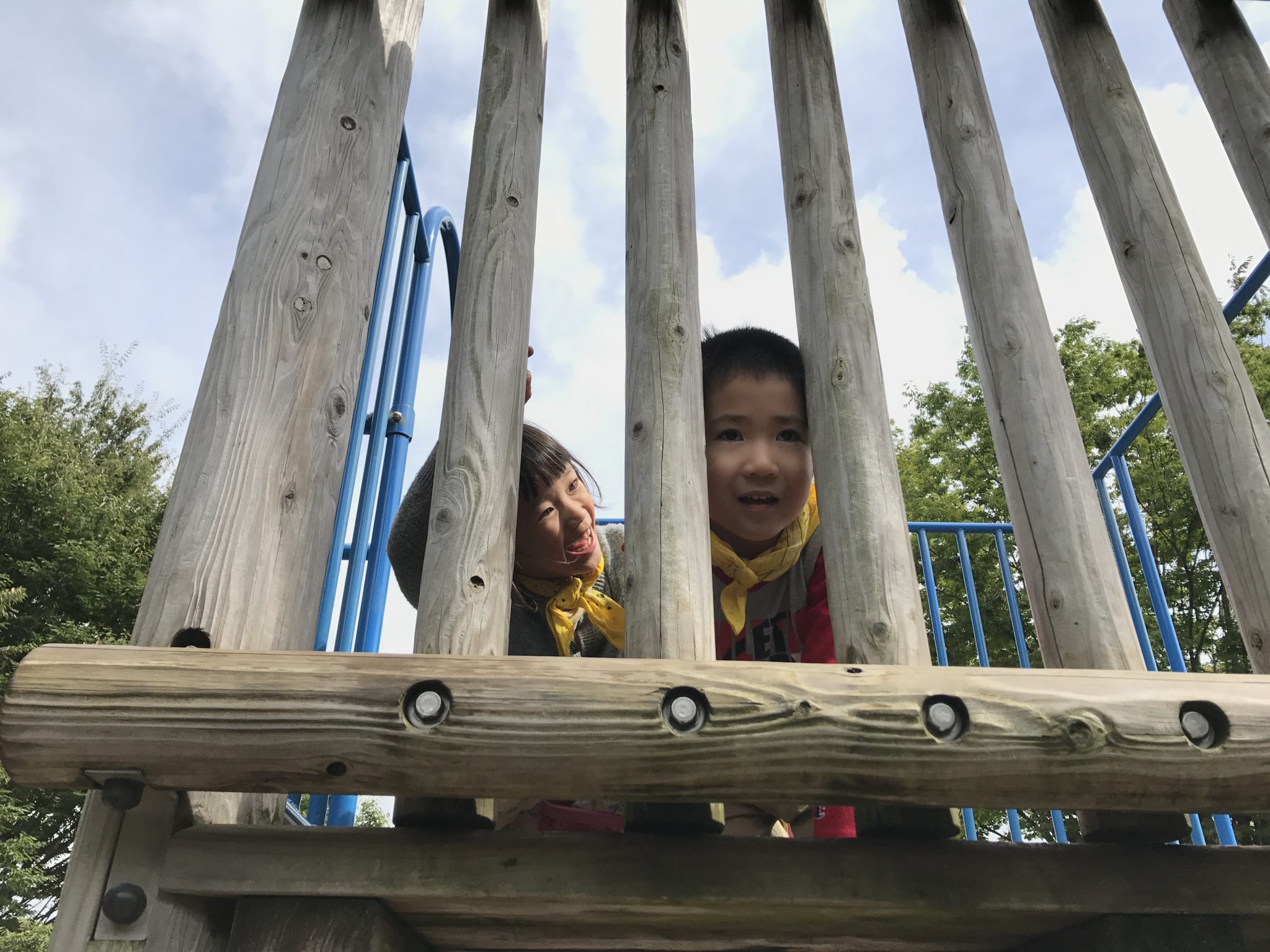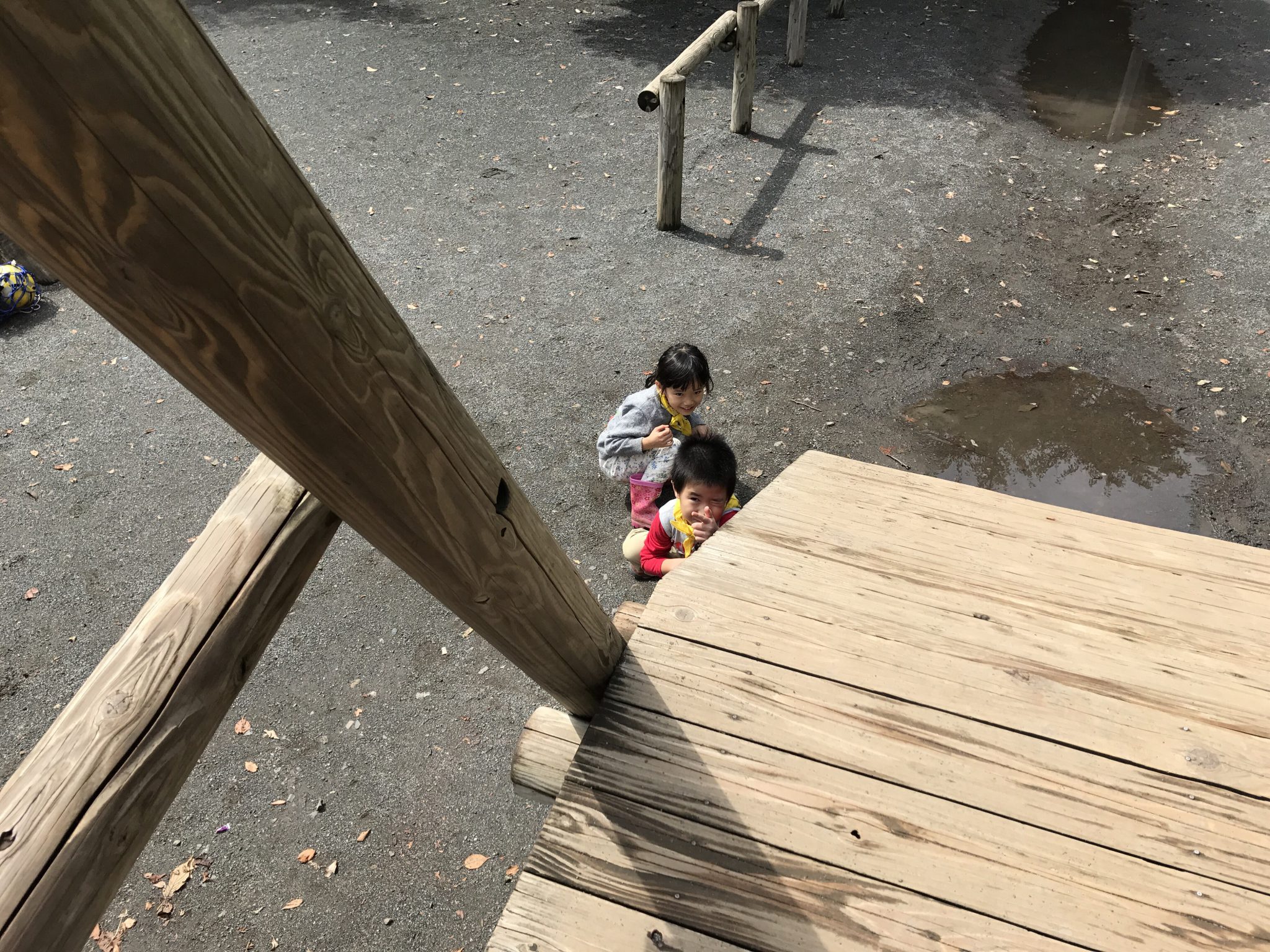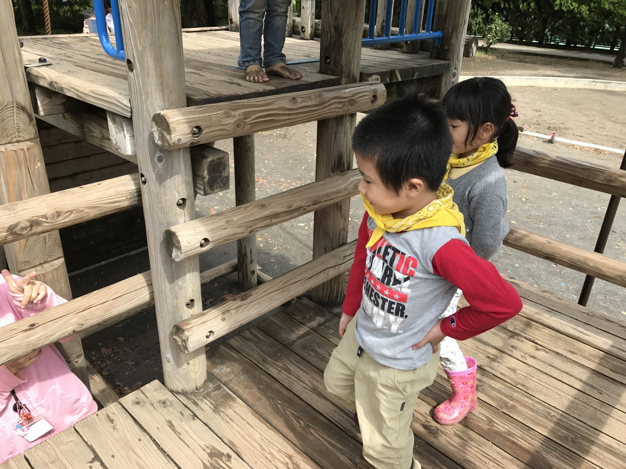 森のようちえんメンバーはお昼ご飯を残さず食べ、遊具で遊び始めました! 遊具を使って戦いごっこや宝探しをしています。