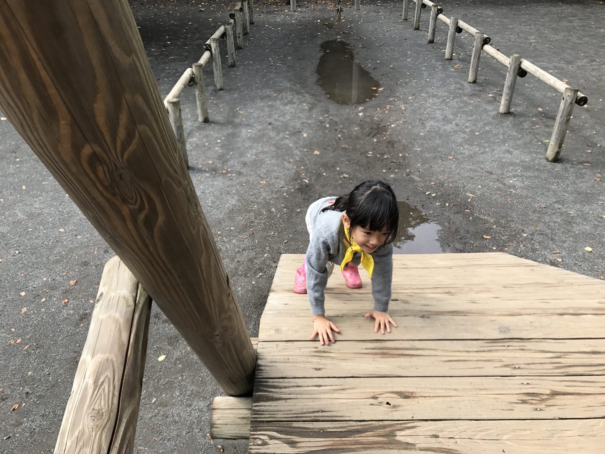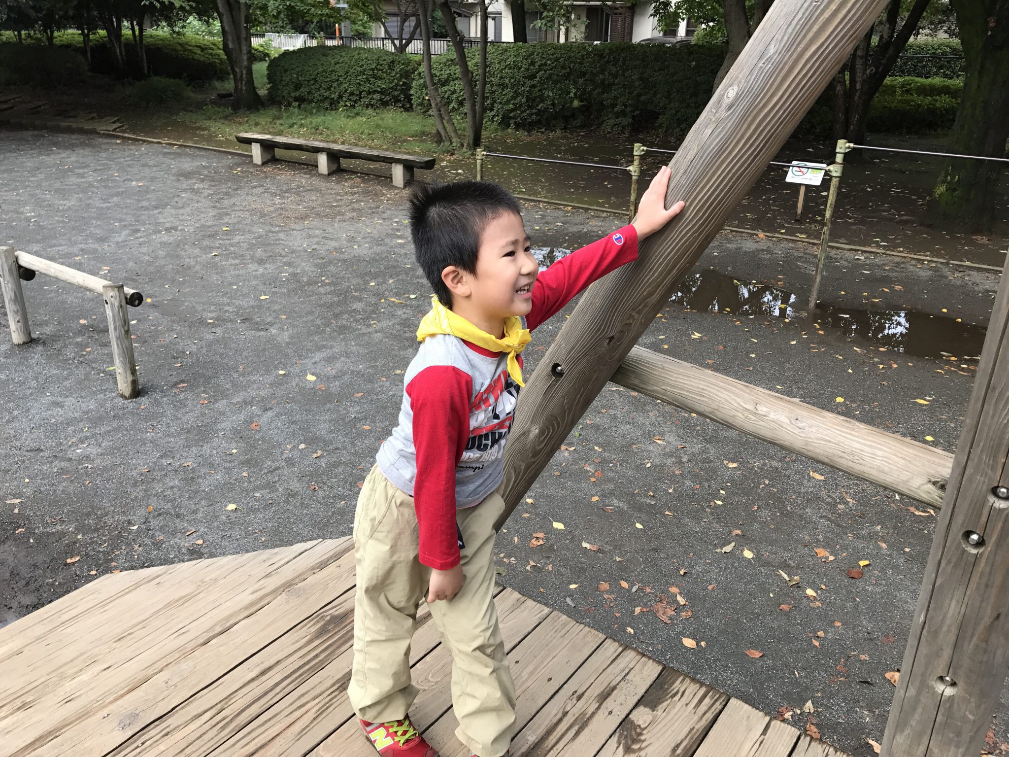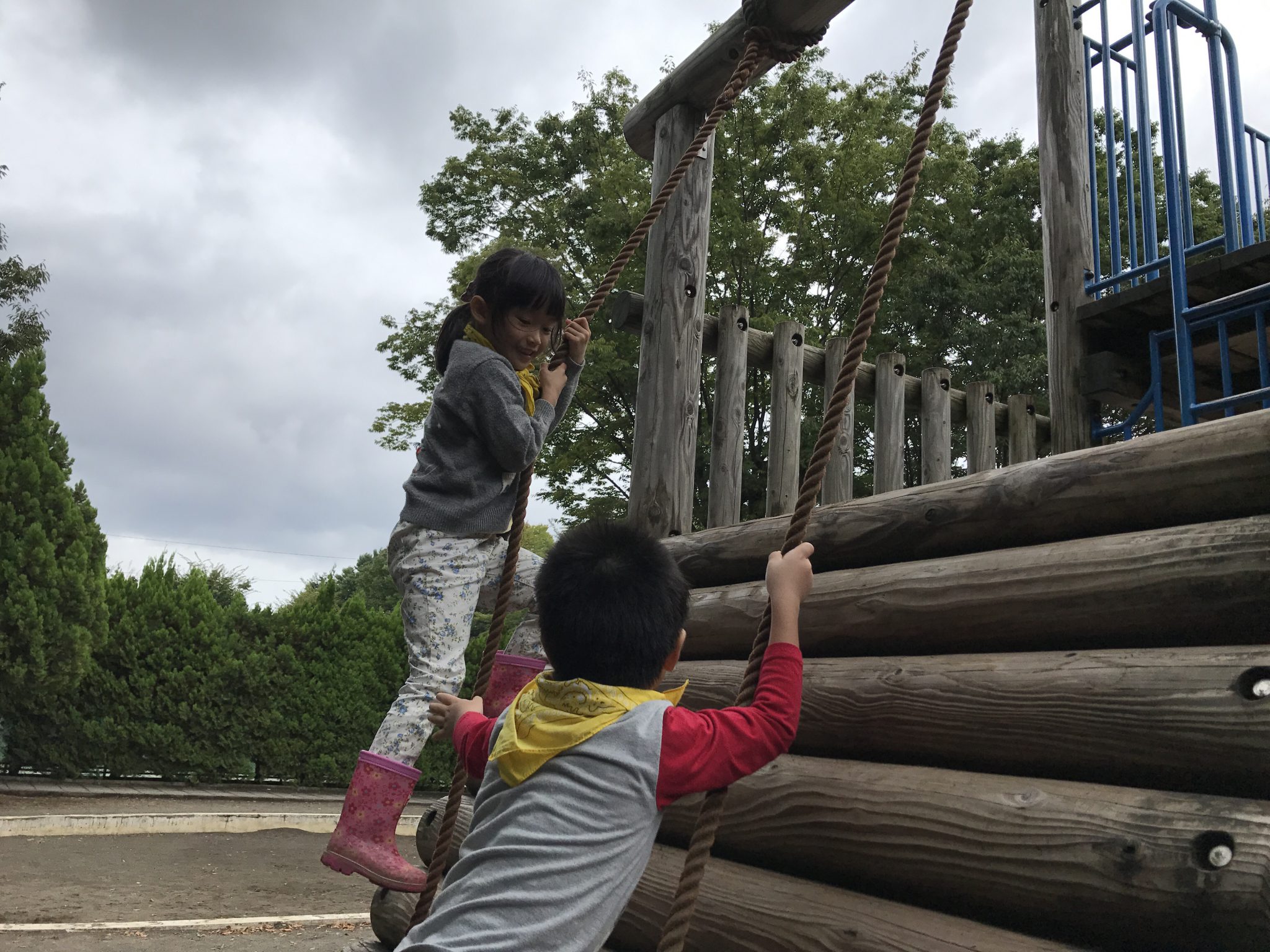 森のようちえんメンバーはお昼ご飯を残さず食べ、遊具で遊び始めました! 遊具を使って戦いごっこや宝探しをしています。
