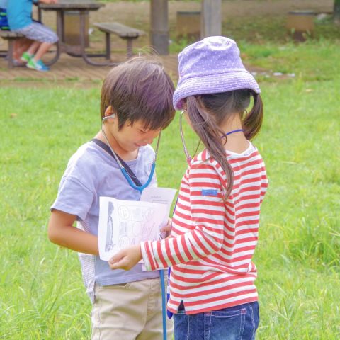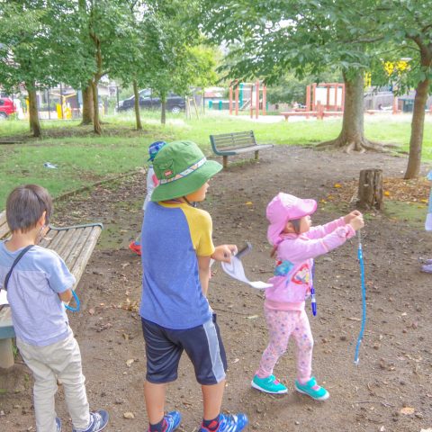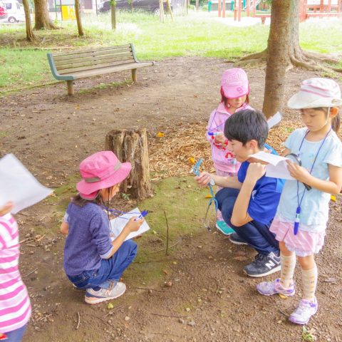 水路でドングリを流し競争したり、虫眼鏡でキノコを見てみたり、遊具を使って鬼ごっこをしてみたりとただ遊ぶだけでなく、友達と一緒に遊びを考え、子ども達なりに遊んでいました。