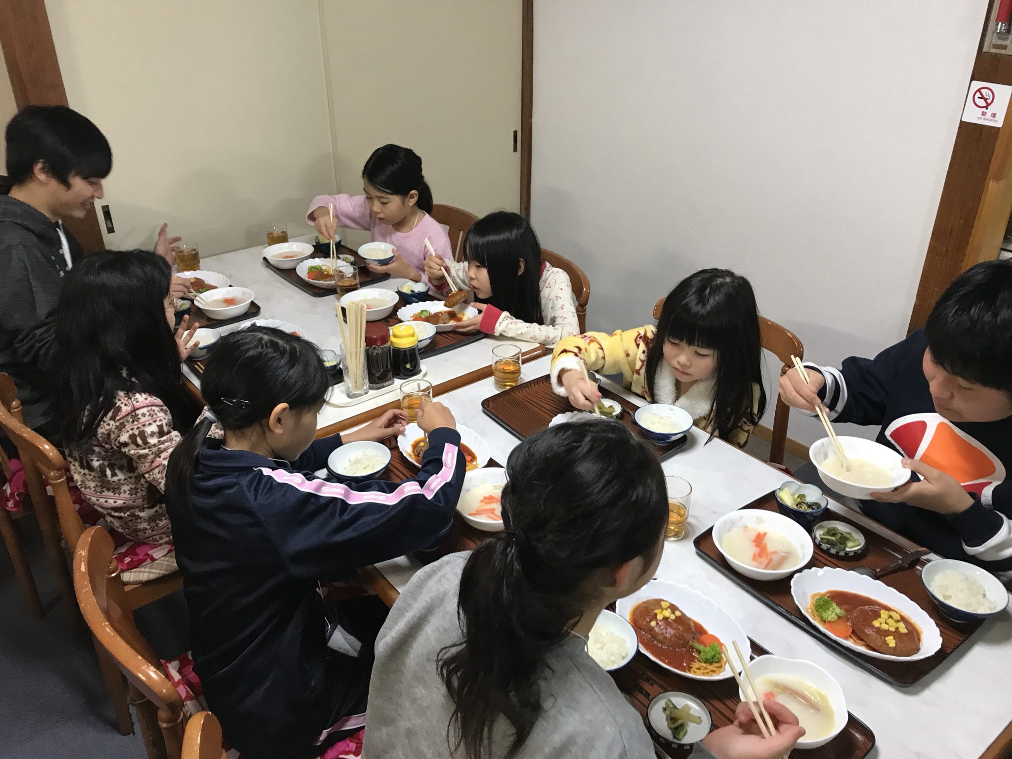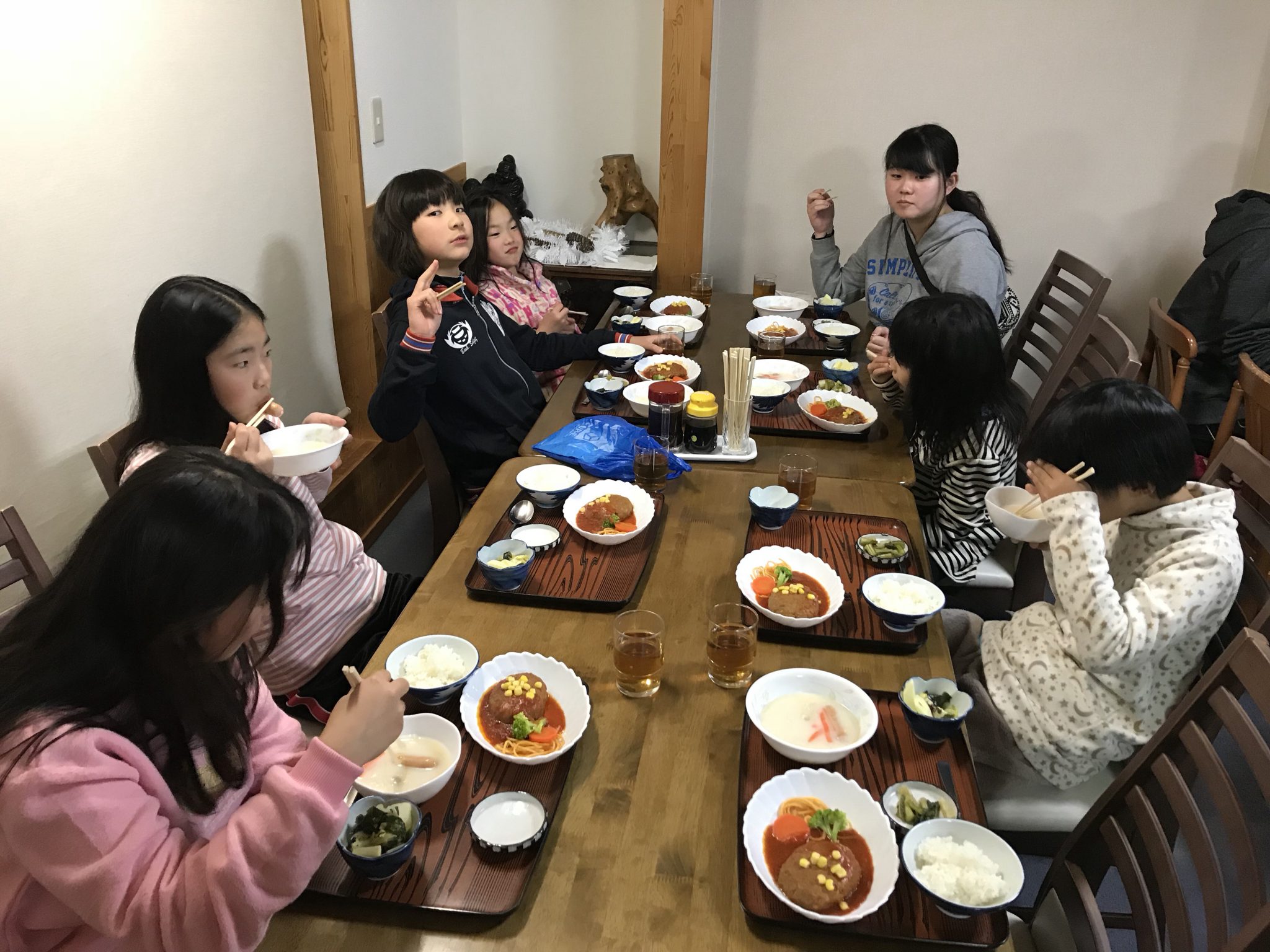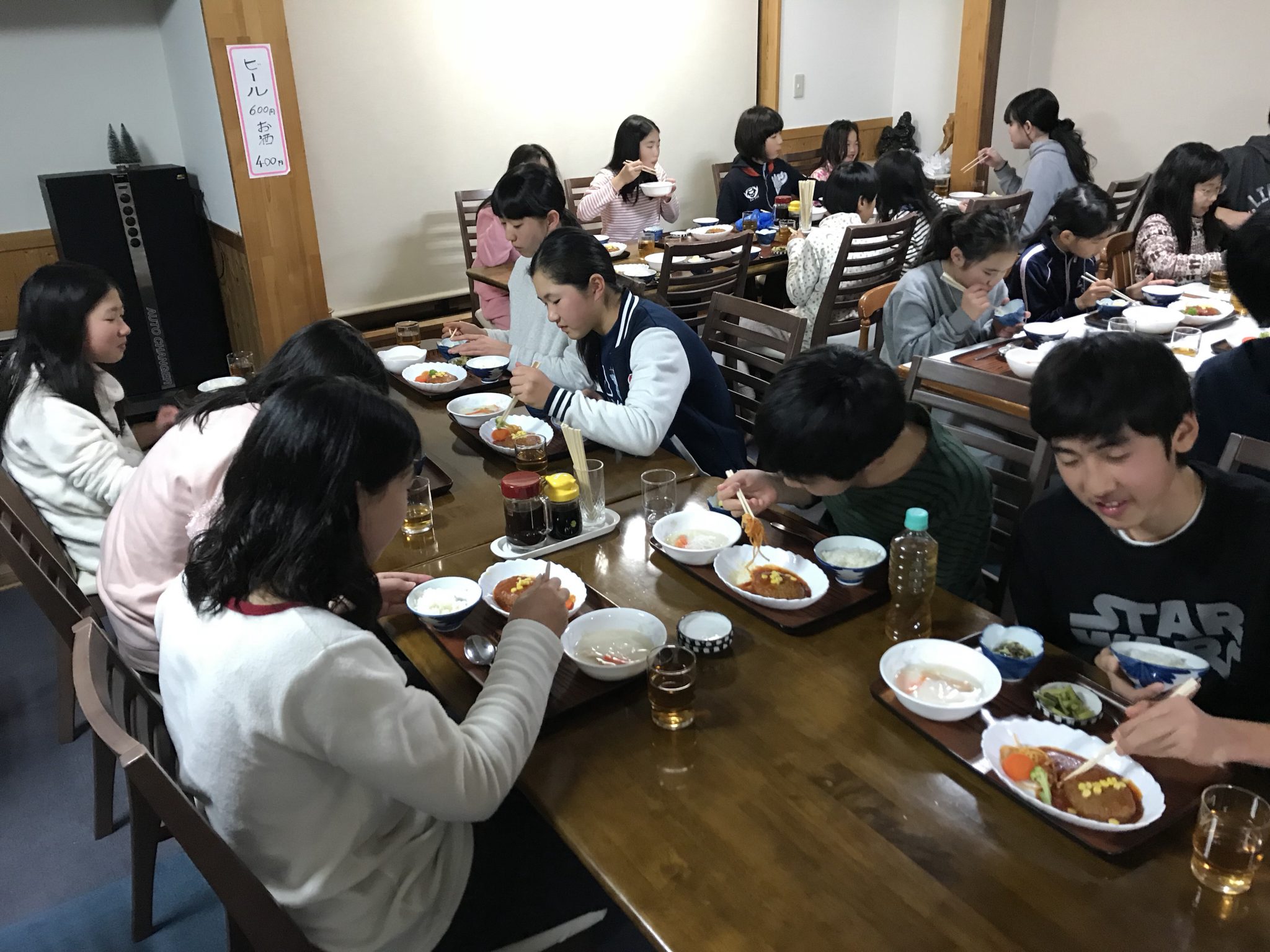 スキー教室メンバーはお風呂に入り、ご飯を食べてます。 体験コースメンバーが合流してはじめての食事。 会話が弾みます! スキー中の様子は21時以降にアップさせていただきます。