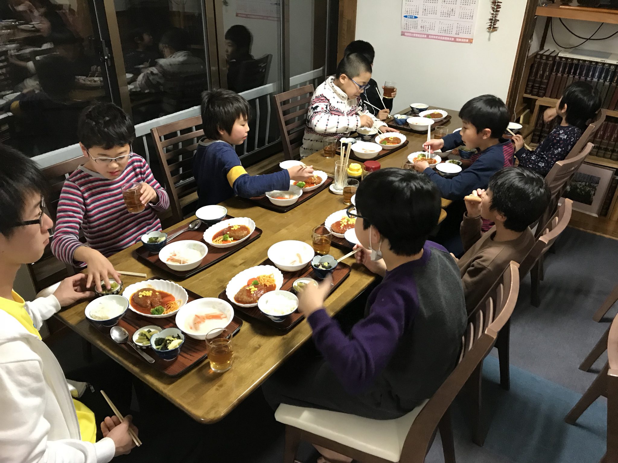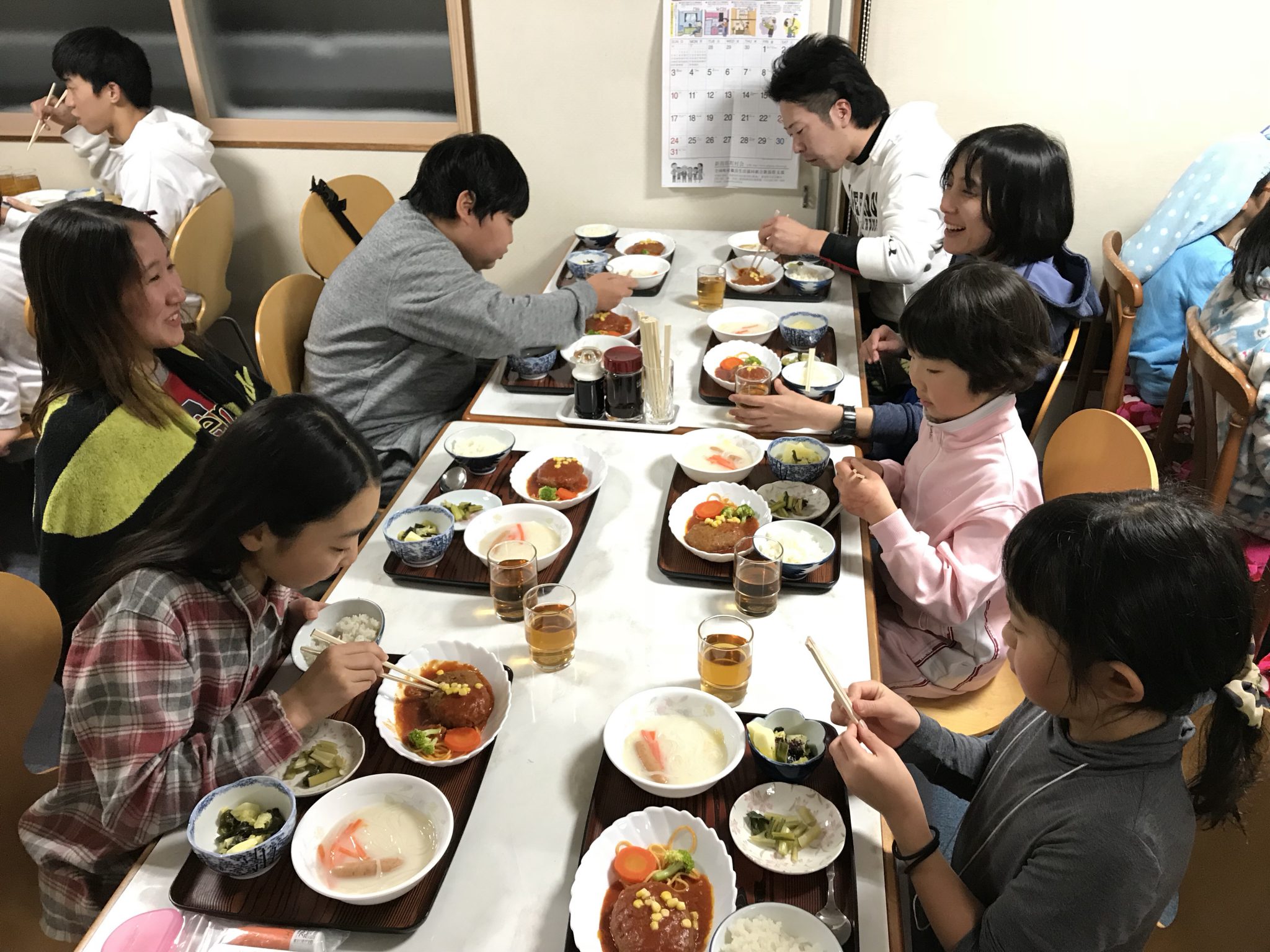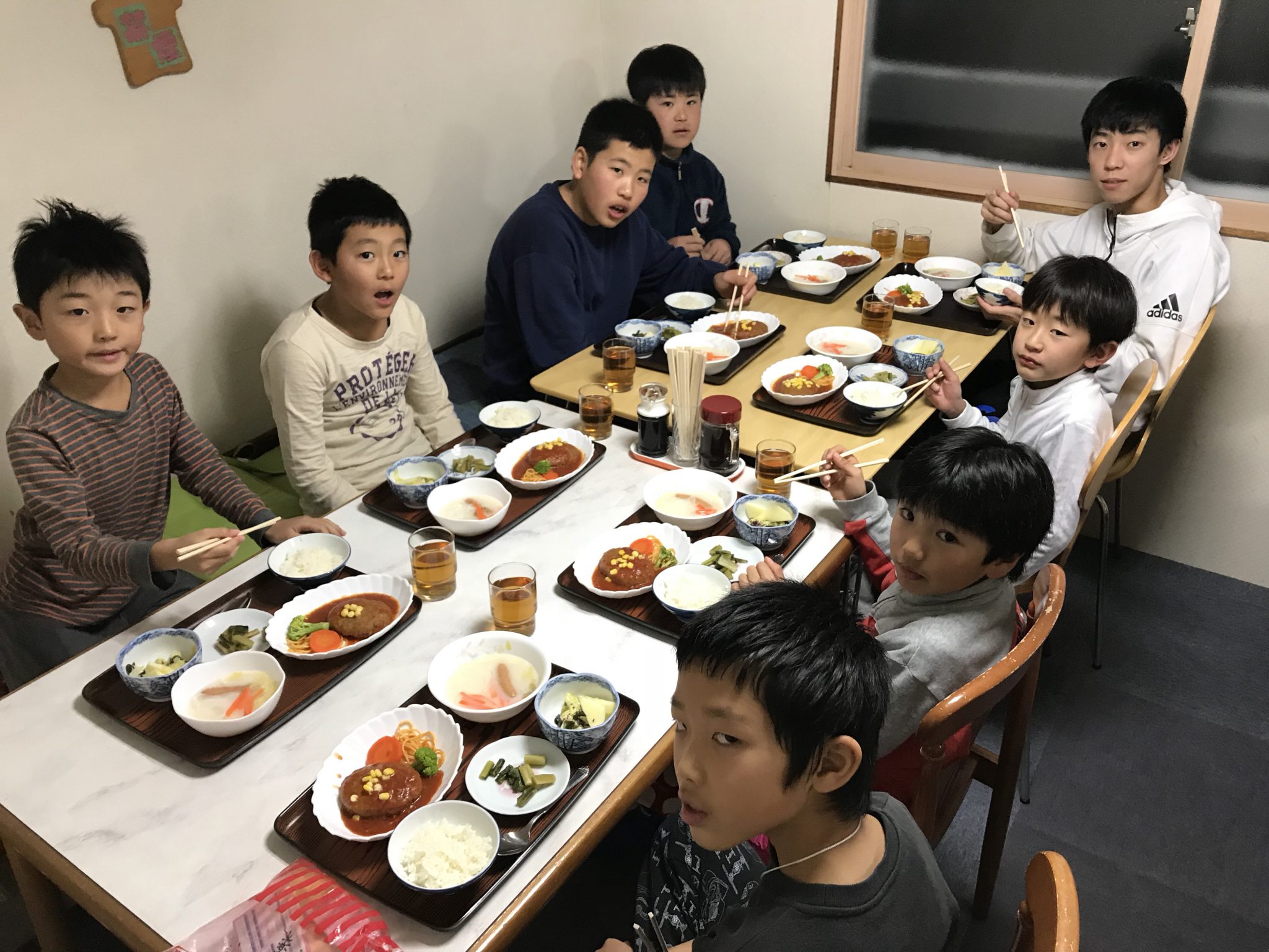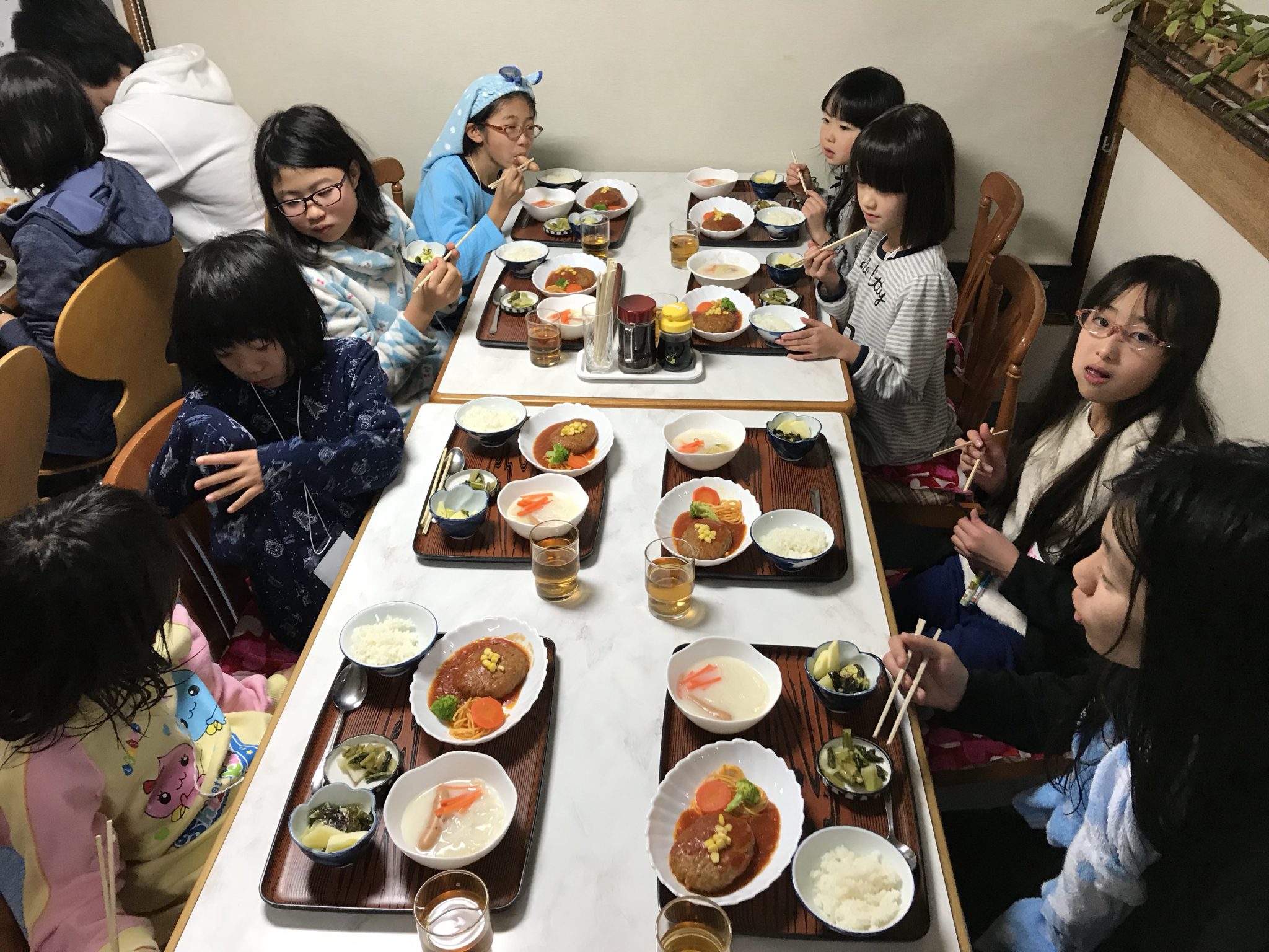 スキー教室メンバーはお風呂に入り、ご飯を食べてます。 体験コースメンバーが合流してはじめての食事。 会話が弾みます! スキー中の様子は21時以降にアップさせていただきます。