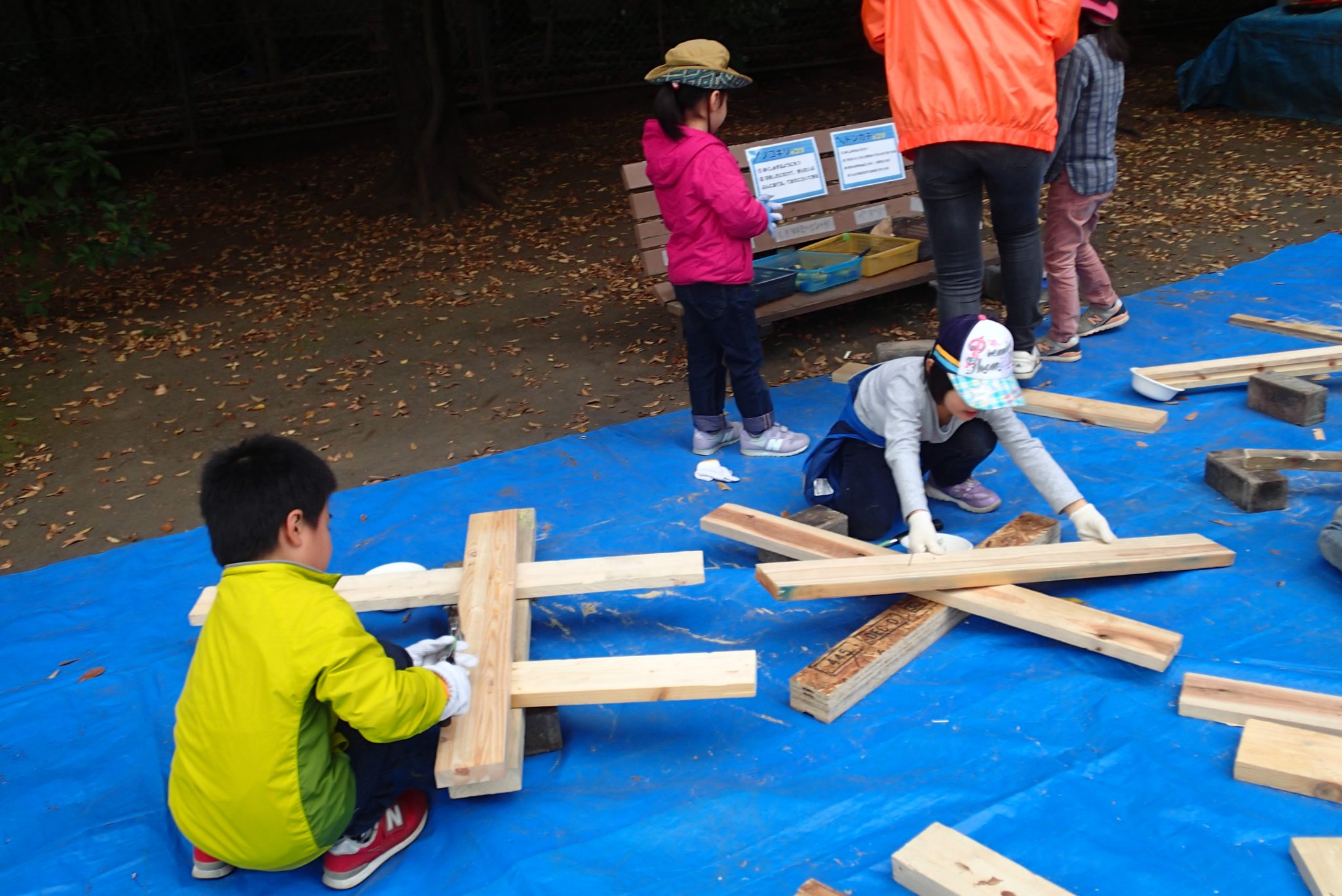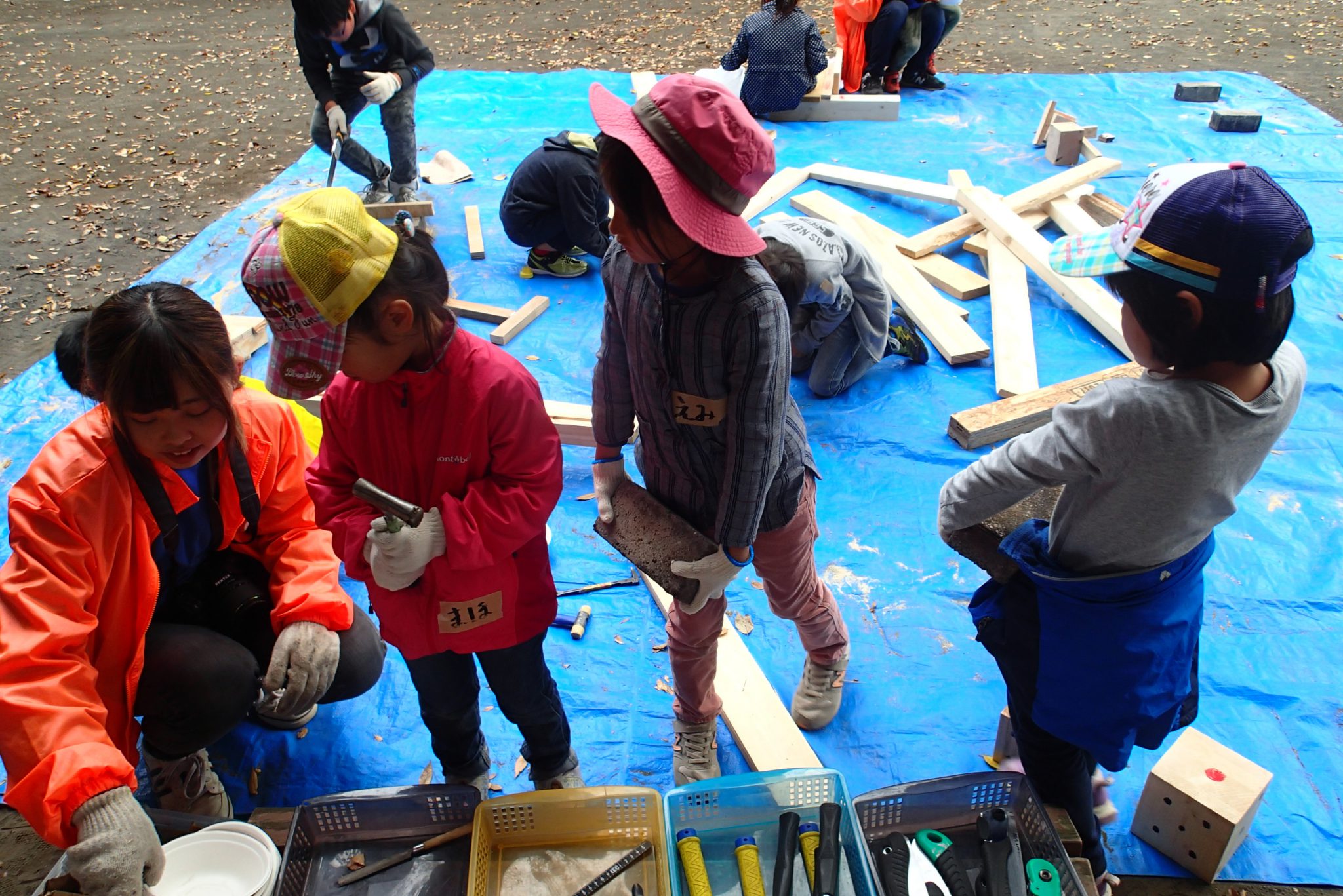 小学生のお兄さんお姉さんに積極的に話しかけ、のこぎりの使い方を習ったり、火遊びをしてみたり、手作りブランコに乗せてもらったりと普段はできないことを楽しんでいるように感じました。