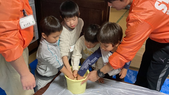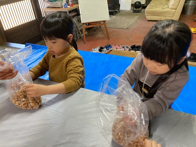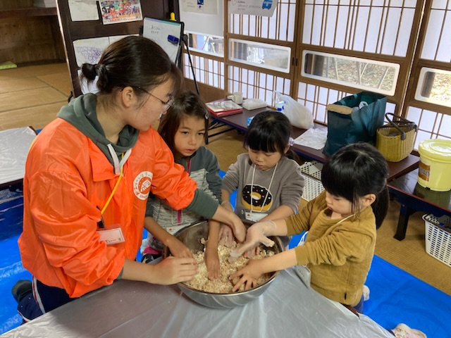 子どもたちも一生懸命大豆を潰し、丸めて味噌仕込み。