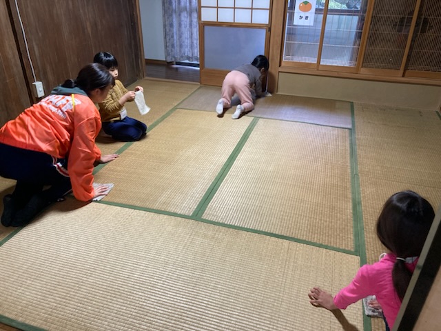 秋のちびっ子キャンプメンバーは、2日間過ごした古民家の掃除をしています。