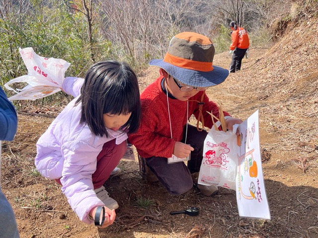 古民家周辺の探検マップを持ち、虫メガネを使って自然をたくさん観察しています。