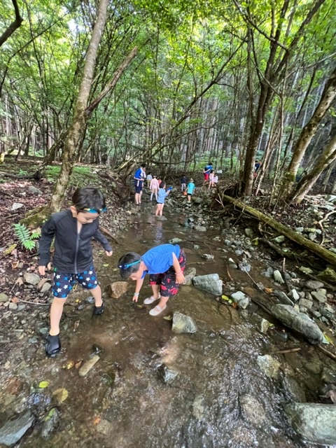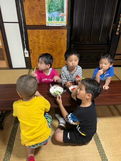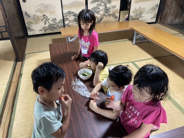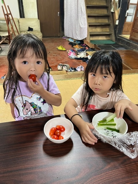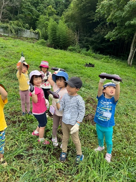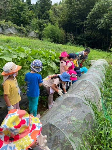 ちびっ子キャンプメンバーは、夜ご飯で食べる野菜を収穫しに畑に行きました。