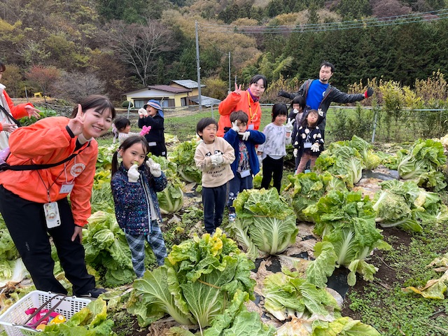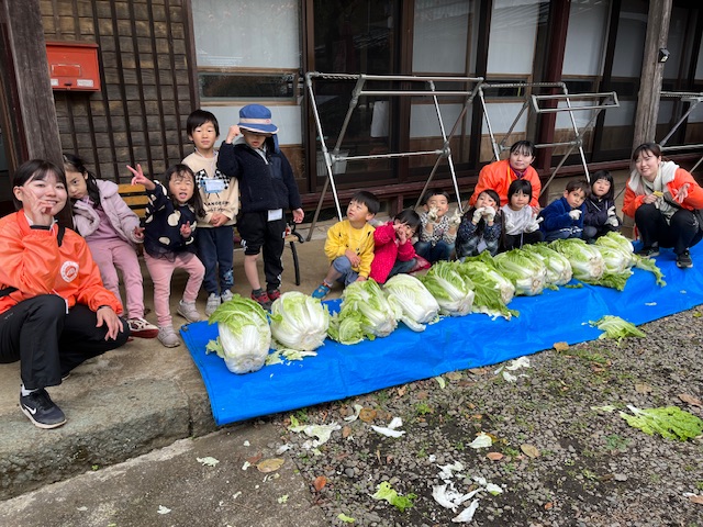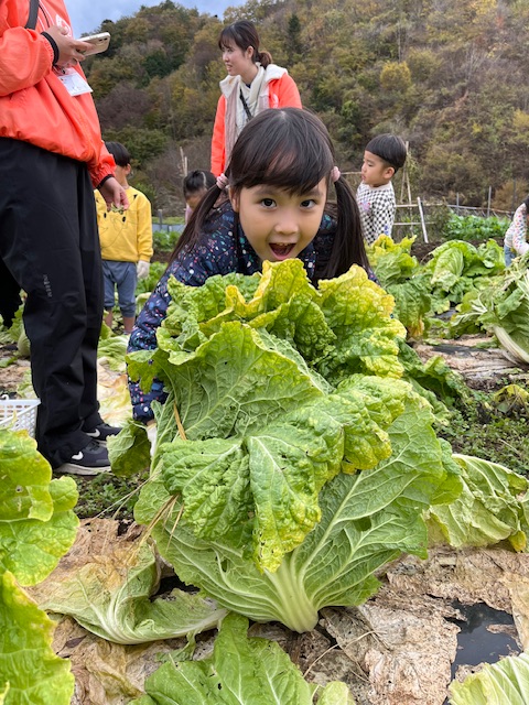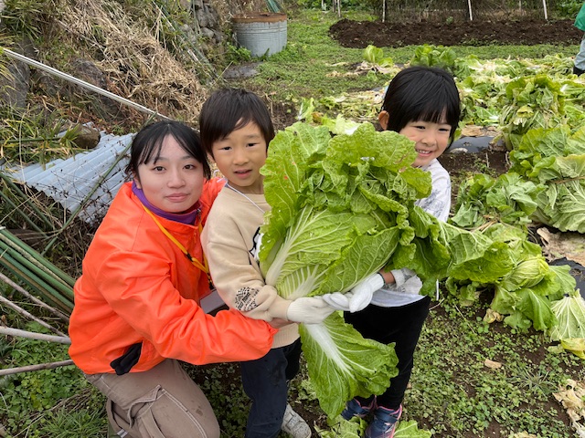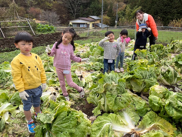 秋のちびっ子キャンプメンバーは、近くの畑まで白菜収穫に行きました。