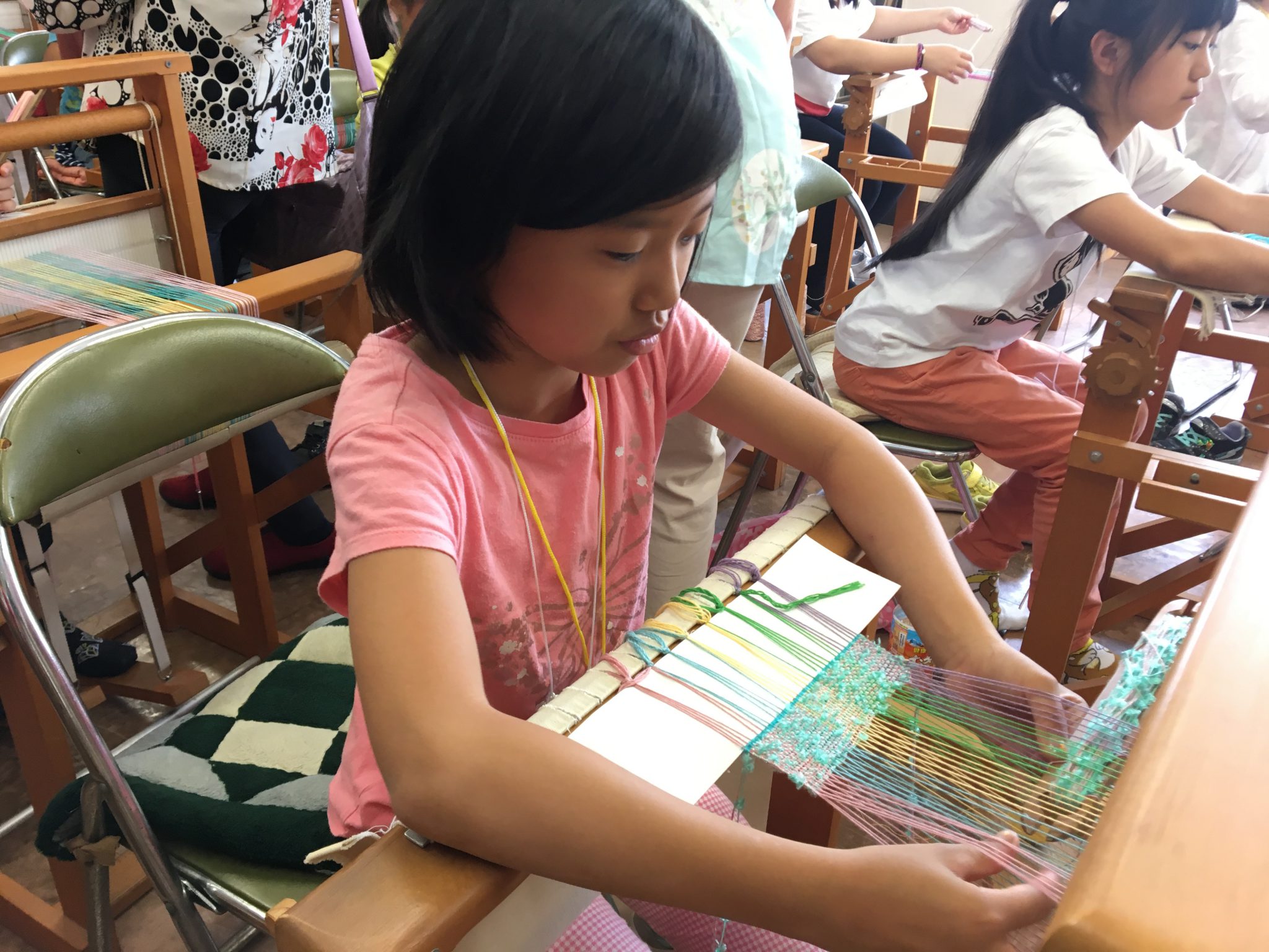 アルクイングリッシュキャンプの一行は織物体験中です。