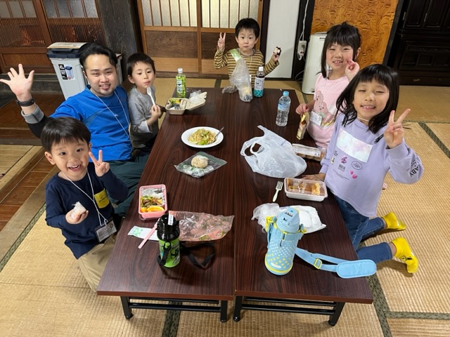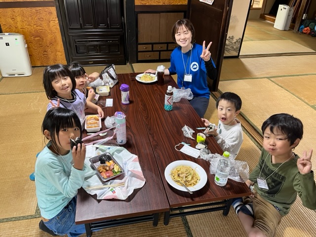 キッズチャレンジキャンプメンバーは、お昼ごはんを食べています。