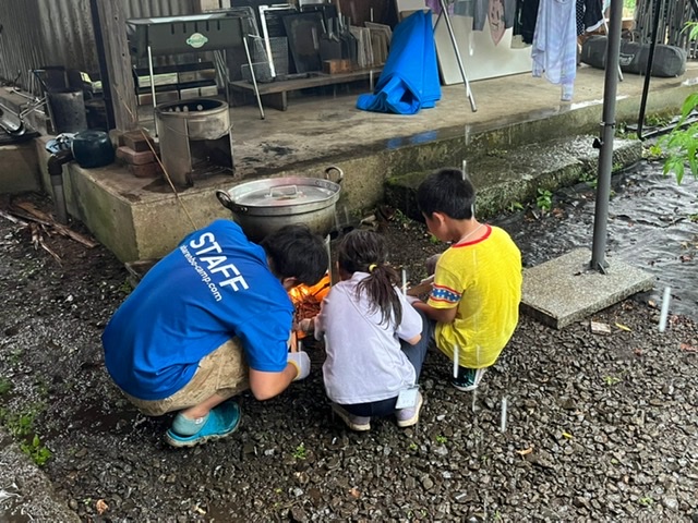 夕食は野外炊事をしましたが、開始と同時に雷雨に…