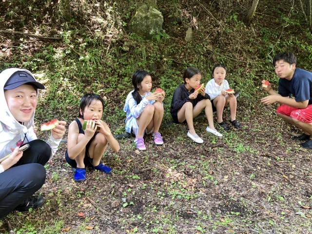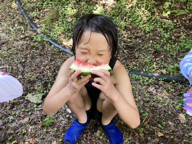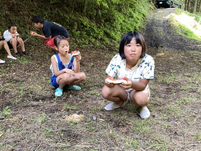 朝作ったお弁当も沢の近くで食べて、デザートにはご近所さんからいただいたスイカ!