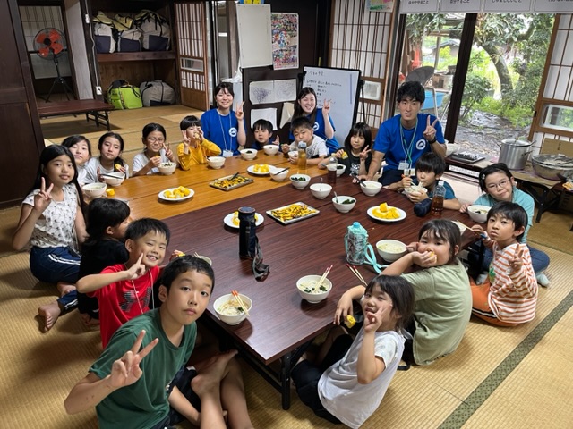 キャンプ最後の食事なのでみんなで大きなテーブルを囲んで食べました。