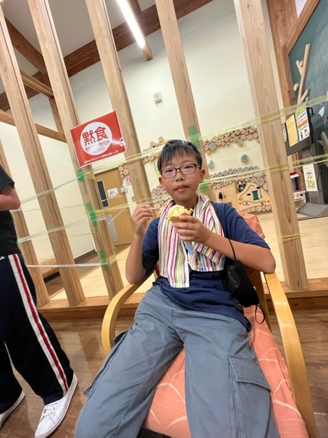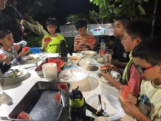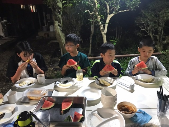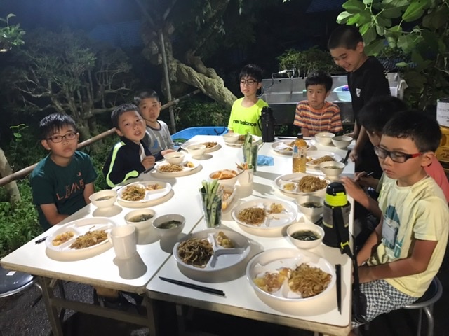 古民家前で夕飯を食べながら今日の遠征についてふり返りました。
