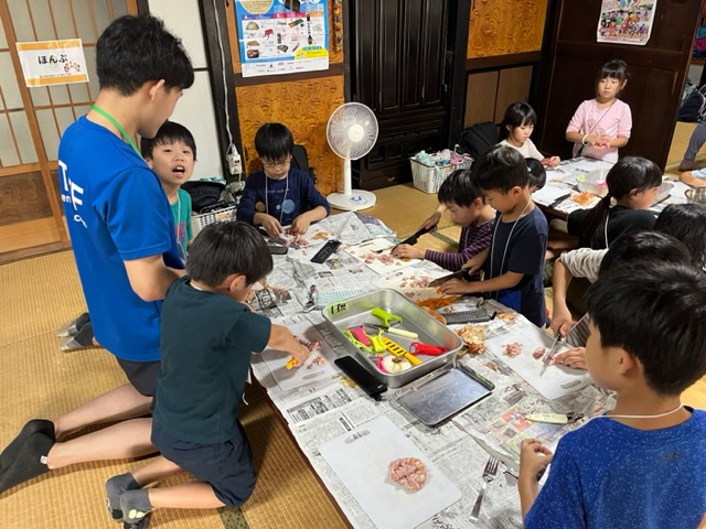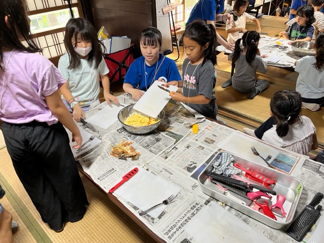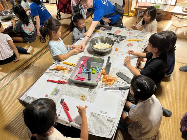 年上のお兄さんお姉さんたちが見本を見せながらスムーズに野菜とお肉を切ることができました。