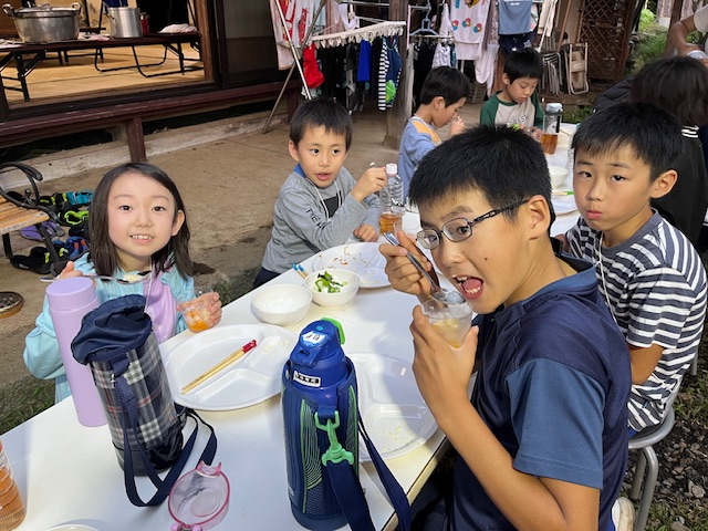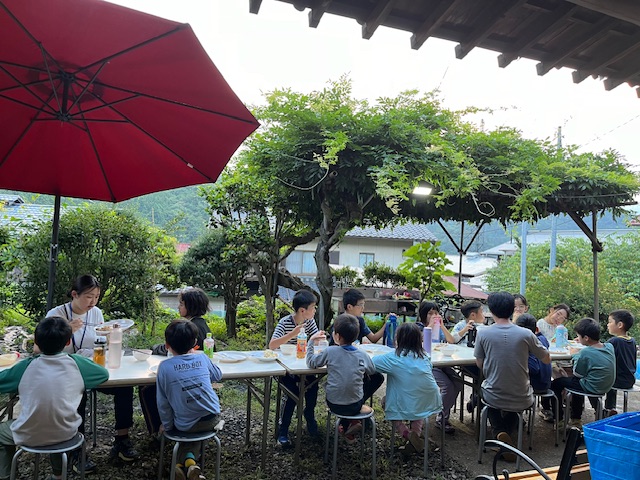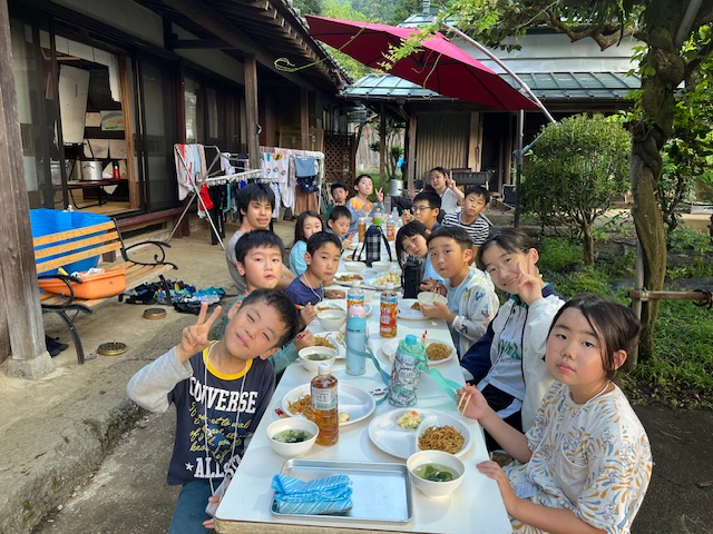 キャンプ最後の夜は古民家前でみんなでテーブルを囲み食事。