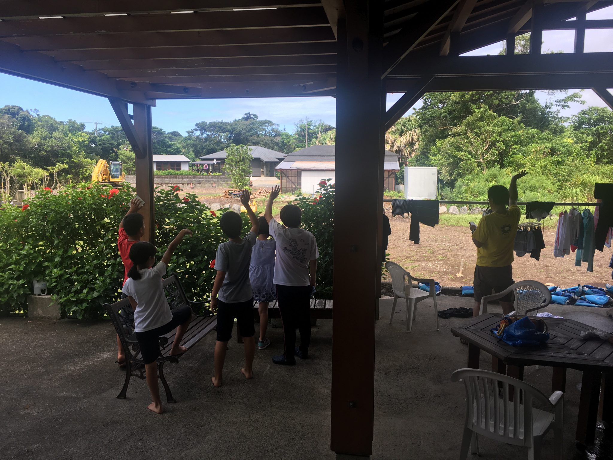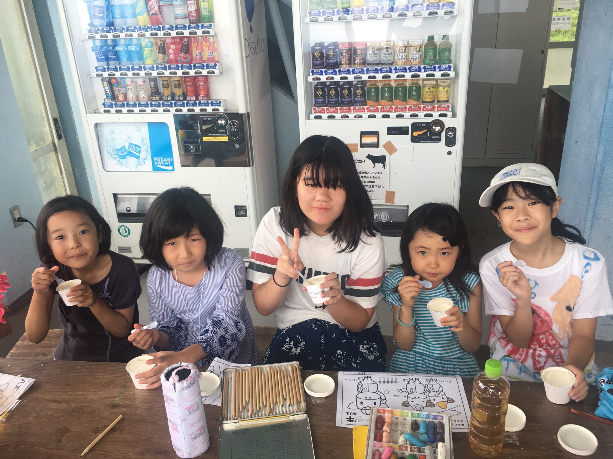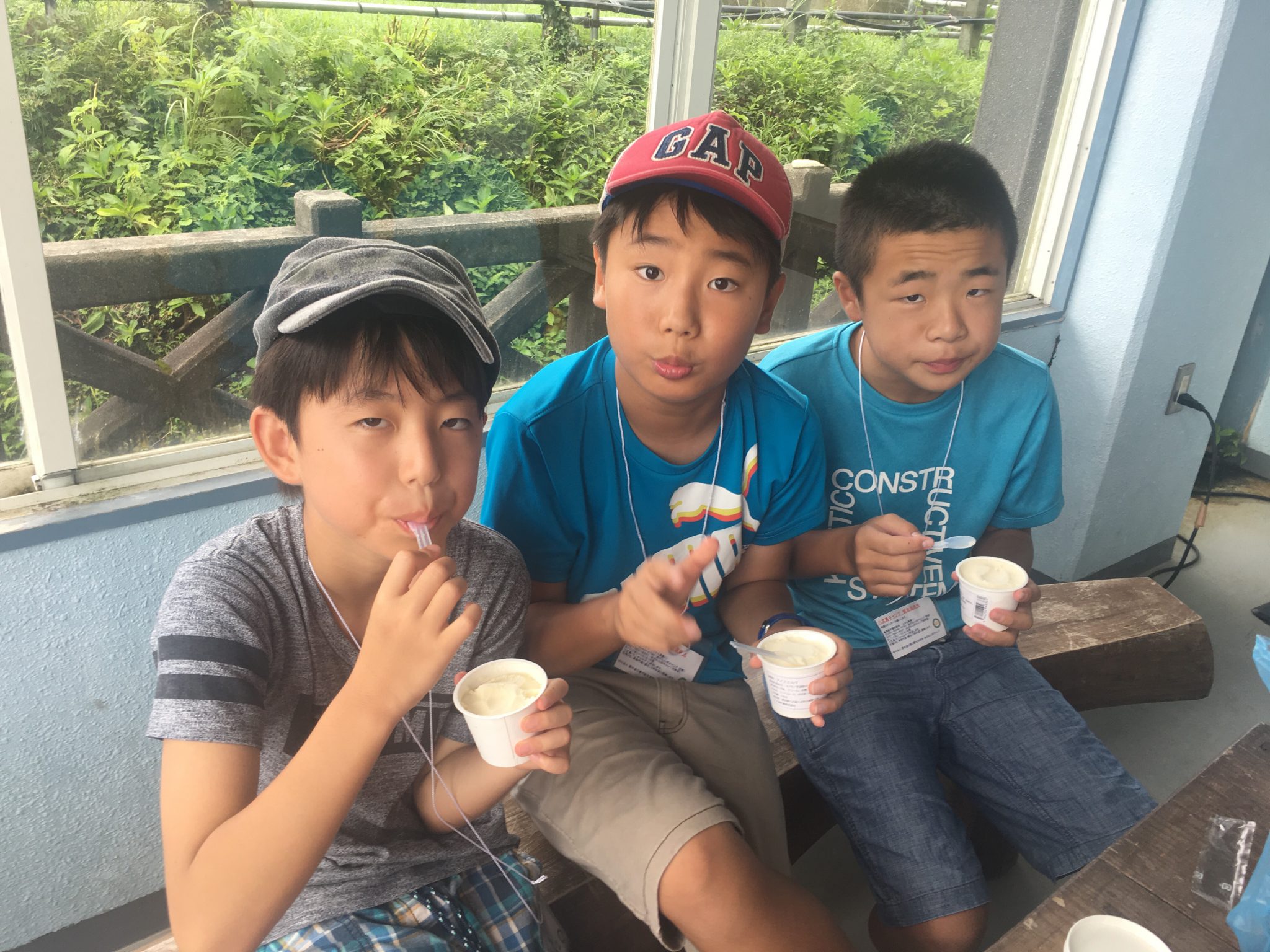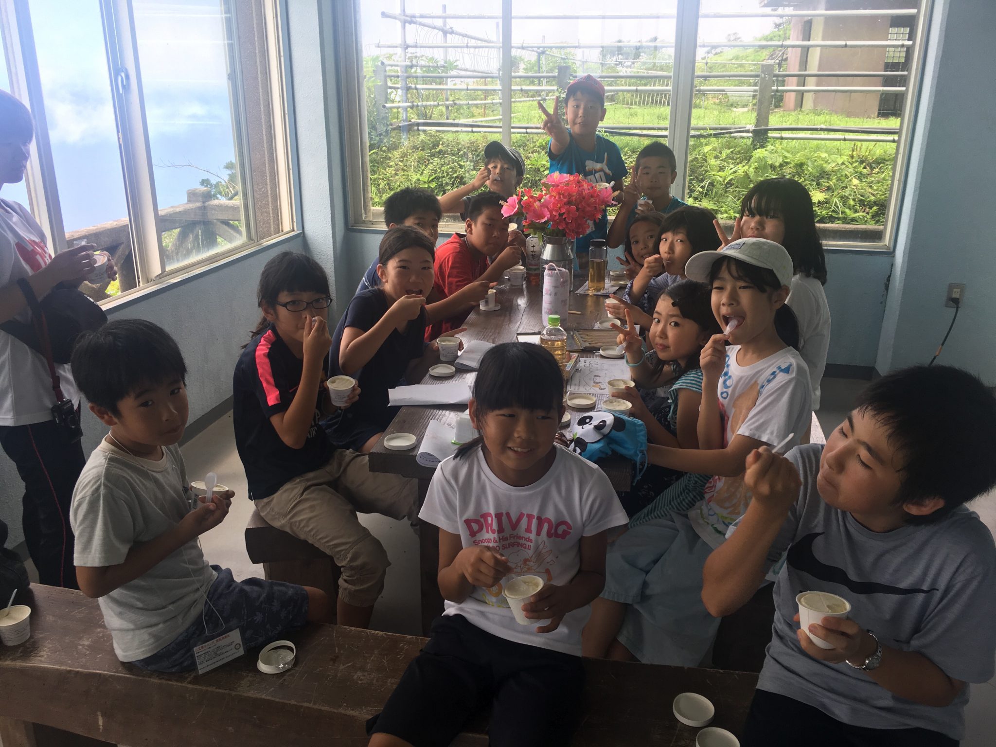 八丈島キャンプの一行は、昨晩夜更かしをしたので、9時にゆっくり起き、お家へのハガキを書くなど、ゆっくり過ごしました。 島でパンを焼いて販売されているお店の惣菜パンで軽めの朝食をとり、牧場に散策にきました。みんなが楽しみにしていたジェラードをいただいて満足の一同でした。午後は活動盛りだくさんです!