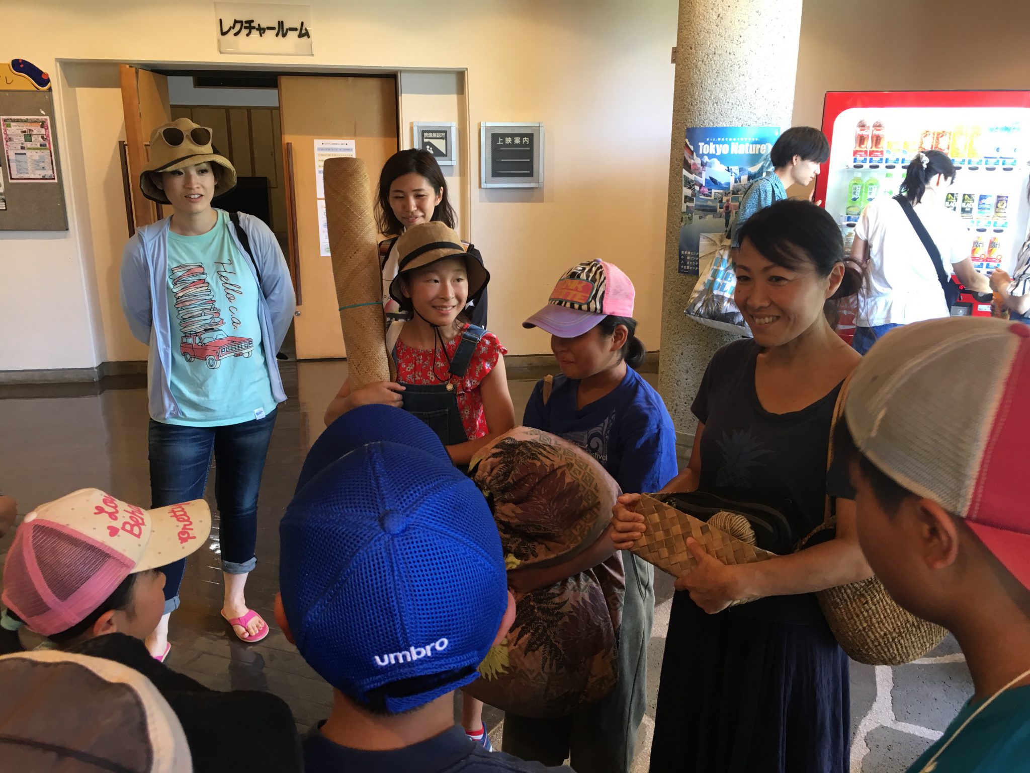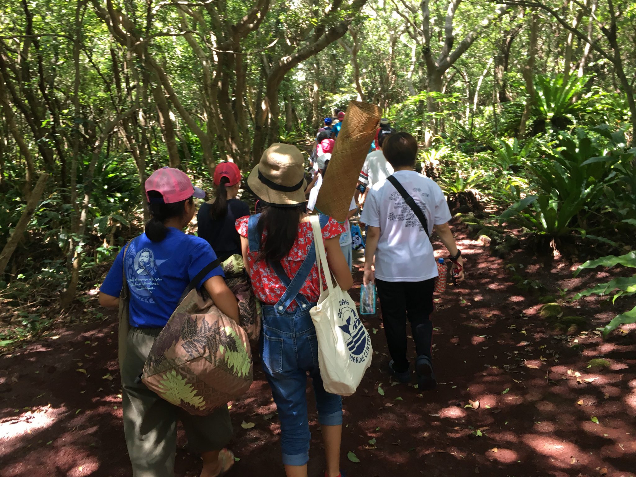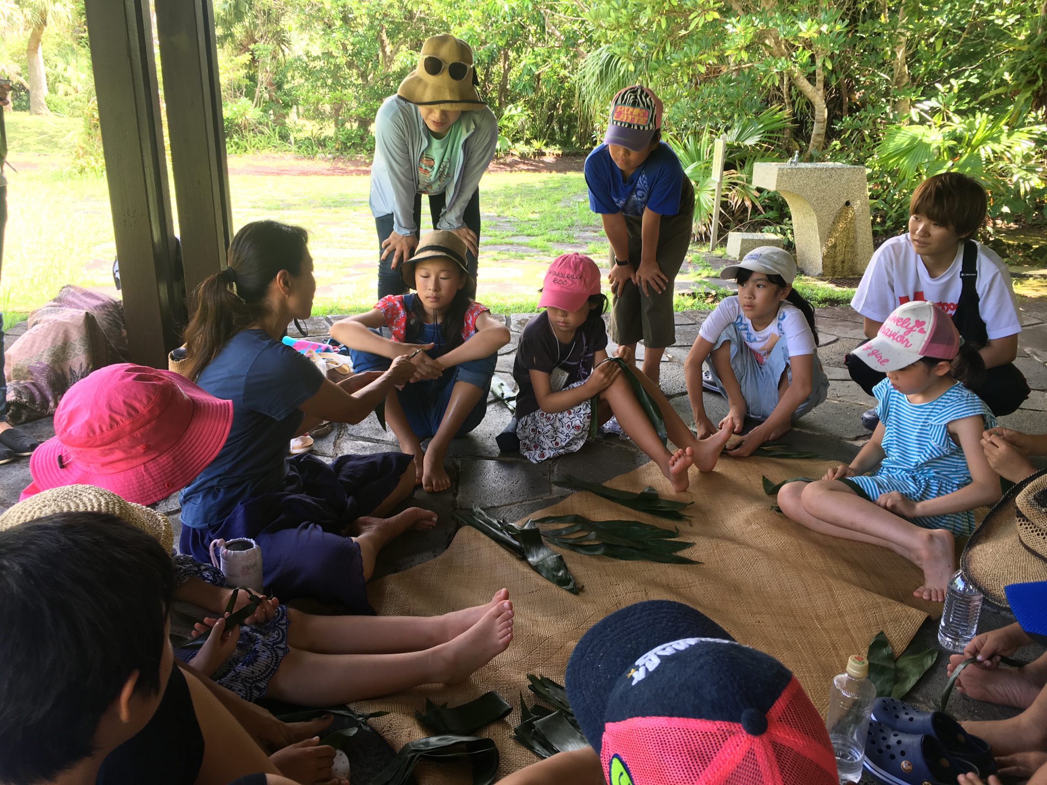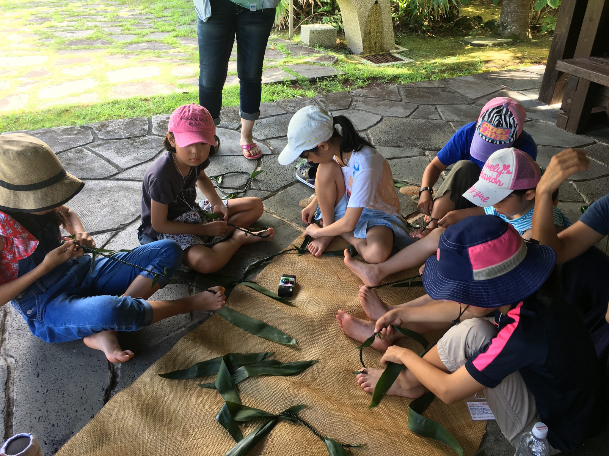八丈島キャンプの一行は、お昼に明日葉そばをいただいた後に植物園へ。毎年お世話になっている栗田さんに、今年もレイメイキングを教えていただいています。八丈島でフラに取り組んでいる地元の子たちも、レイ作り教室を手伝ってくれています。 30℃を超える日が少ない八丈島も、本日は31℃の真夏日。ですが、木陰は風が通り過ごしやすいです。レイを編みながらまったりした時間をすごしています。