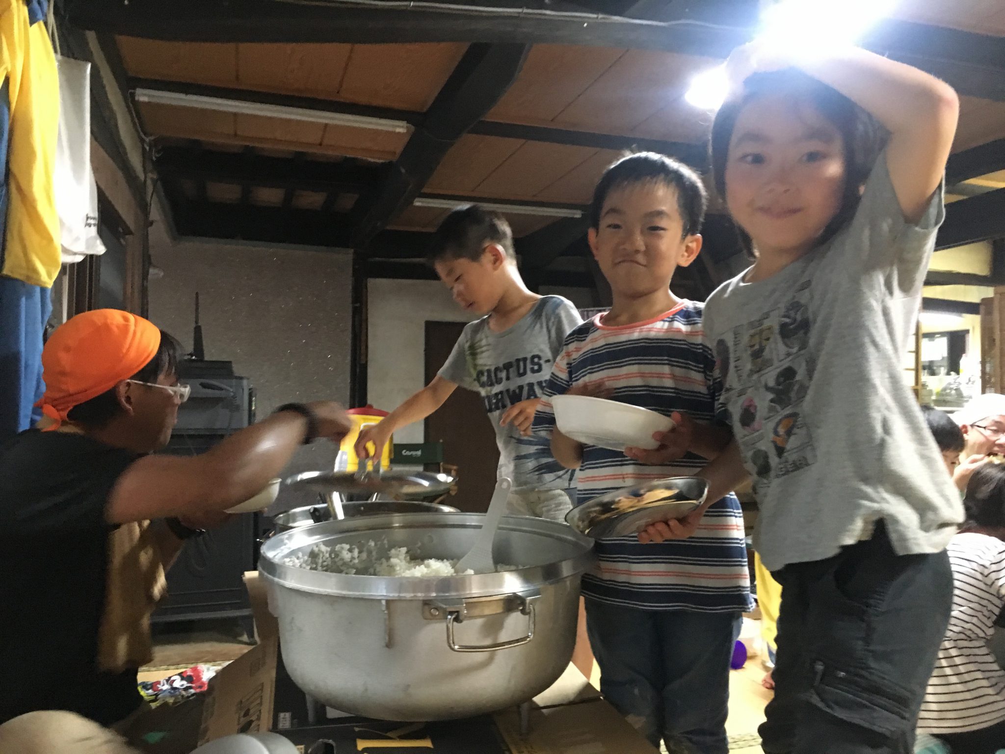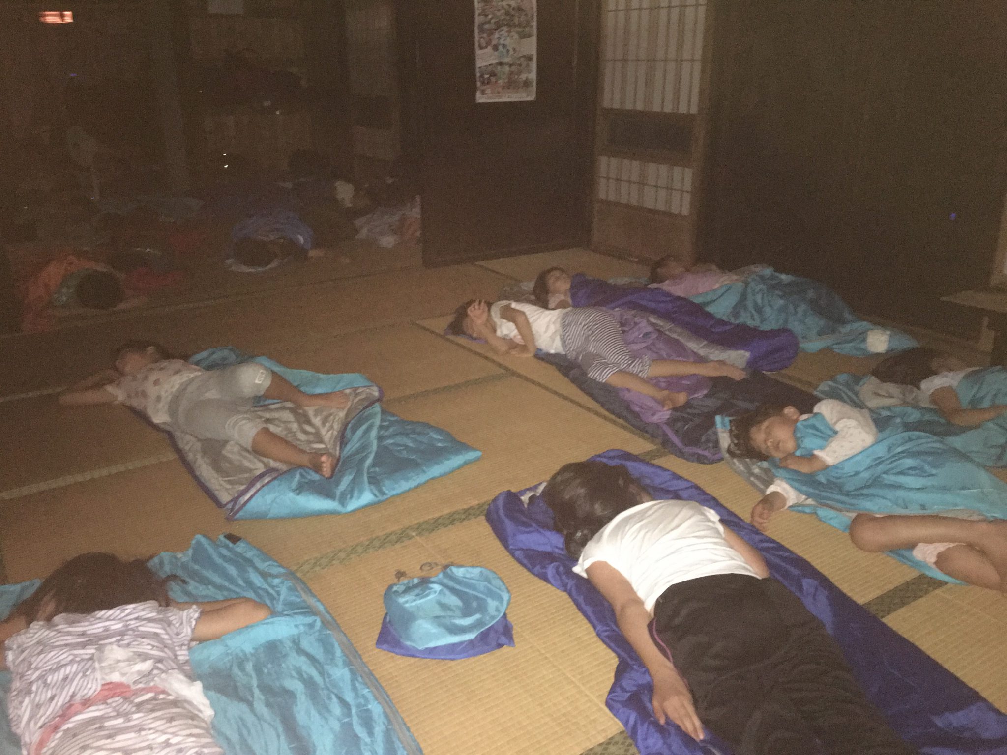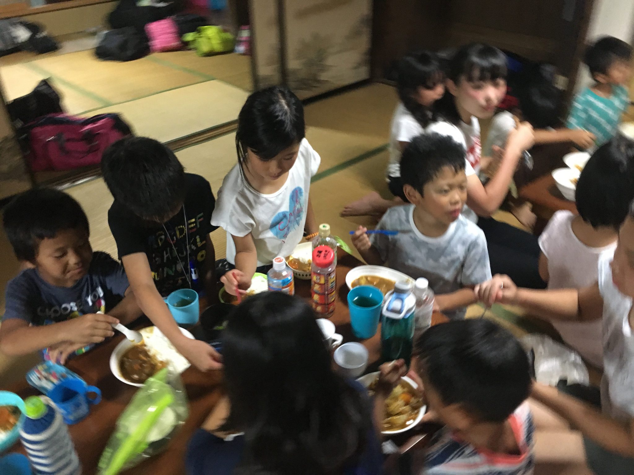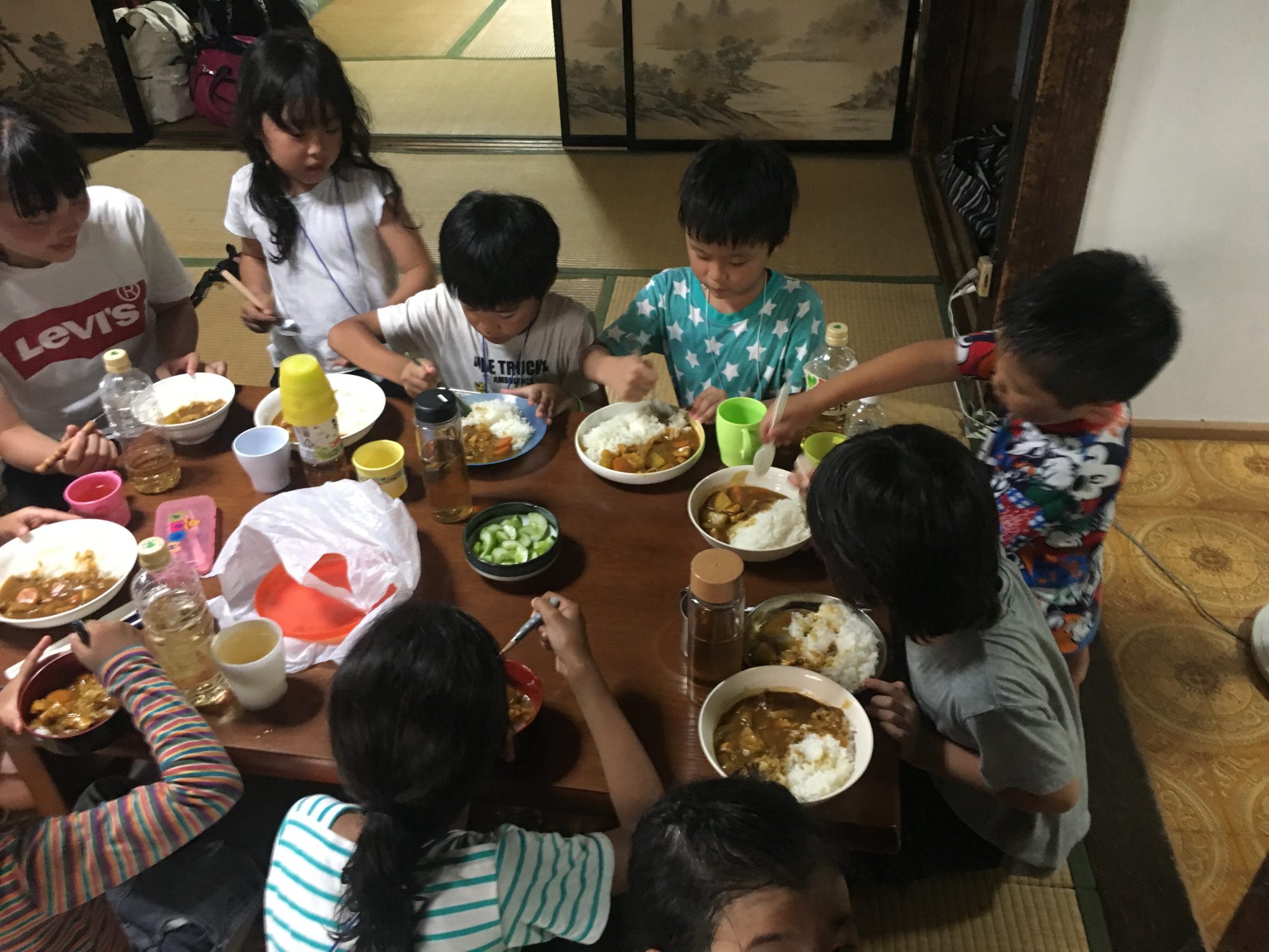 大月山村留学キャンプの一行は、自分たちで野菜を切って作ったカレーライスをガッチリいただき、夜のお楽しみ会、振り返りを行なった後、9時に床につきました。はじめこそ話し声が聞こえたものの、まもなく沈黙…。本日がとても充実していたことが伺えます。今夜は21℃まで下がる模様。涼しく気持ちよく眠れそうです!