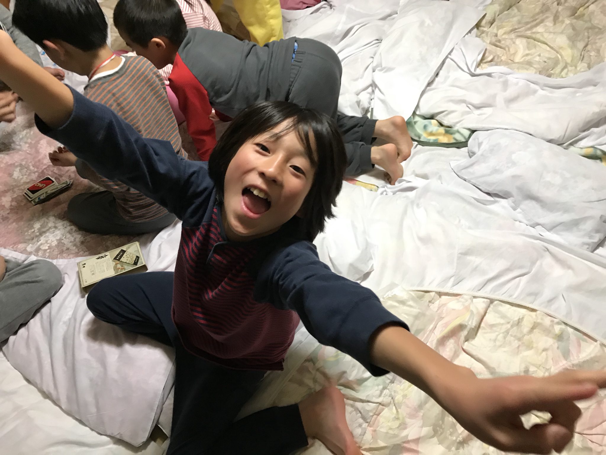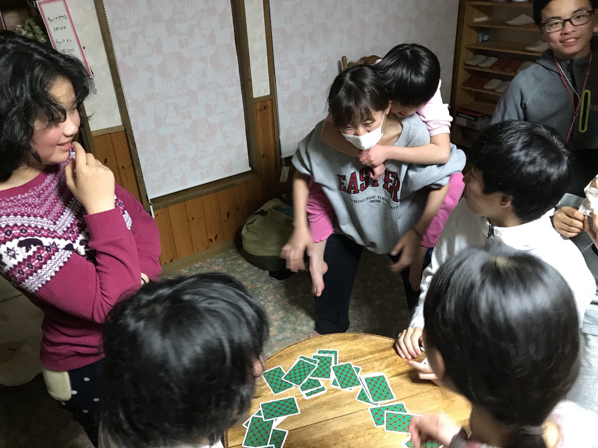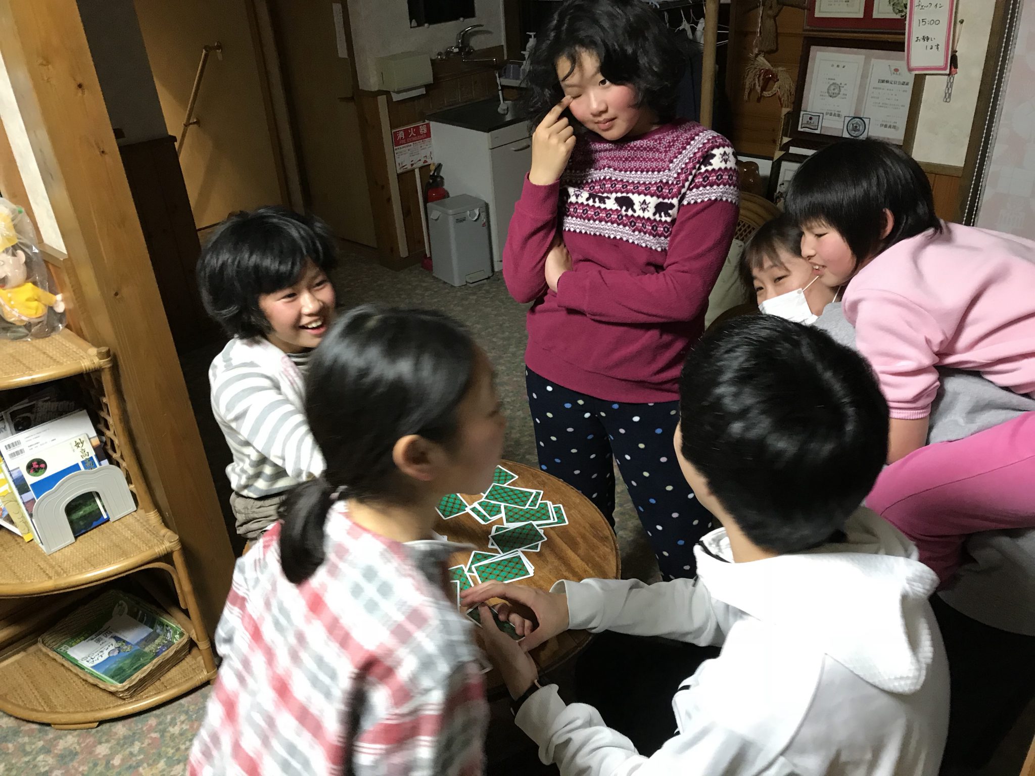 春スキーメンバーは、就寝前の自由時間を過ごしています。 男女仲良く、班も超えて盛り上がっています。 たくさん滑ったのにみんな元気です。