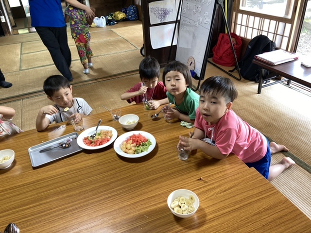 森のようちえんメンバーは、おやつに冷た〜いかき氷を食べました。