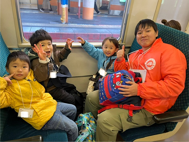 元気いっぱいで電車を乗り継ぎ古民家に移動しています。