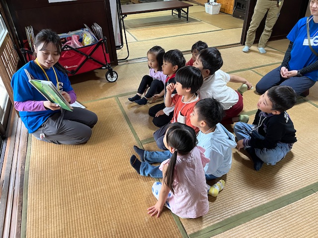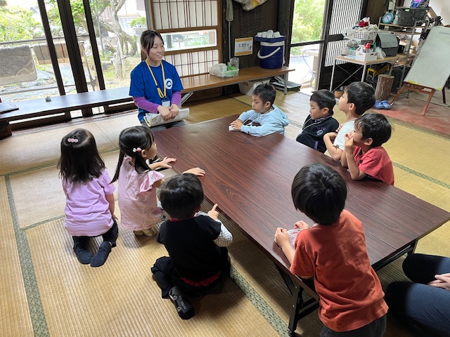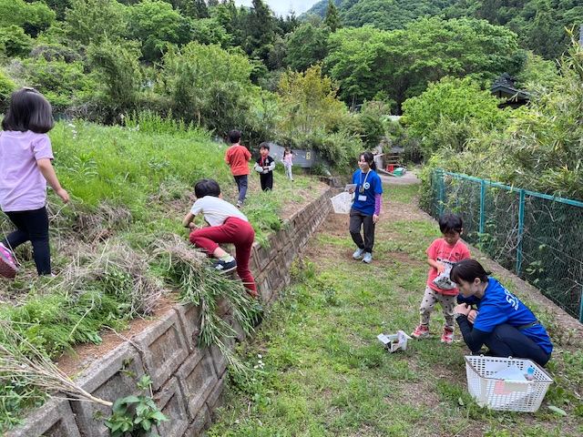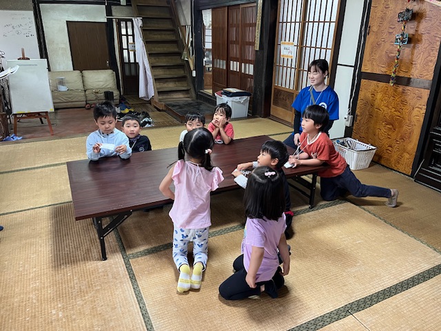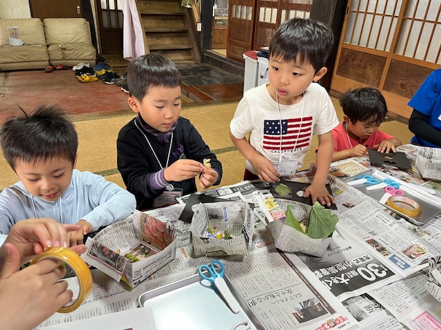 森のようちえんメンバーは、古民家に到着して葉っぱ集めに出かけました。