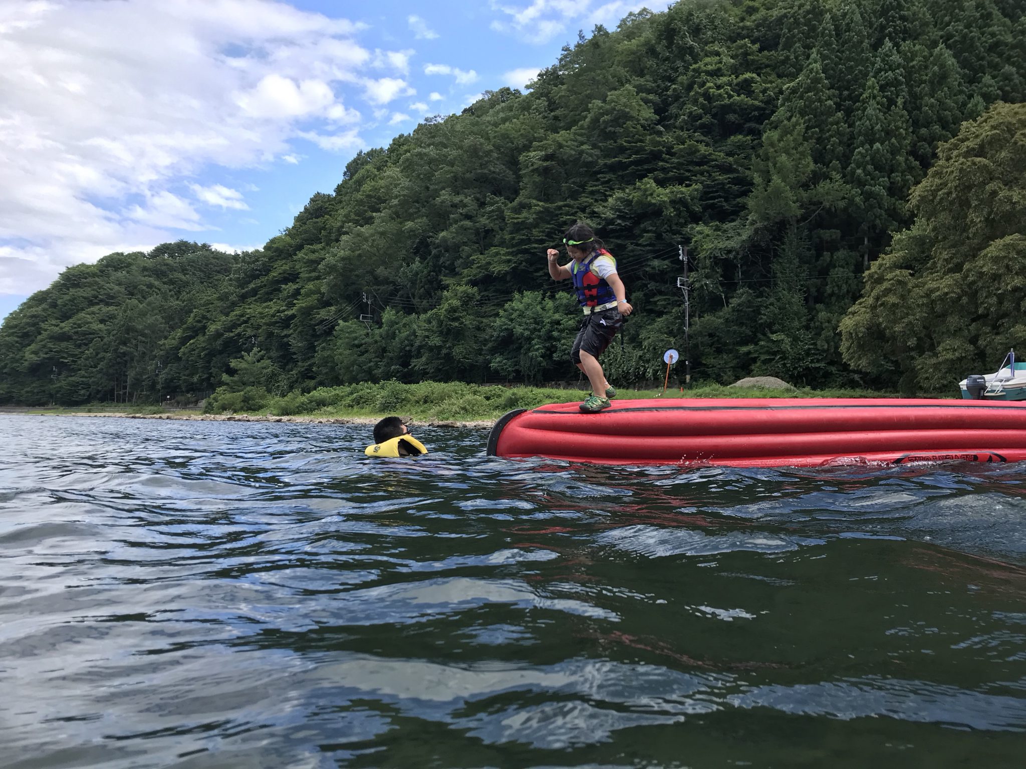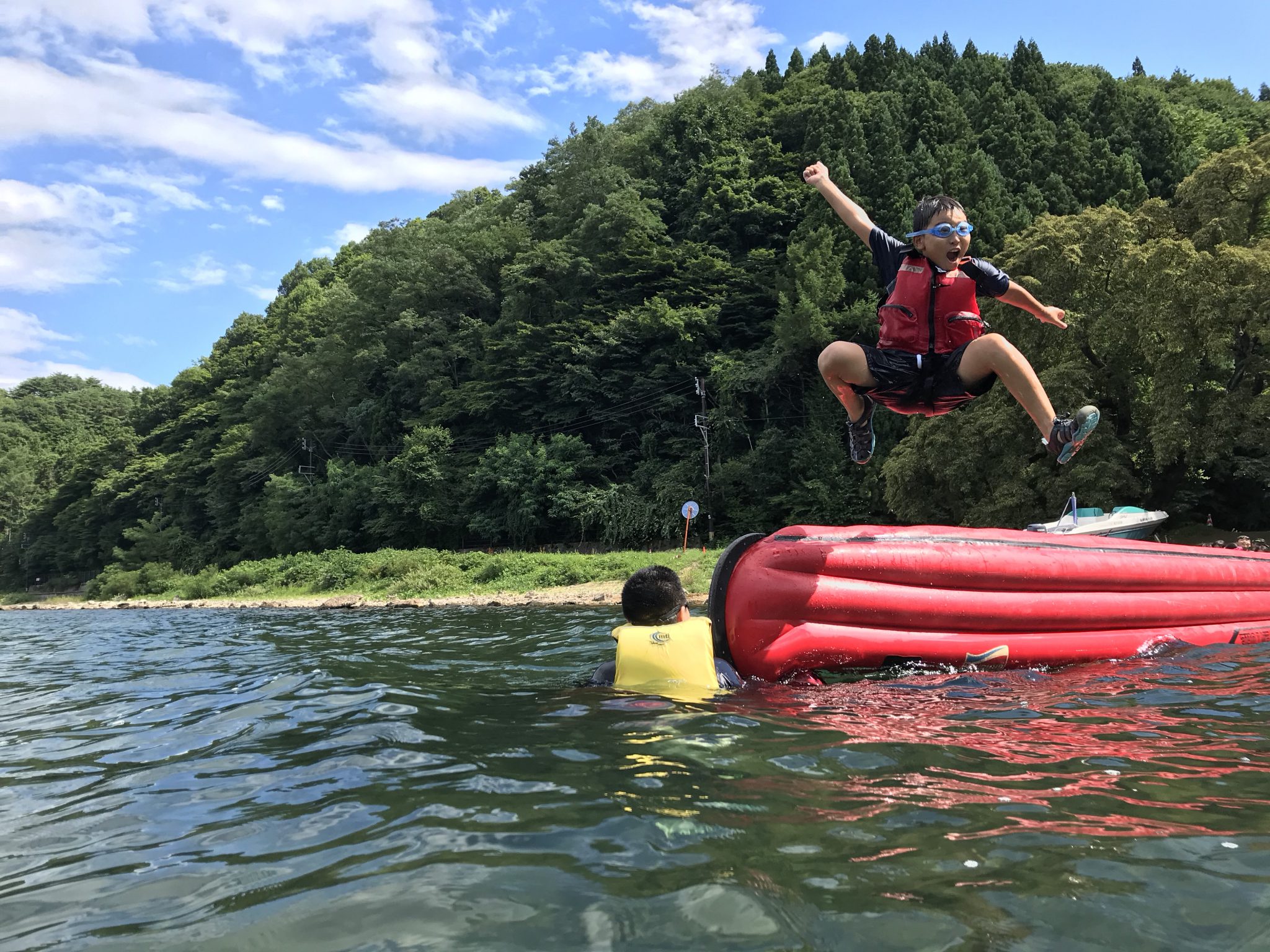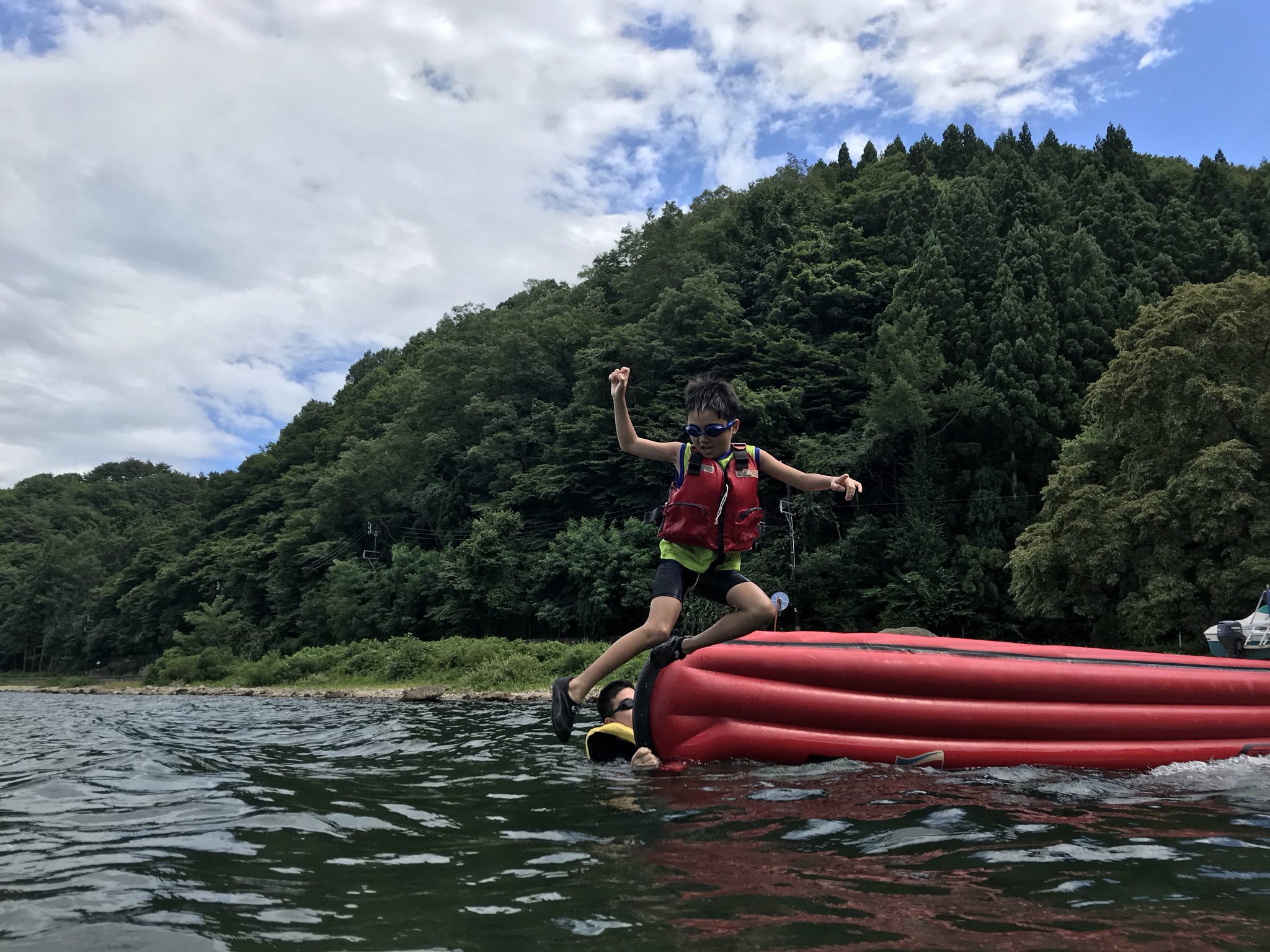 第4クールメンバーは、おにぎりを食べ午後の活動に入りました! 午後の湖遊びは、ボートダイブ! ボートをひっくり返し、桟橋にしてダイブします!