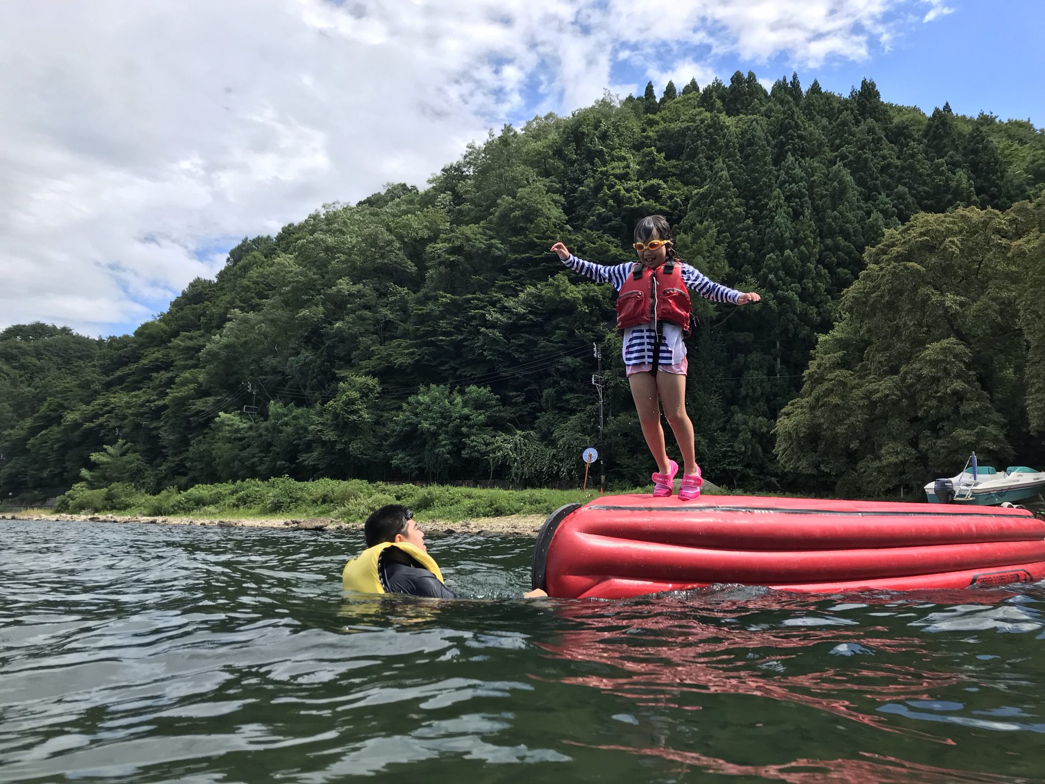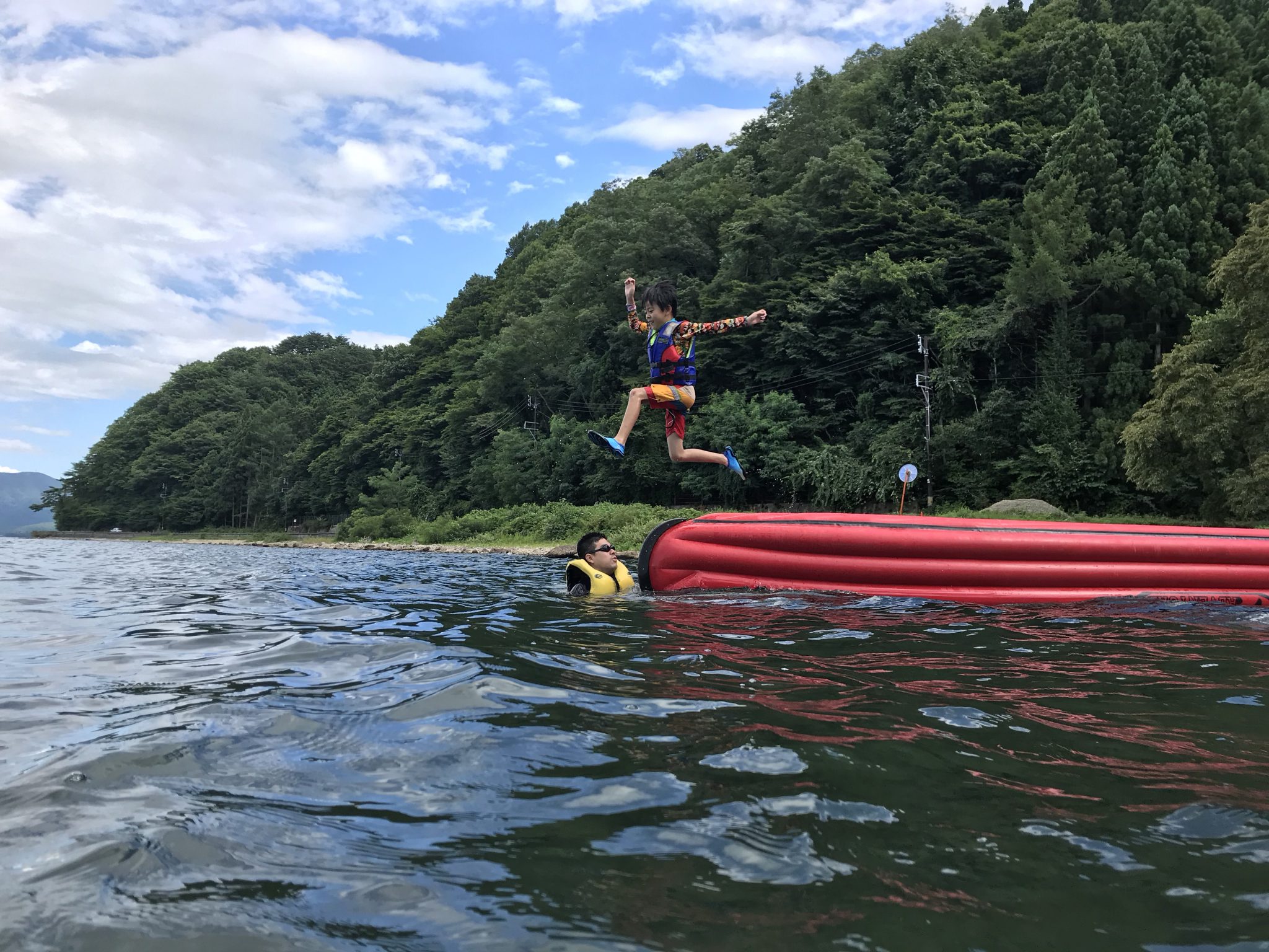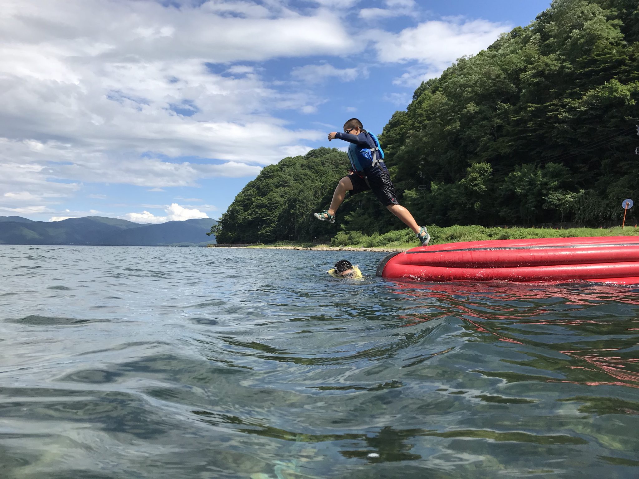 第4クールメンバーは、おにぎりを食べ午後の活動に入りました! 午後の湖遊びは、ボートダイブ! ボートをひっくり返し、桟橋にしてダイブします!