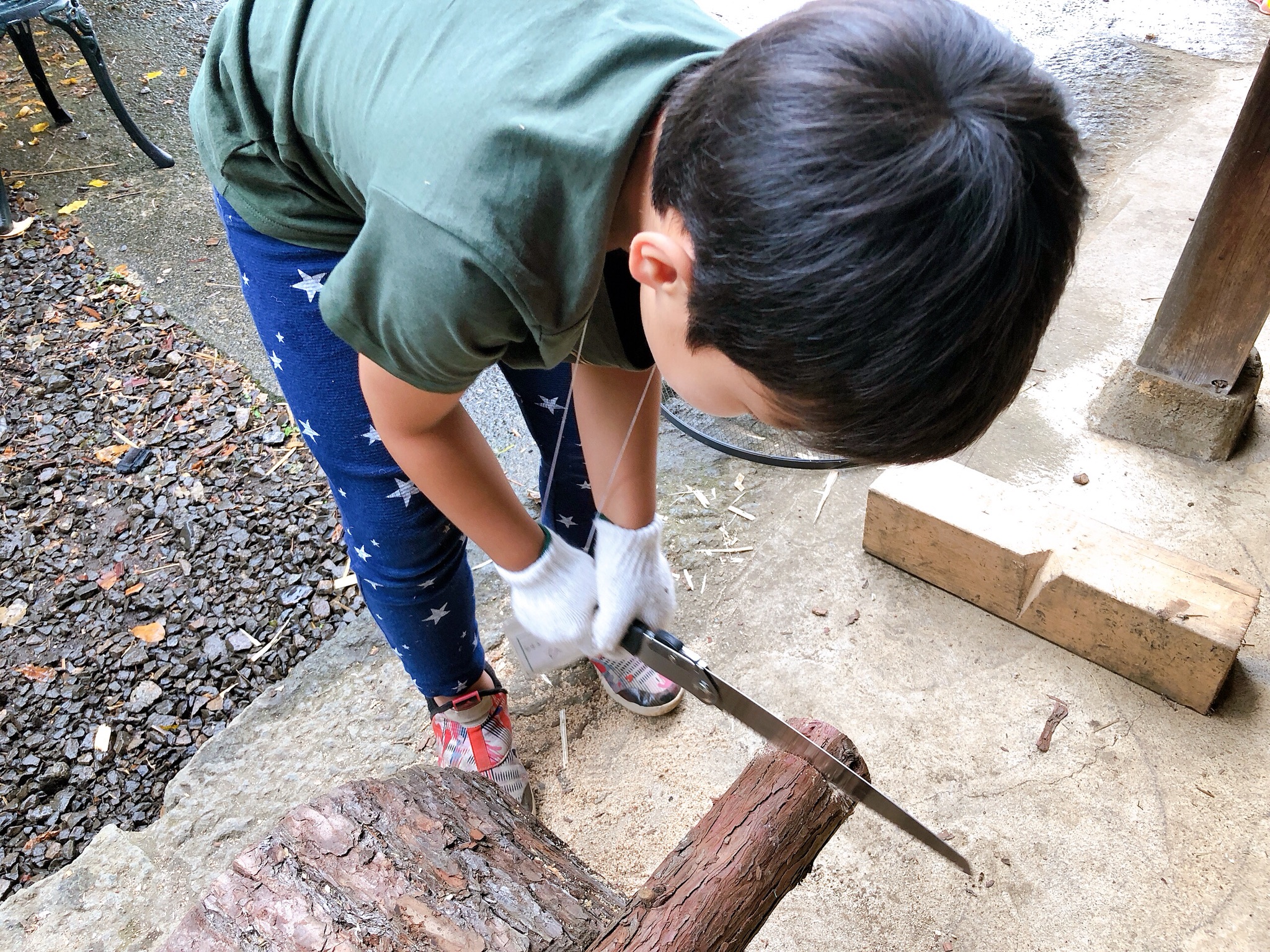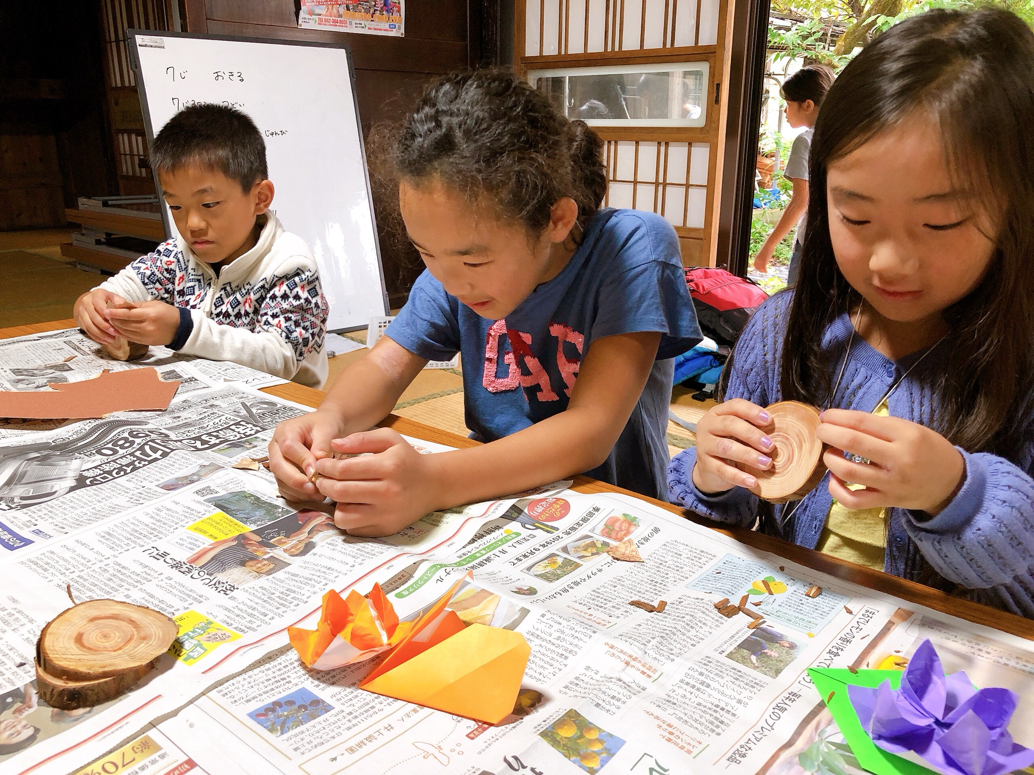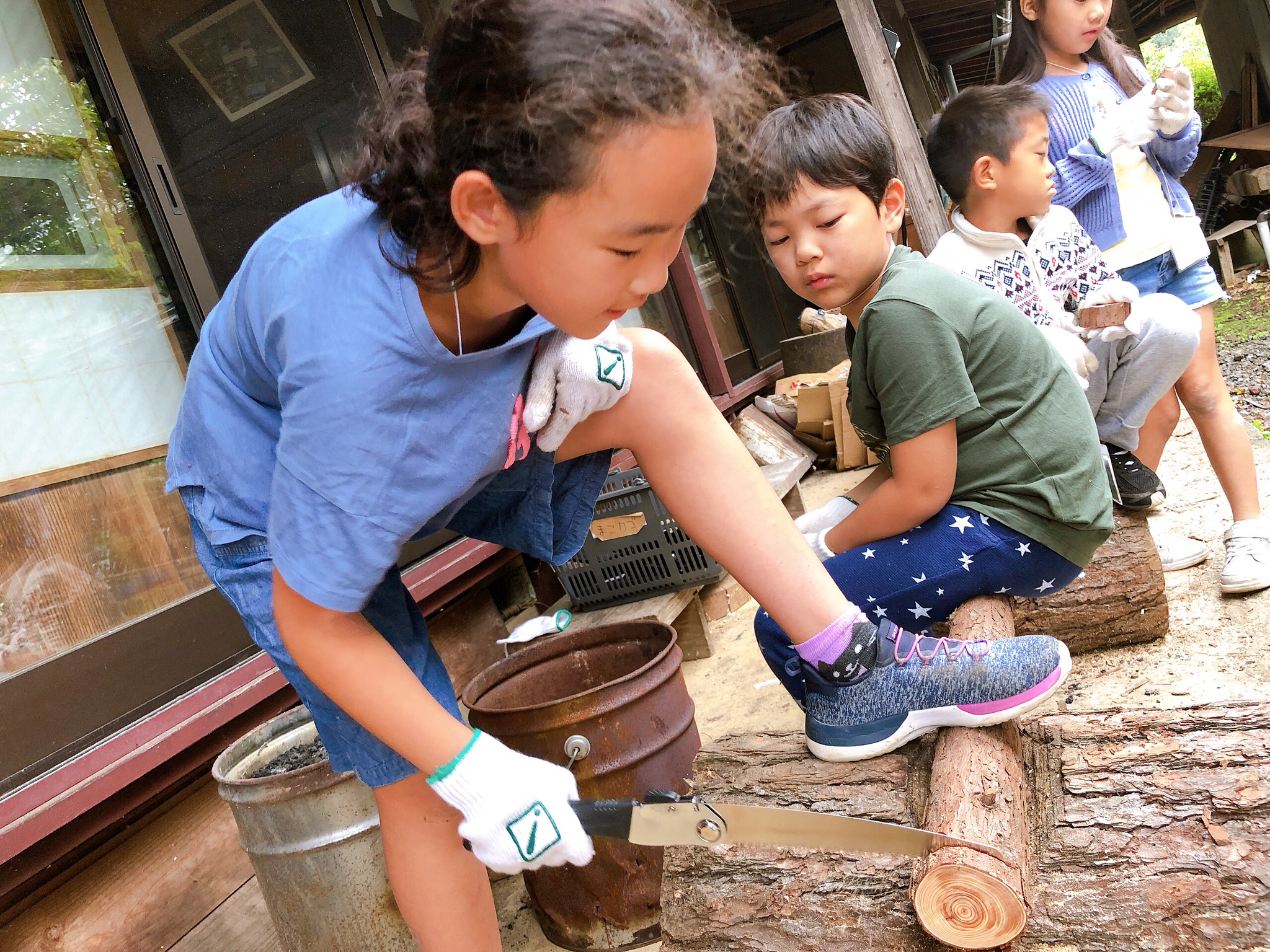 里山から切り出したヒノキを使って工作をしているので、部屋中がとても良い香り!